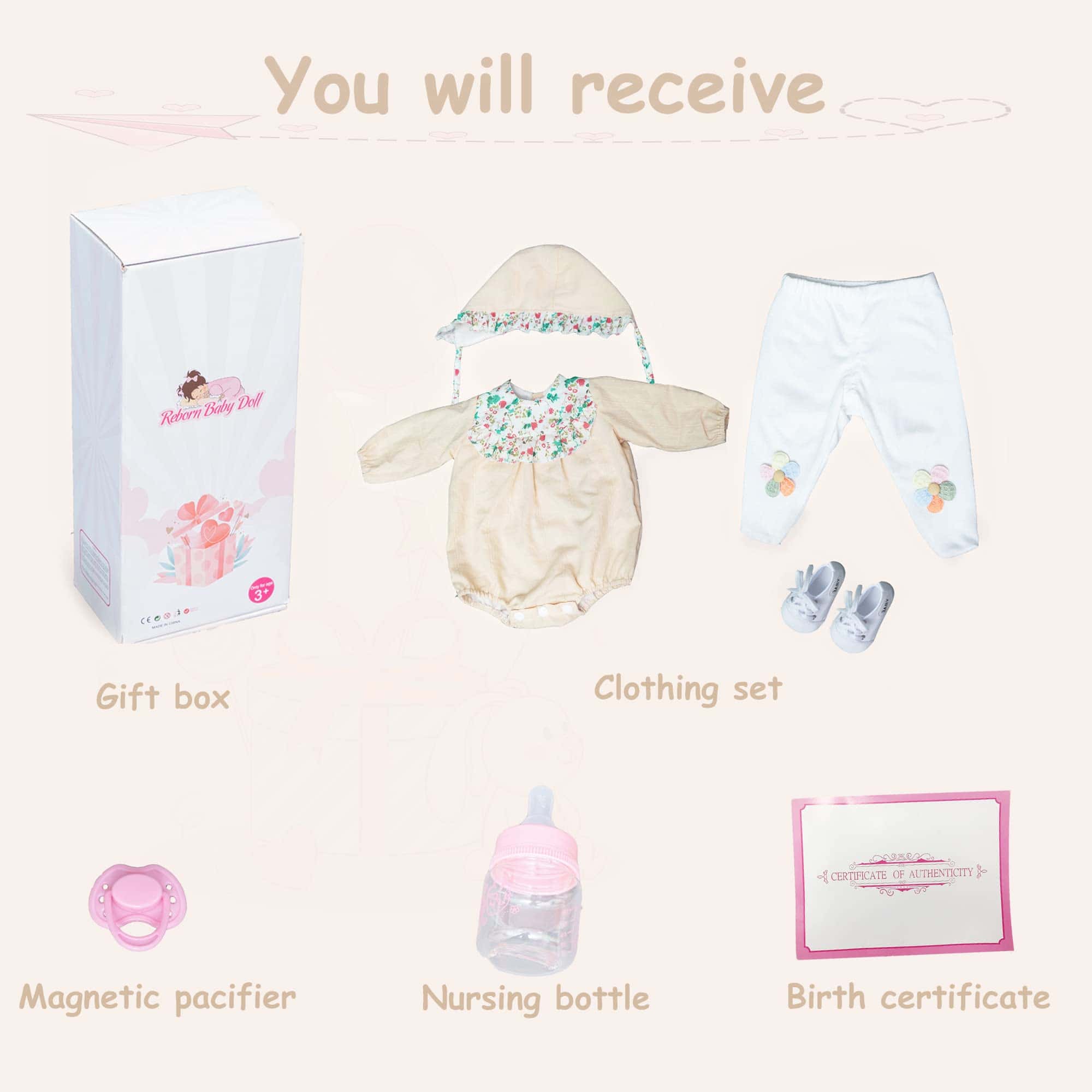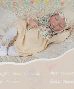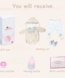1. Muñeca Reborn: Esta es una pequeña recién nacida y necesita más tiempo y amor. La expresión linda y realista hará que tus hijos sientan que están jugando con una amiga. Tiene 18 pulgadas de la cabeza a los pies, con un aspecto realista para que se sienta como un bebé de verdad. Puede vestir ropa de bebé recién nacido o prematuro. 2. Muñeca Reborn con un cuerpo de tela suave y pesado para una sensación de bebé realista. Sus brazos y piernas se pueden mover y posar. 3. Estas muñecas de bebé recién nacido realistas son una elección perfecta para regalos de cumpleaños para niños, regalos de Navidad, actividades preescolares, juegos de roles y juegos de crianza. La muñeca Reborn también es un gran regalo de colección. 4. Esta muñeca tiene cejas pintadas a mano y pestañas pegadas a mano. Su rostro adorable la hace parecer realmente un bebé tan real. Cumpliendo con los requisitos de seguridad de ASTM F963 y EN71 para edades de 3 años en adelante, es seguro para tus hijos. 5. Recibirás muñecas de bebé 1, Juego de ropa como se muestra 1, Chupete magnético 1, Biberón 1, Certificado de nacimiento 1