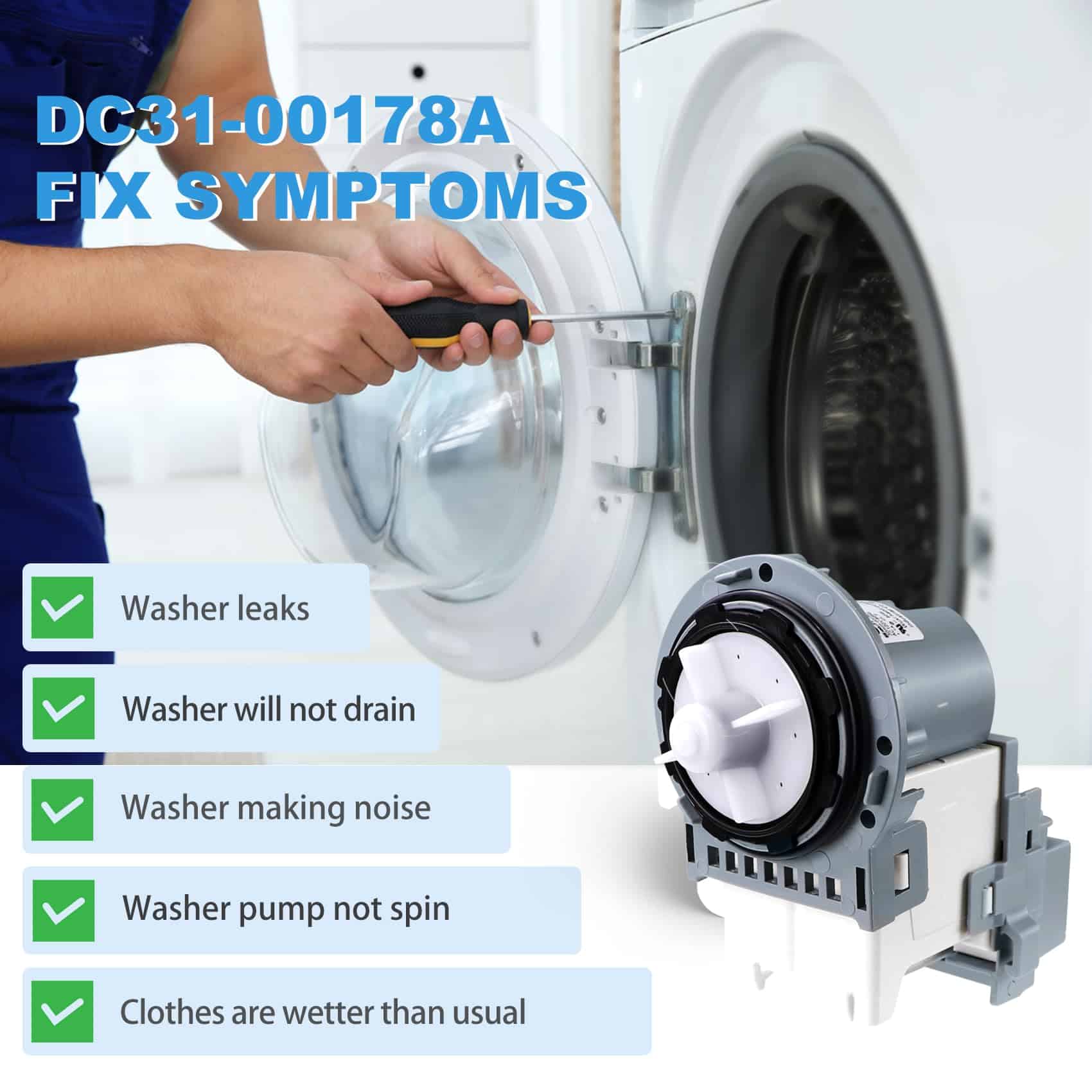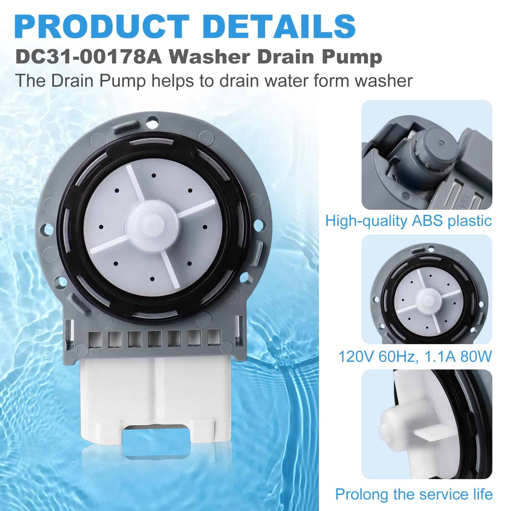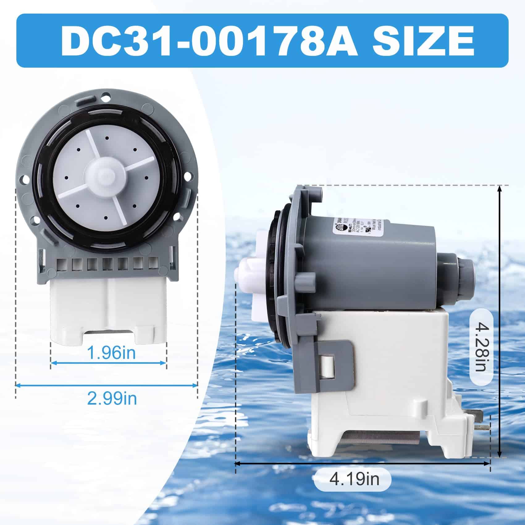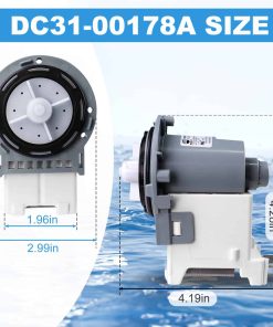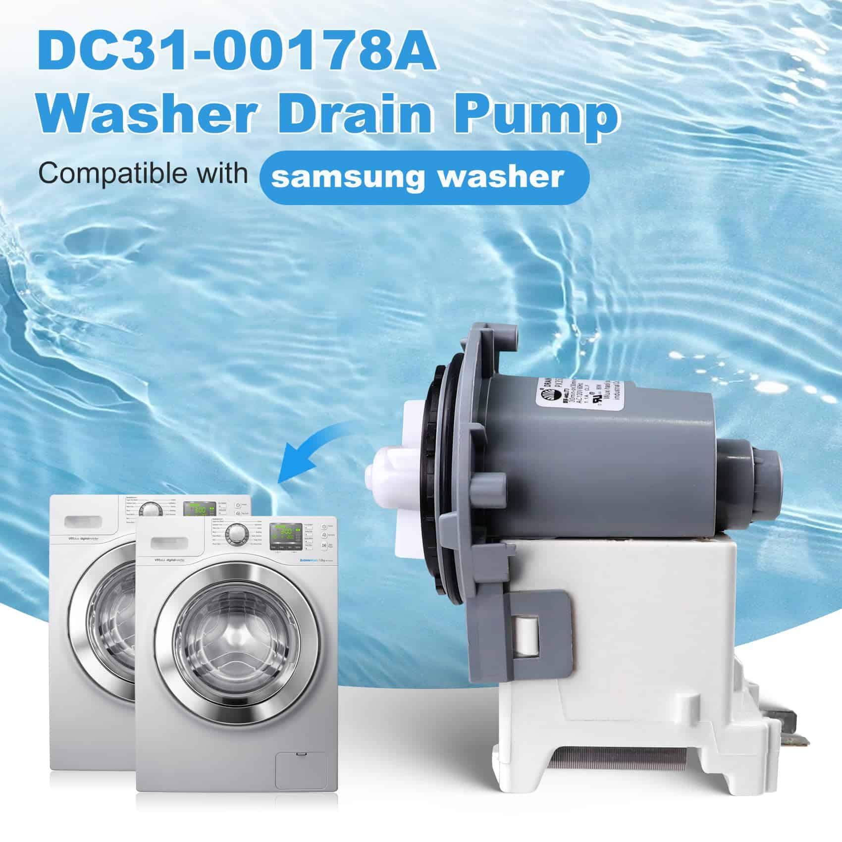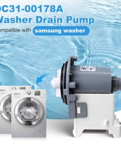 Bomba de Drenaje DC31-00178A Motor AC Pump. Fabricado por un fabricante OEM. AC 120V-60Hz, 80W. La bomba de drenaje DC31-00187A elimina el agua de la lavadora durante la parte de drenaje del ciclo. Paquete incluye: Bomba de Drenaje DC31-00178A x 1. Repara síntomas de fugas, ruidos, falta de giro de la bomba, no drenaje y ropa más húmeda. Reemplaza directamente a las siguientes partes: PX3516-01, DC96-01585L, DC31 00178D, 3989917, AP5916591, PS9605762, EAP9605762, etc. Compatible con algunos modelos de lavadoras de carga frontal y superior Samsung de las series WF2, WF3, WF4, WF5, WA4, WA5.