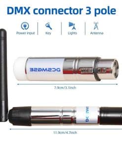 Especificaciones: 1. 2.4G DMX512 inalámbrico R/T 2. Voltaje de trabajo: AC100-240V 3. Sensibilidad de recepción: -94dBm 4. Tasa máxima de potencia de transmisión: 20dBm 5. Conector DMX: macho de 3 pines 6. Distancia de comunicación: 400M (distancia visible) 7. Sección de frecuencia de trabajo: 2.4G ISM, 126 canales. Sección de frecuencia 8. 7 grupos de códigos ID configurables, el usuario puede utilizar 7 redes inalámbricas individuales sin interferencias. 9. Material: aleación de zinc + plástico 10. Tamaño del artículo: L3.2 W0.7 H0.7 pulgadas 11. Peso del paquete: 6.3 oz Establecimiento de la Comunicación: 1. Encienda primero la placa receptora inalámbrica DMX512 y luego siga encendiendo la placa transmisora. 2. Presione el botón Key para configurar el mismo valor de ID de la placa transmitida y la placa recibida. Utilice un valor de ID diferente si necesita usar más de 1 grupo de universos inalámbricos al mismo tiempo en el mismo lugar. 3. El LED rojo parpadea cuando el transmisor transmite datos DMX por sección de frecuencia no interferida, luego el receptor cambia de sección de frecuencia comunicada. El LED verde parpadea hasta que recibe el mismo valor de ID, cuanto más datos DMX, más rápido parpadea el LED. 4. La comunicación se estableció correctamente. Lista de empaque: 3 x Receptor inalámbrico DMX 1 x Transmisor inalámbrico DMX 4 x Adaptador 1 x Especificación