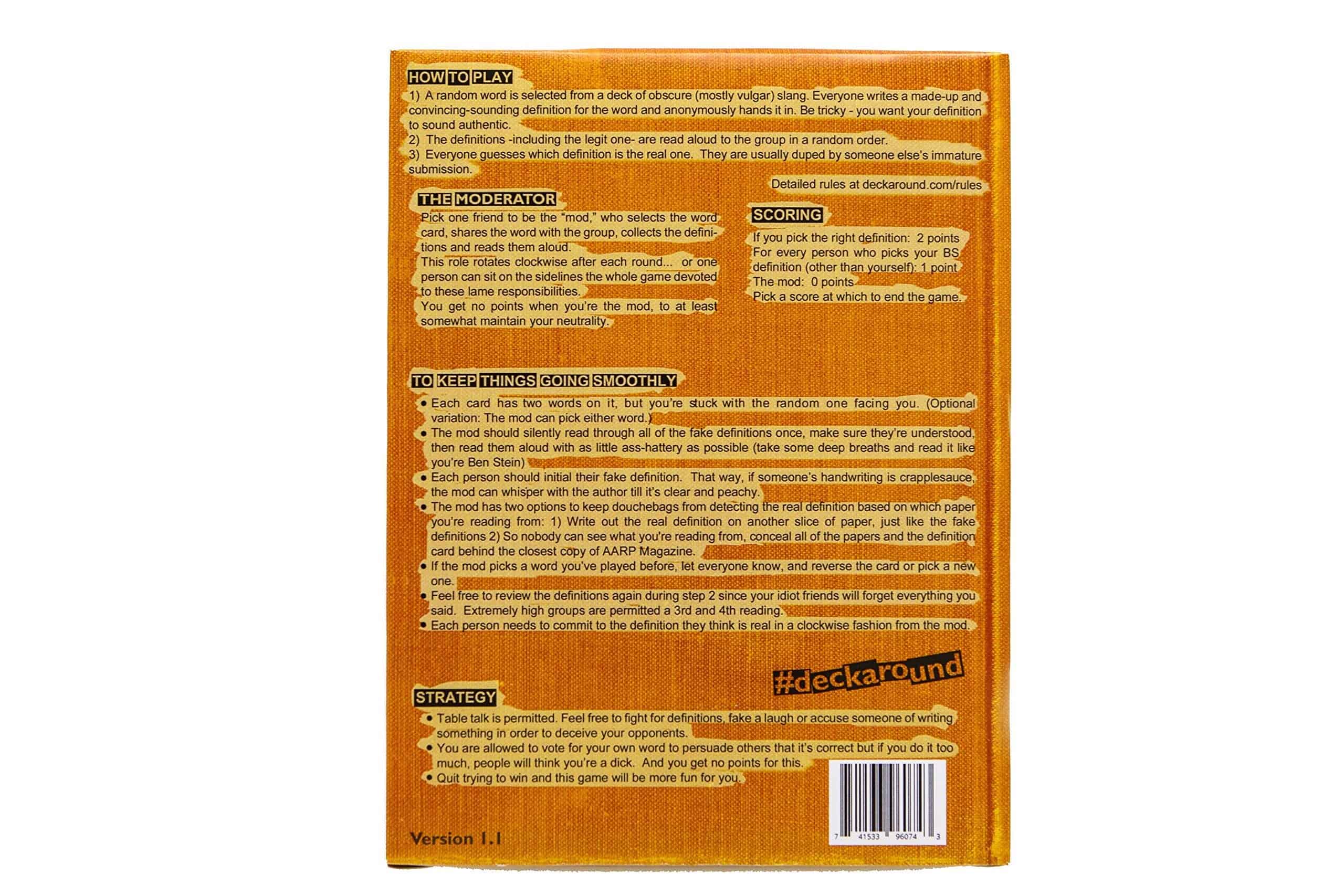 ¿Alguna vez te has preguntado por qué no hay juegos para adultos? ¡DEJA DE PREGUNTAR Y AGREGA AL CARRITO! ¿QUÉ DIABLOS ES ESTO? Deck Around es increíblemente divertido y es la nueva obsesión de tus noches de juego si estás harto de juegos de fiesta como Cards Against Humanity y Exploding Kittens. El divertido diseño indie galardonado se basa en horas de pruebas de juegos de fiesta para asegurarte de que te rías hasta llorar. Esto no es solo valor de choque – Deck Around es genuinamente divertido cada vez que juegas. CÓMO FUNCIONA La gente llama a Deck Around «una mezcla entre Balderdash y Urban Dictionary» similar a juegos como Cards Against Humanity. Es fácil. En cada ronda, tus amigos envían de forma anónima ideas horribles de definición de una palabra sucia de jerga en un pedazo de papel secreto. Luego, adivinas cuál es el verdadero significado. UNA RONDA DE EJEMPLO Intenta adivinar la DEFINICIÓN REAL de «CAMINATA DE CARNE». «alejarse de un grupo para poder tirarse un pedo» «pasear tranquilamente con los genitales masculinos expuestos» «salir del trabajo para comprar el almuerzo en un puesto de comida ambulante de perritos calientes» ¿Cuál es la respuesta? ¡Tendrás que hacer clic en AGREGAR AL CARRITO para averiguarlo! (Sobrevivirás sin saberlo.) QUÉ INCLUYE Cada vez que abras la caja, se te recordará que Deck Around está hecho a mano en los Estados Unidos. Nuestro proceso de construcción indie significa que no hay adornos ni piezas de juego de plástico de China, solo un gran juego de fiesta. El set incluye 106 rondas de juego en un mazo estándar de cartas de alta calidad, 4 cuadernos de respuestas (100 hojas cada uno) y 4 mini lápices en una caja envuelta con película retráctil. PARA QUIÉN ES PERFECTO Deck Around es el mejor juego de fiesta para: > estudiantes universitarios durante el regreso a clases > familias con un sentido del humor un poco sucio > noches informales de juegos con amigos > grupos de juego que necesitan un descanso de juegos largos y estratégicos serios > romper el hielo en una cena o pre-fiesta > personas a las que les gustan juegos como Cards Against Humanity, Exploding Kittens, Joking Hazard y Watch Ya Mouth ¿Te gusta lo que ves? ¡Haz clic en agregar al carrito!