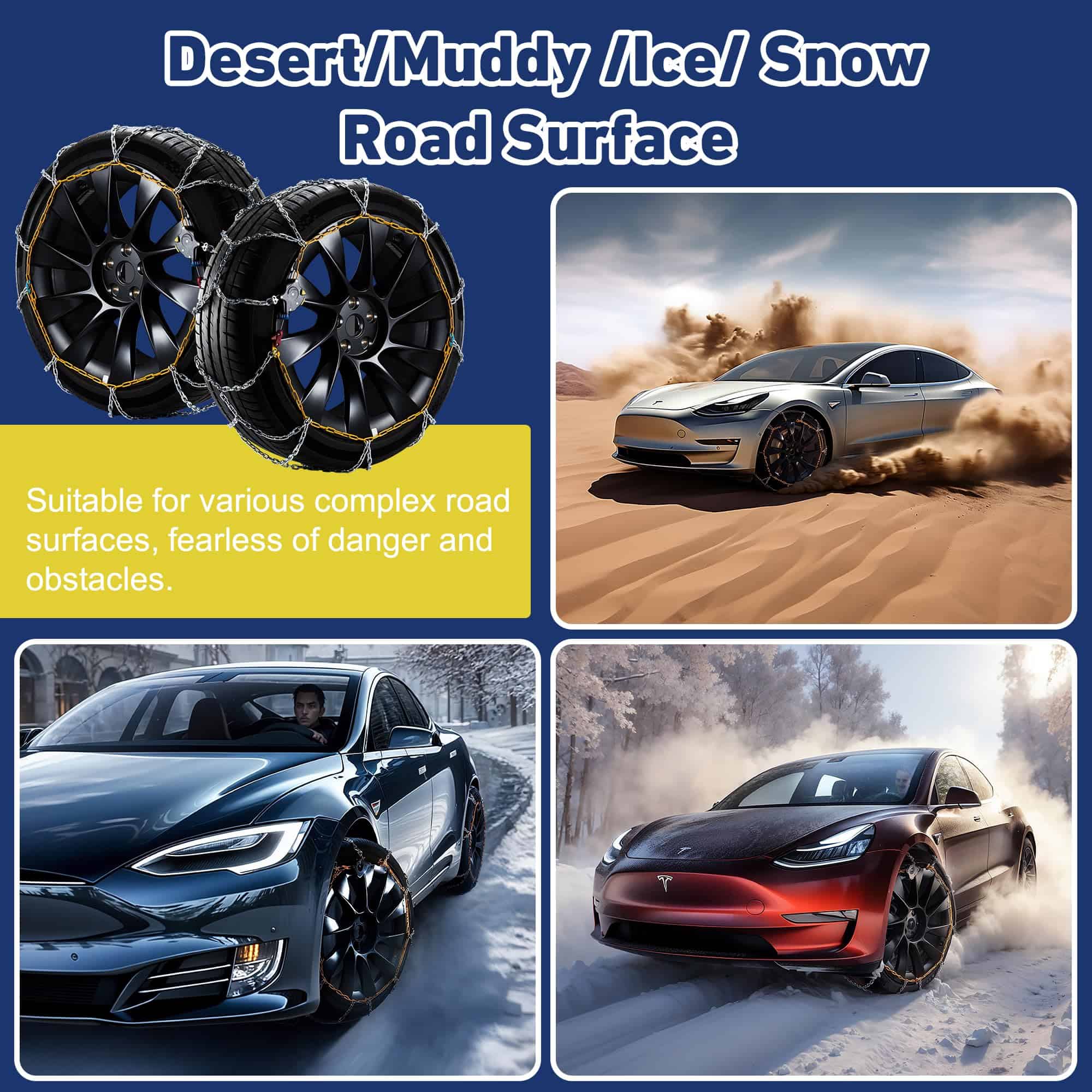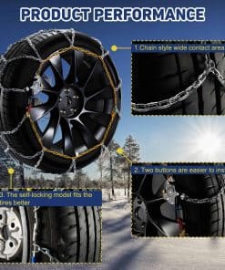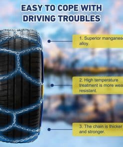 Accesorios esenciales de invierno específicamente diseñados, estas cadenas son la solución ideal en diversos problemas meteorológicos. Ya sea hielo traicionero, fuertes nevadas o terrenos embarrados, te cubrirán. Y la mejor parte Con un diseño súper fácil de usar, puedes lograr una instalación rápida en solo 1 minuto, sin más dificultades en el frío. ¡Dale un clic y listo! Las cadenas de nieve para neumáticos son fáciles de instalar. Simplemente estira la cadena sobre el neumático y asegura el eslabón más ajustado usando los ganchos de conexión rápida. ¿Difícil encontrar el regalo adecuado? Estas cadenas de nieve son una elección perfecta. Hechas a medida como regalos para hombres, especialmente conductores de camiones y entusiastas de SUV. En invierno severo, transforman un viaje peligroso en un trayecto suave. Sorprende a tus seres queridos con este regalo práctico que dice que te preocupas por su experiencia al volante. En invierno, la seguridad del coche es crucial. Nuestras cadenas de neumáticos Auto-Trac, un elemento imprescindible en tu kit de supervivencia invernal para el coche, están hechas de materiales fuertes y duraderos. Como accesorios clave para invierno y artículos esenciales para el coche, ofrecen una excelente tracción en carreteras con hielo. Compatibilidad de tamaño de neumático: 255/70r15, 265/70r15, 245/70r16, 235/65r17, 255/60r17, 235/60r18, 235/65r18, 255/55r18, 235/55r19, 235/60r19, 245/50r19, 255/50r19, 235/50r20, 255/40r20, 255/45r20, 275/40r20, 255/35r21, 275/35r21.