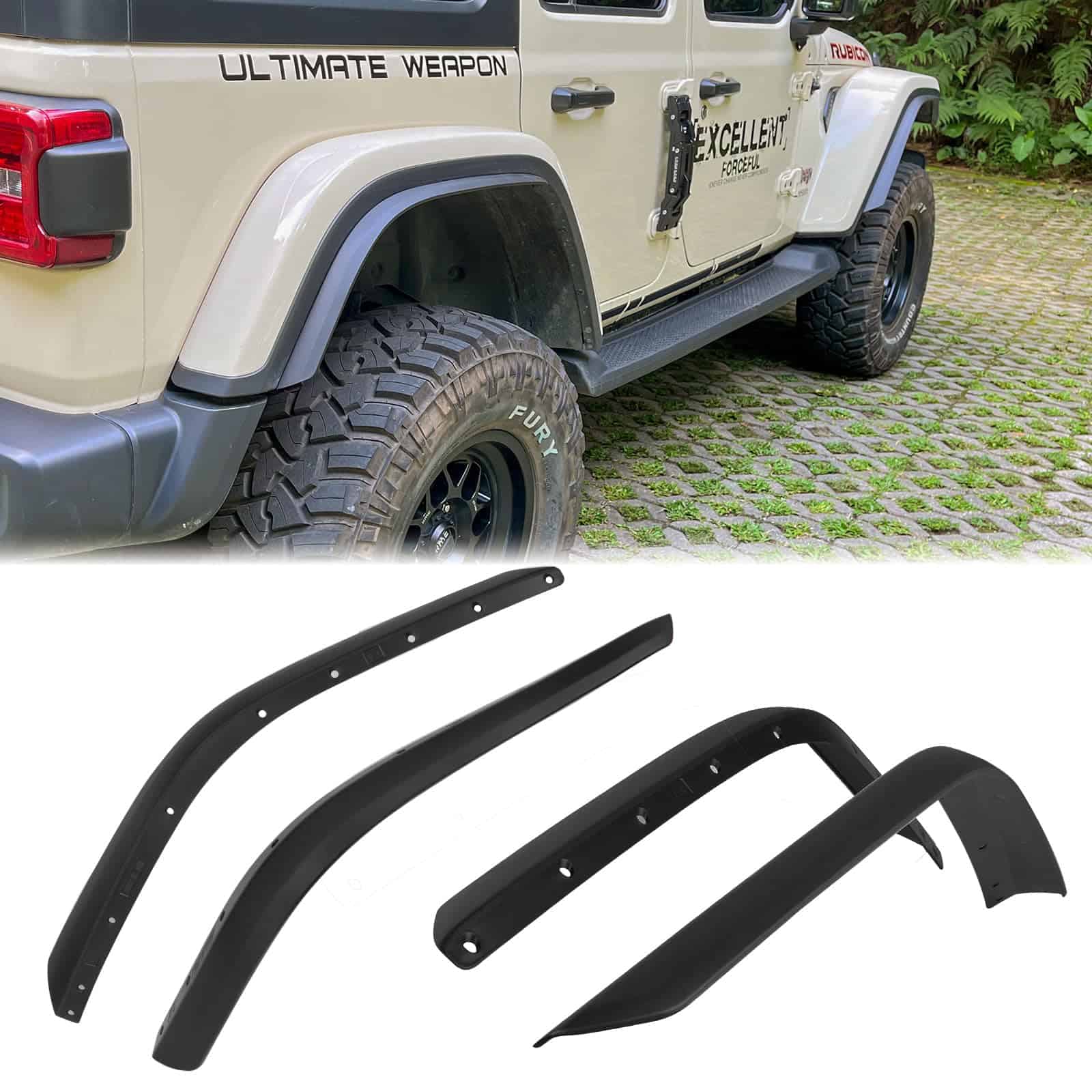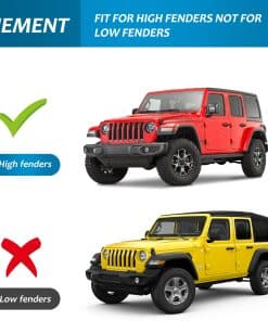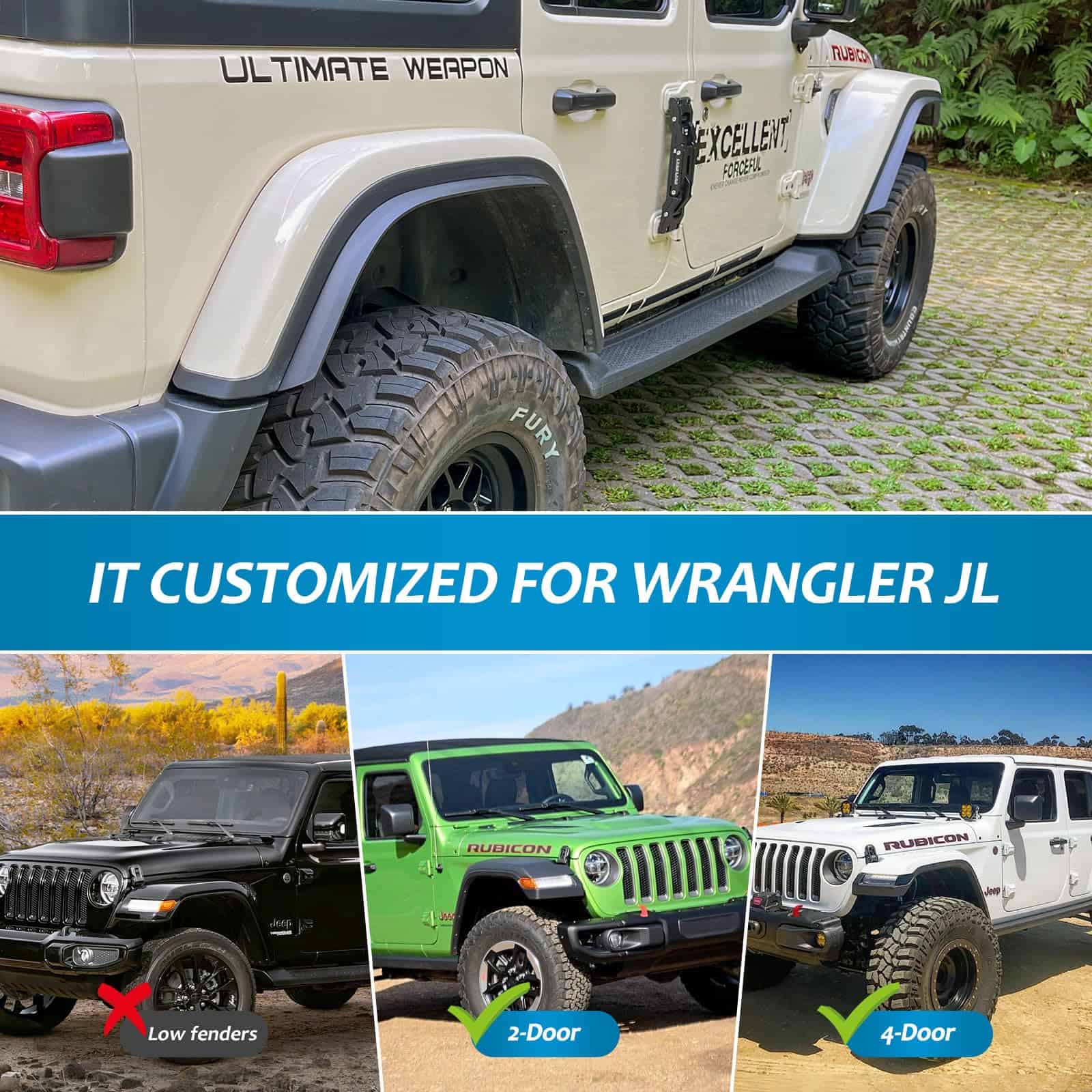 1. AJUSTE PERFECTO – Compatible con Jeep Wrangler JL 2018-2024, incluye 2 defensas delanteras y 2 defensas laterales para el conductor. (Un total de 4).