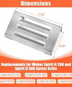 El deflector de calor QuliMetal 67060 está diseñado específicamente para las parrillas Weber Spirit II 200 y Spirit II 300 Series, modelos a partir de 2017. Fabricado en acero inoxidable de alta calidad, este deflector de calor no magnético ofrece una resistencia excepcional a la corrosión y al calor. ¡Despídase de las placas de calor para parrilla que se desgastan fácilmente y opte por un producto más duradero y fácil de limpiar! Los 67060 deflectores de calor aseguran que las gotas no vaporizadas por las barras saborizantes no terminen en los quemadores, evitando posibles problemas de deterioro en su parrilla. En caso de cualquier inconveniente, nuestro equipo de atención al cliente está listo para ayudarlo. Verifique siempre el tamaño y modelo de su parrilla antes de comprar para garantizar un ajuste perfecto. ¡Disfrute de la cocina al aire libre con tranquilidad gracias a los deflectores de calor QuliMetal 67060 para parrillas Weber Spirit!