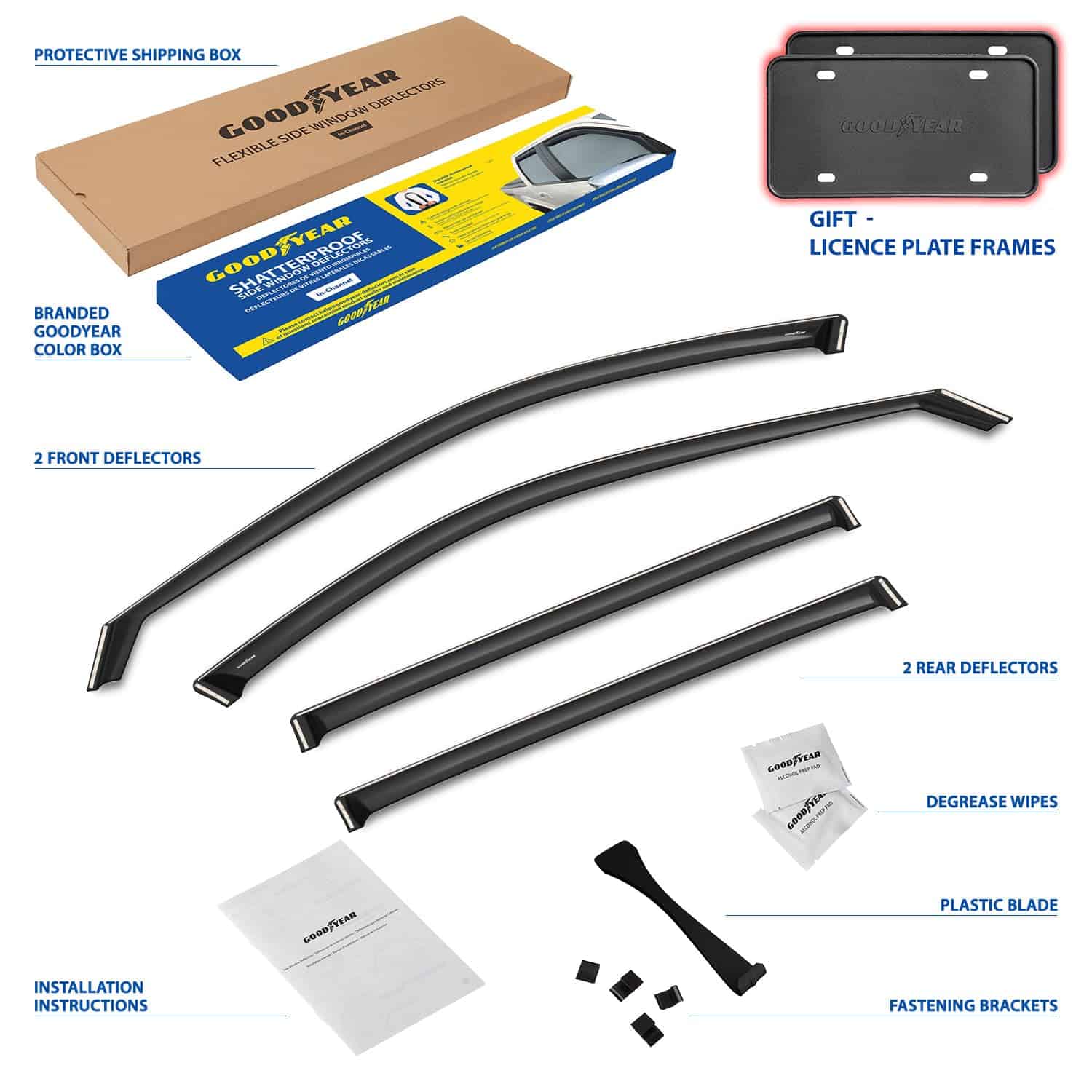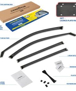 5. Obtenga un regalo perfecto en este momento: se incluyen 2 marcos de matrícula de Goodyear en el set. No se necesitan herramientas, simplemente despegue y pegue estos visores de ventanas para la lluvia. Incluimos toallitas desengrasantes para que el trabajo sea rápido. Este deflector de ventilación es un gran regalo de cumpleaños o regalo de vacaciones para cualquier persona a la que le guste conducir con la ventana abajo. Los deflectores de ventanas laterales vienen en una caja de color Goodyear protegida por una caja de envío marrón.