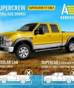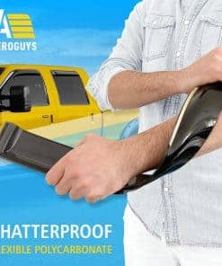 Nuestros visores de ventanas AEROGUYS no solo añaden a la apariencia de tu vehículo, sino que también tienen un propósito mucho más práctico. Son uno de los accesorios para automóviles más subestimados, pero una vez que los hayas usado, sabes qué diferencia hacen en tu paseo. Nuestros visores de ventanas están fabricados con policarbonato flexible y duradero. Los visores de ventanas AEROGUYS están especialmente diseñados utilizando tecnología de vanguardia para desviar la lluvia, el viento, el sol, la nieve y mantener tu auto fresco. El set de 4 piezas viene con cinta 3M fácil de instalar y manual de instalación. CARACTERÍSTICAS DEL PRODUCTO: – Condición: 100% Nuevo; – Ajuste personalizado: para Ford F-250 Super Duty 1999-2016 SuperCrew, para Ford F-350 Super Duty 1999-2016 SuperCrew, para Ford F-450 Super Duty 1999-2016 SuperCrew, para Ford F-550 Super Duty 1999-2016 SuperCrew; – Paquete incluye: 4 visores deflectores de ventana (2 delanteros/2 traseros), almohadilla de preparación, manual de instalación; – Color: Tintado negro ahumado; – Material: Policarbonato duradero de alta calidad. Características: – Aire fresco incluso cuando llueve; – Reduce el deslumbramiento del sol; – Le da a tu vehículo un aspecto mejorado y fresco; – Amigable con el lavado de autos; – Fácil instalación en canal; No se requiere taladrar; – Los visores están asegurados con cinta 3M. Tenemos visores para la mayoría de los modelos de automóviles. Elige la marca y modelo de tu auto y el tipo de visor que deseas. ¡Ofrecemos una garantía del 100% de satisfacción! ¡Ordénalos ahora y obtén nuestros deflectores de lluvia para ventanas de inmediato!
