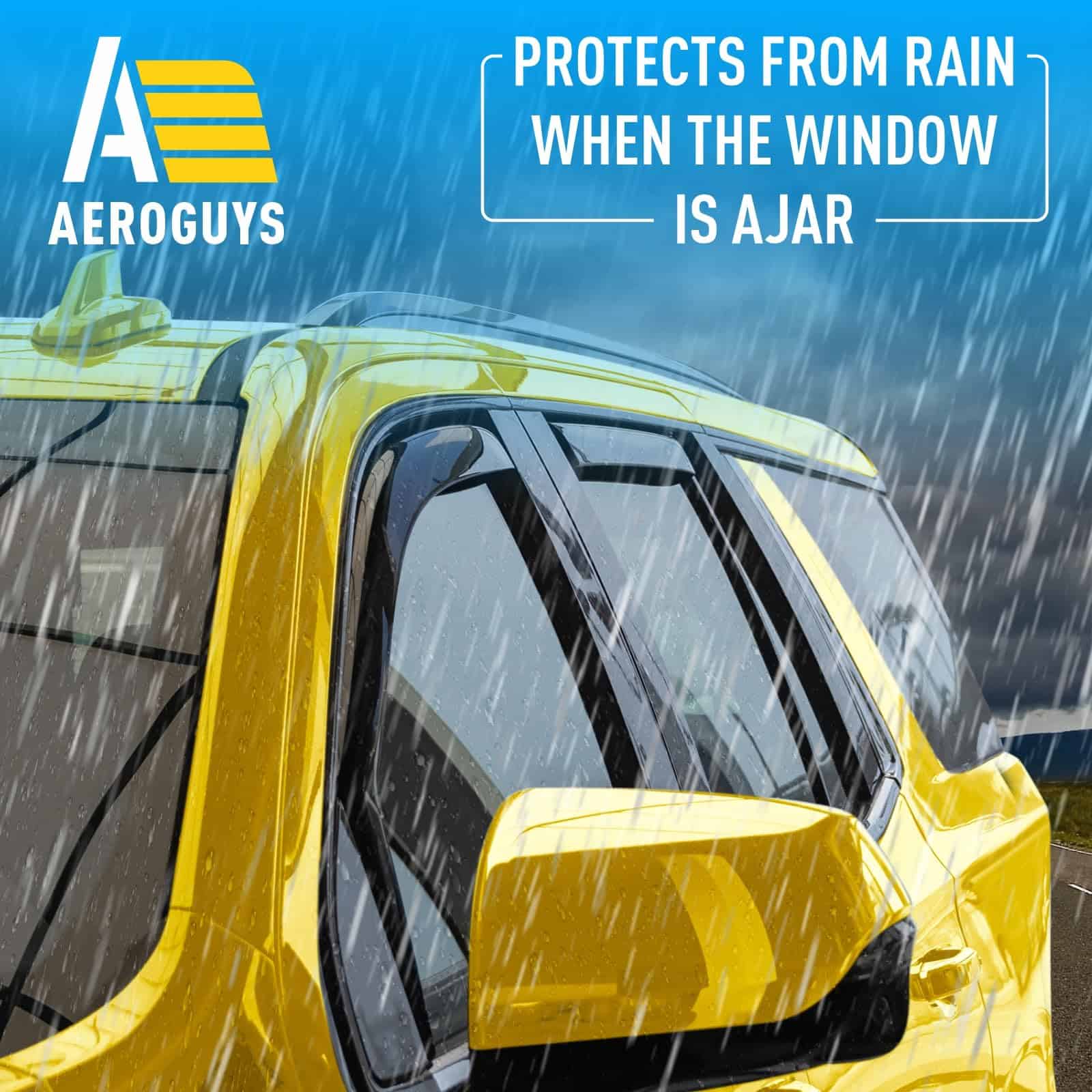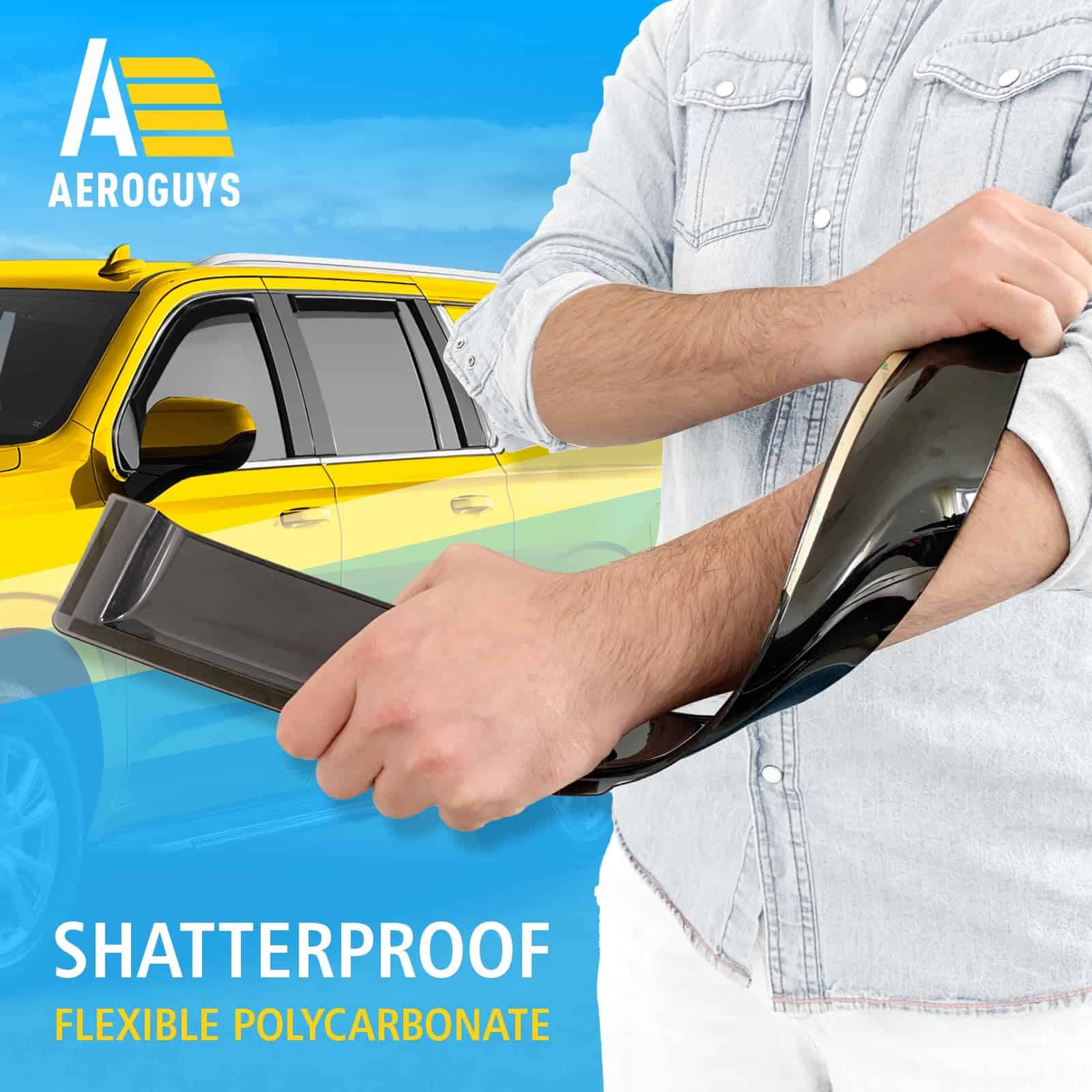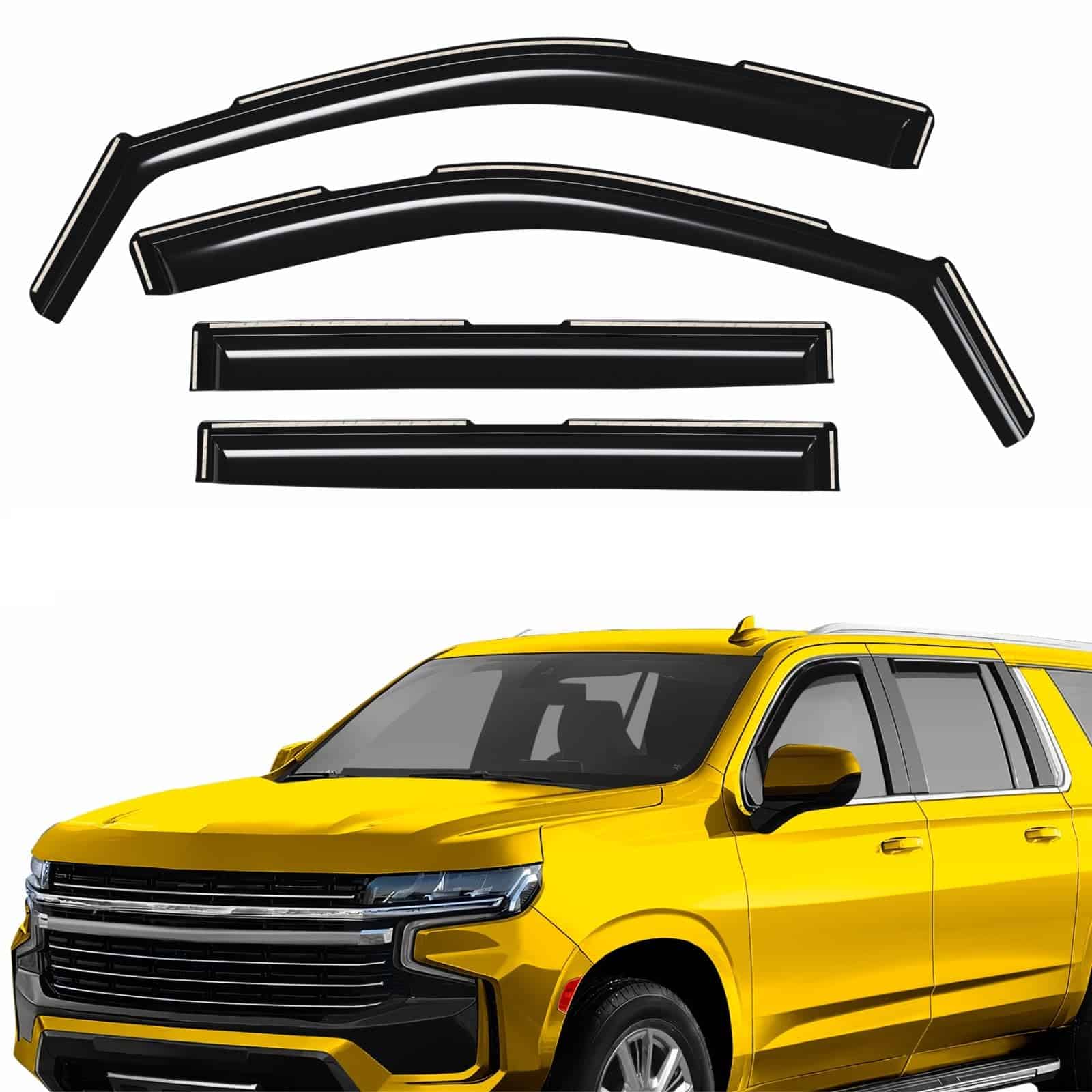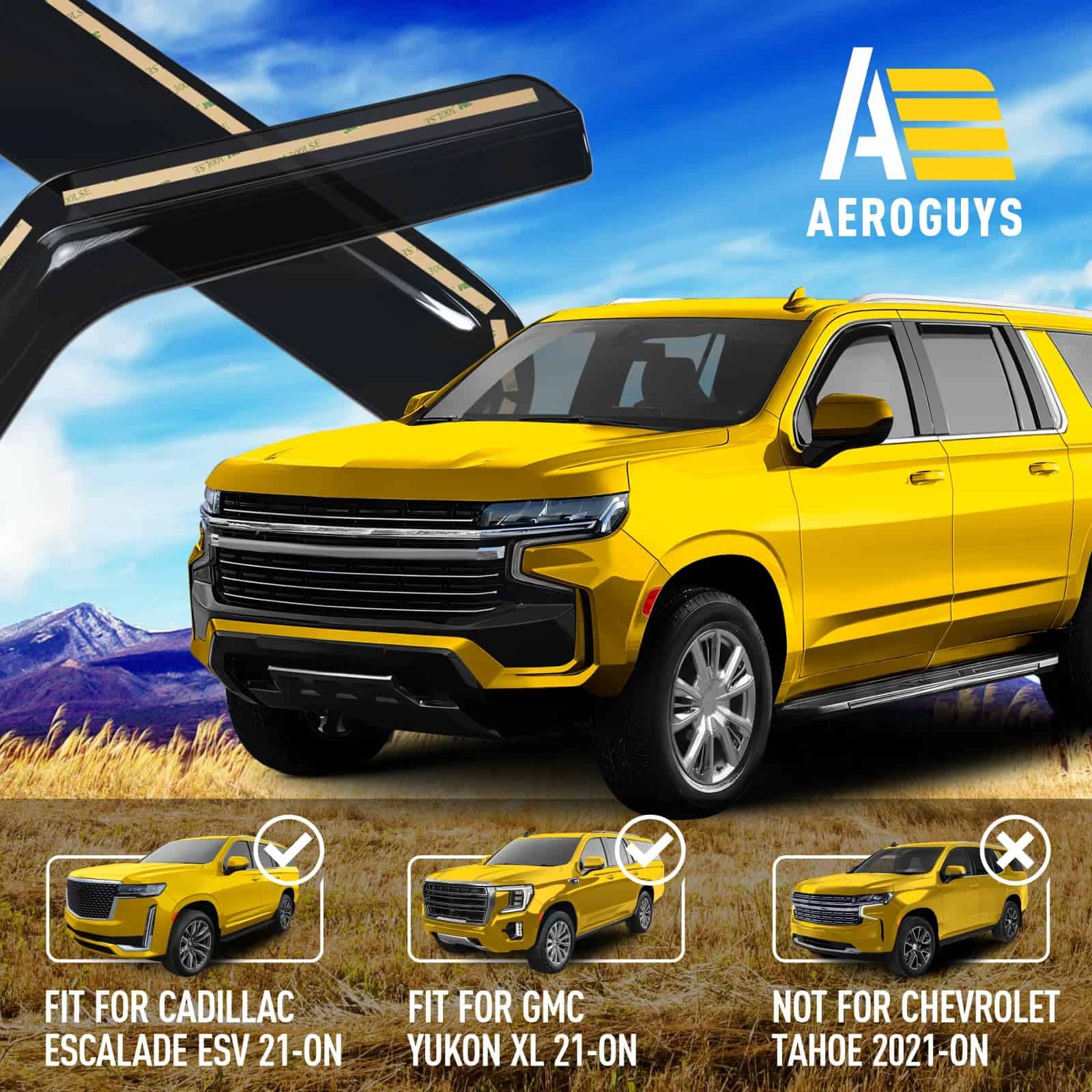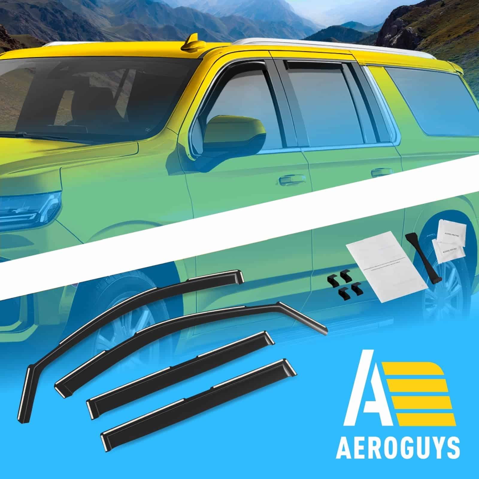 Nuestros visores de ventanas AEROGUYS no solo añaden a la apariencia de tu vehículo, sino que tienen un propósito mucho más práctico. Son uno de los accesorios para autos más subestimados, pero una vez que los has usado, sabes la gran diferencia que hacen en tu paseo. Nuestros visores de ventanas están fabricados con policarbonato flexible y duradero. Los visores de ventanas AEROGUYS están especialmente diseñados utilizando tecnología de punta para desviar lluvia, viento, luz del sol, nieve y mantener tu auto fresco. El set de 4 piezas viene con cinta 3M fácil de instalar y manual de instalación. CARACTERÍSTICAS DEL PRODUCTO: – Condición: 100% Nuevo; – Ajuste personalizado: para Chevrolet (Chevy) Suburban 2021-2025; GMC Yukon XL 2021-2025; Cadillac Escalade ESV 2021-2025; – Paquete incluye: 4 pcs deflectores de visera para ventana (2 delanteros/2 traseros), almohadilla de preparación, manual de instalación; – Color: Tintado negro ahumado; – Material: Policarbonato durable de alta calidad. Características: – Aire fresco incluso mientras llueve; – Reduce el deslumbramiento del sol; – Le da a tu vehículo un aspecto mejorado y fresco; – Amigo del lavado de auto; – Instalación fácil en canal; No requiere perforación; – Los visores están asegurados con cinta 3M. Tenemos viseras para la mayoría de los modelos de autos. Elige la marca y modelo de tu auto y el tipo de visera que deseas. ¡Ofrecemos una garantía de satisfacción del 100%! ¡Ordénalos ahora y obtén nuestros guardias de lluvia para ventanas de inmediato!