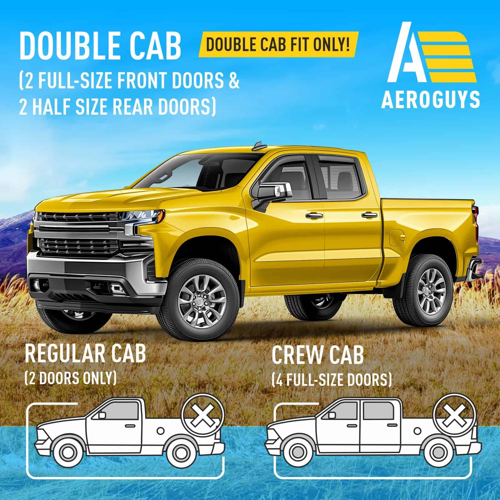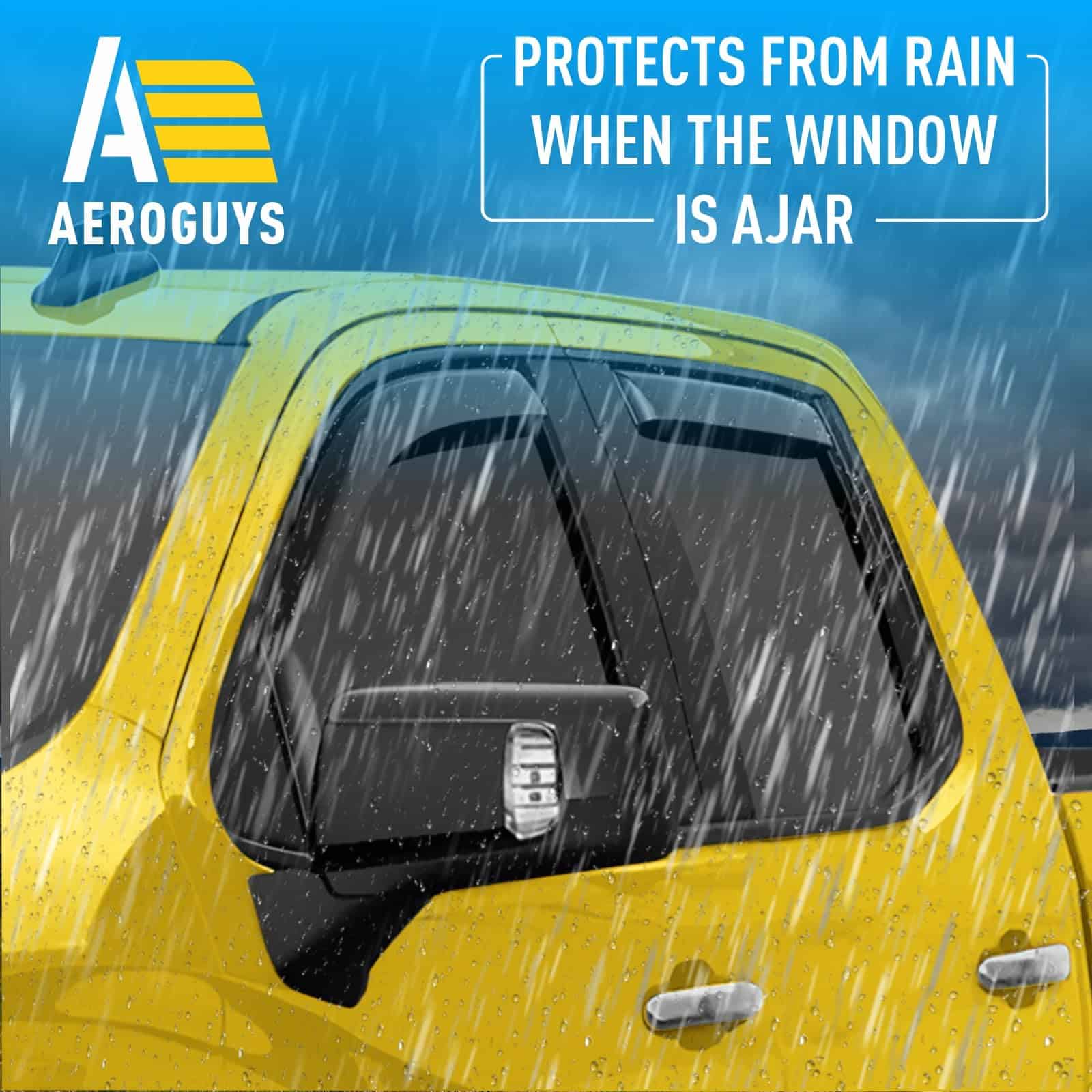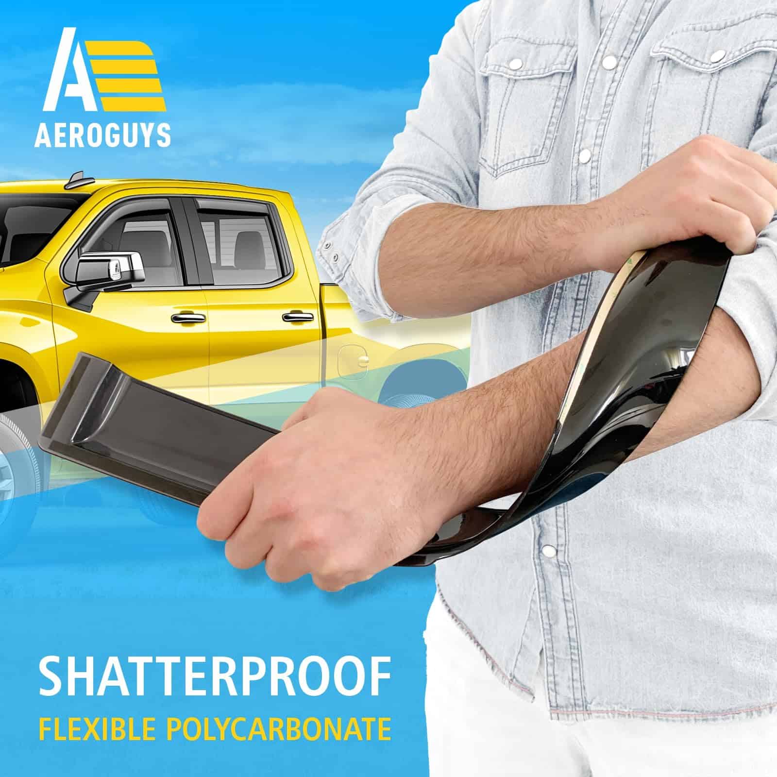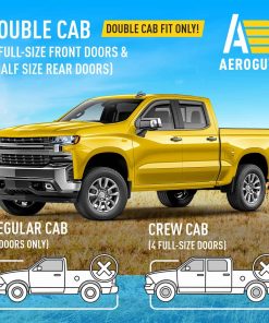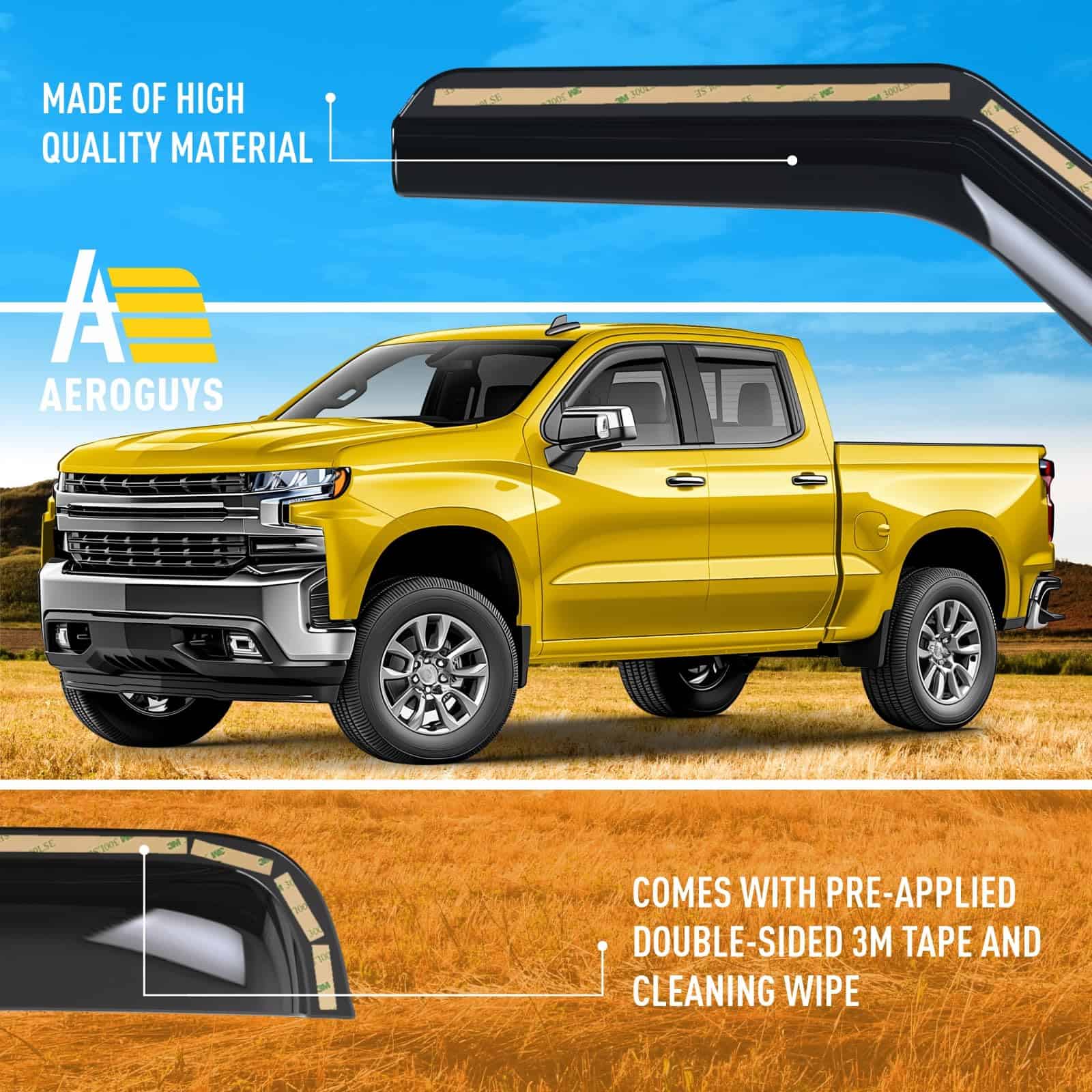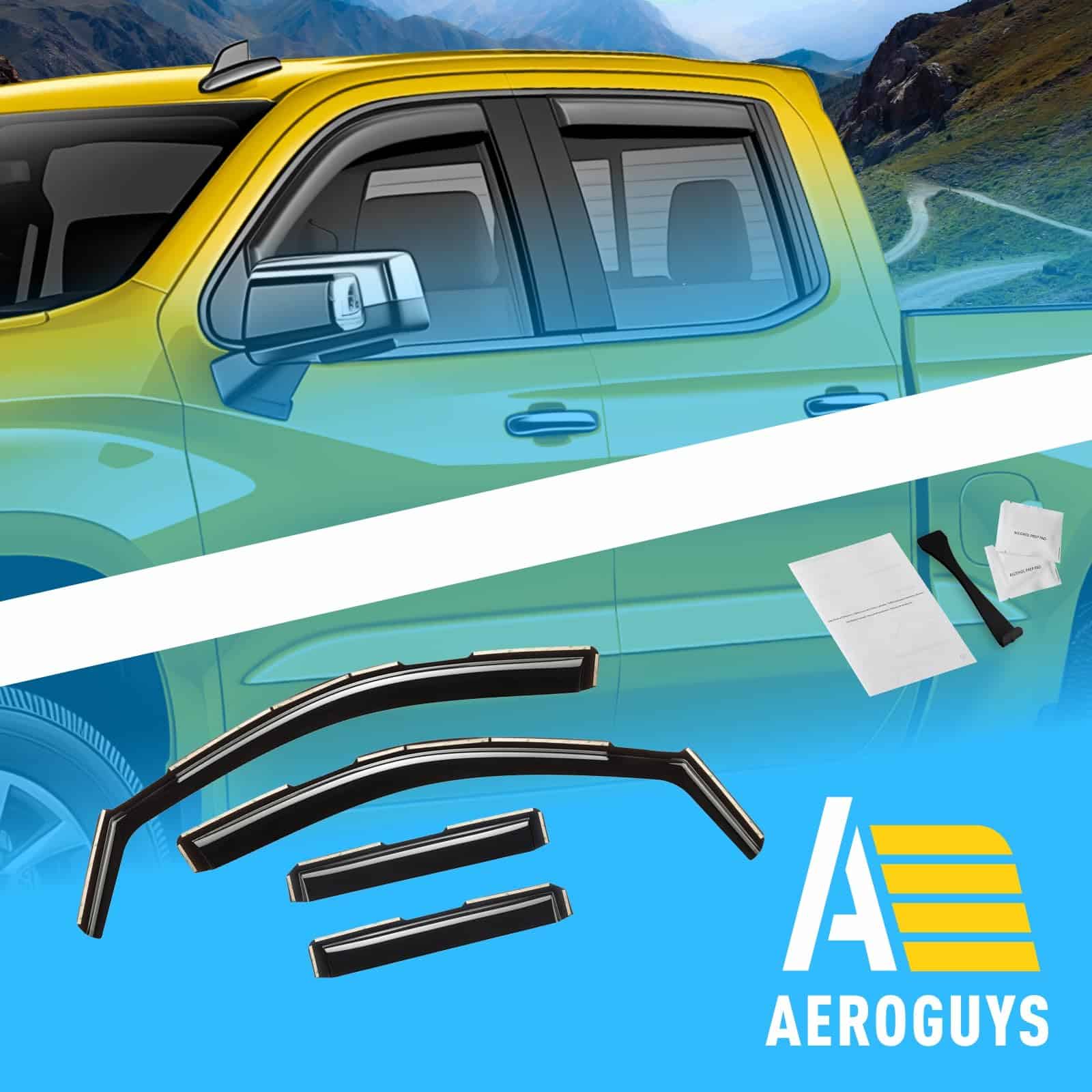 Nuestros visores de ventana AEROGUYS no solo mejoran la apariencia de tu vehículo, sino que también tienen un propósito mucho más práctico. Son uno de los accesorios para automóviles más subestimados, pero una vez que los has usado, sabes la diferencia que hacen en tu viaje. Nuestros visores de ventana están fabricados con policarbonato flexible y duradero. Los visores de ventana AEROGUYS están especialmente diseñados utilizando tecnología de vanguardia para desviar la lluvia, el viento, el sol, la nieve y mantener tu automóvil fresco. El set de 4 piezas viene con cinta 3M fácil de instalar y manual de instalación. CARACTERÍSTICAS DEL PRODUCTO: – Condición: 100% Nuevo; – Ajuste personalizado: para Chevrolet (Chevy) Silverado 1500 2019-2025 Cabina Doble, GMC Sierra 1500 2019-2025 Cabina Doble; – Paquete incluye: 4 pcs deflectores de visera de ventana (2 delanteras/2 traseras), almohadilla de preparación, manual de instalación; – Color: Tintado negro ahumado; – Material: Policarbonato durable de alta calidad. Características: – Aire fresco incluso mientras llueve; – Reduce el deslumbramiento del sol; – Le da a tu vehículo un aspecto mejorado y atractivo; – Amigable con el lavado de autos; – Fácil instalación en canal; no se requiere perforación; – Los visores se aseguran con cinta 3M. Tenemos visores para la mayoría de los modelos de automóviles. Elige la marca y modelo de tu automóvil y el tipo de visor que deseas. ¡Ofrecemos una garantía de satisfacción del 100%! ¡Ordena ahora y obtén nuestros deflectores de lluvia para ventanas de inmediato!