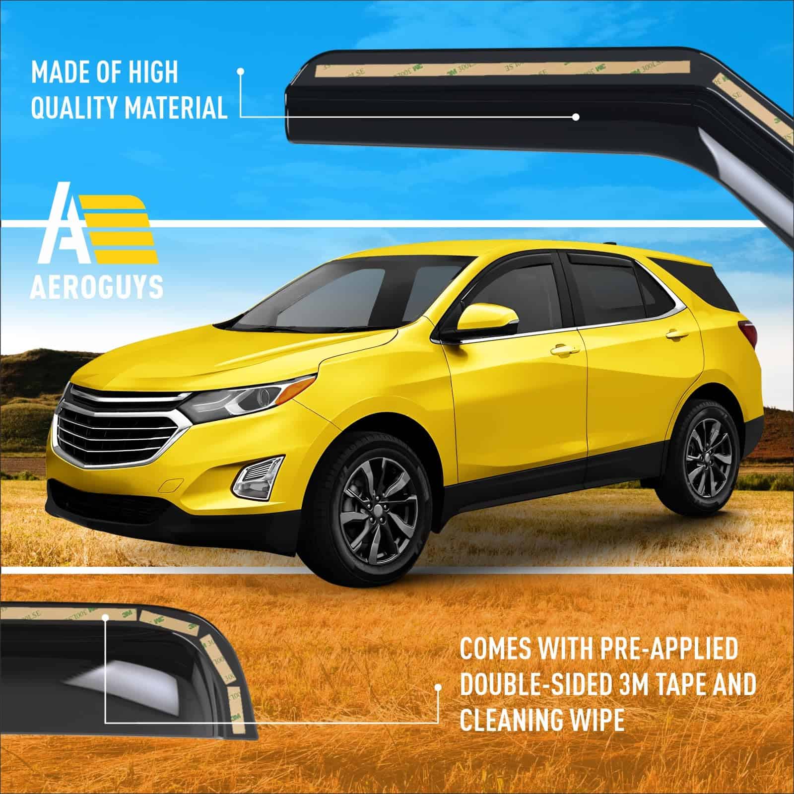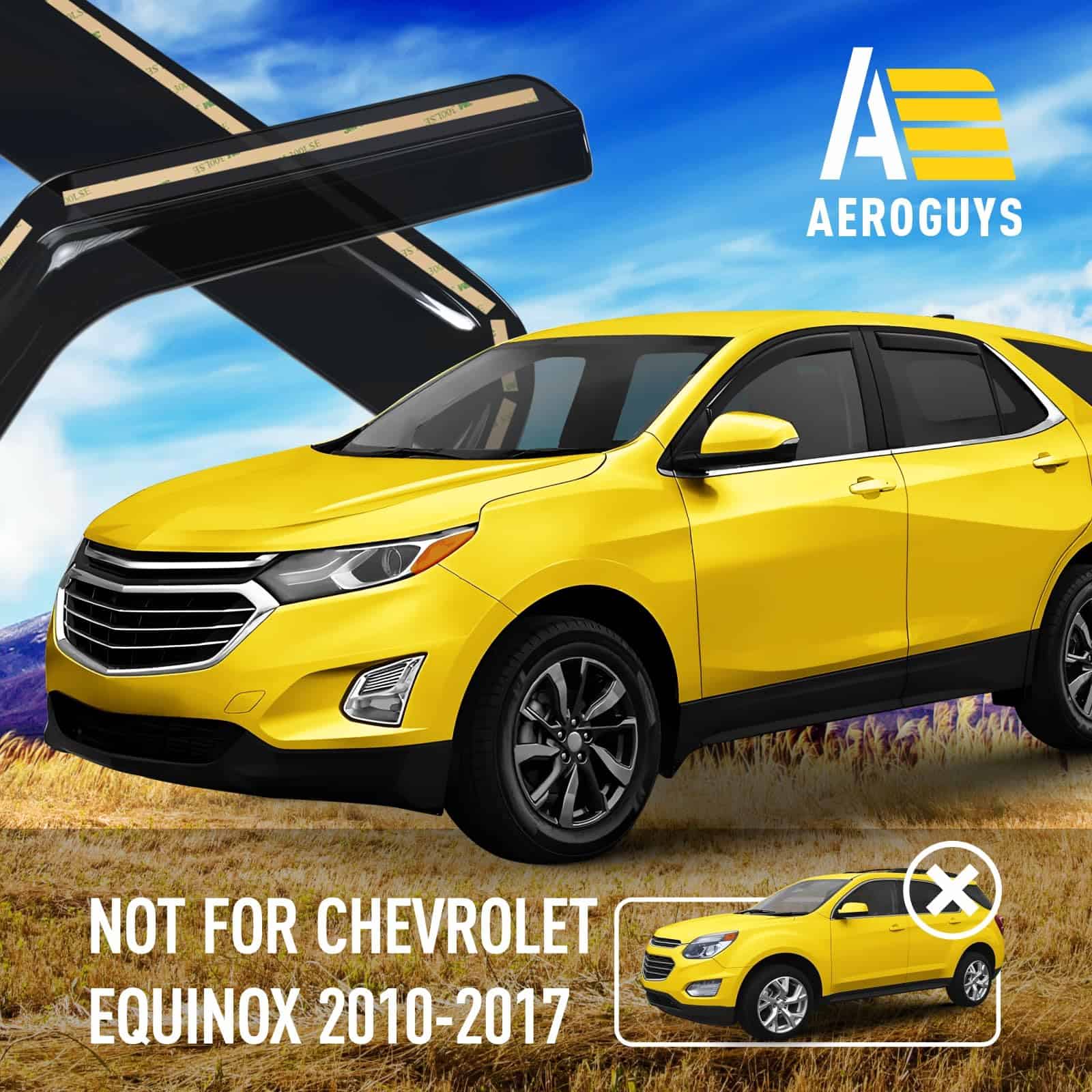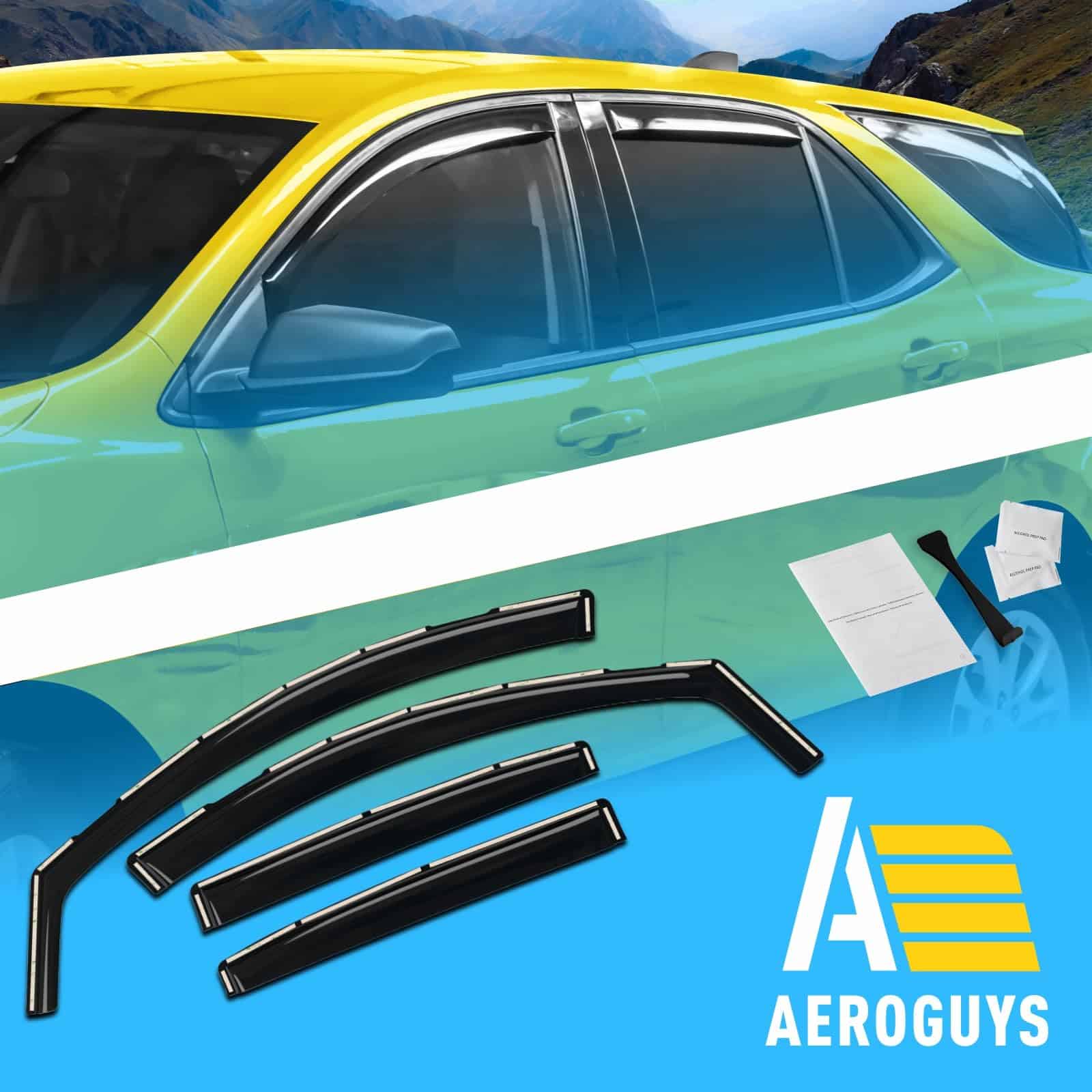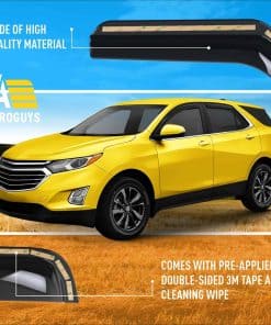 Nuestros visores de ventanas AEROGUYS no solo agregan a la apariencia de su vehículo, sino que también tienen un propósito mucho más práctico. Son uno de los accesorios de automóviles más subestimados, pero una vez que los haya usado, sabrá la gran diferencia que hacen en su viaje. Nuestros visores de ventanas están fabricados con policarbonato flexible y duradero. Los visores de ventanas AEROGUYS están especialmente diseñados utilizando tecnología de vanguardia para desviar la lluvia, el viento, el sol, la nieve y mantener su automóvil fresco. El juego de 4 piezas viene con cinta 3M fácil de instalar y manual de instalación. CARACTERÍSTICAS DEL PRODUCTO: – Condición: 100% Nuevo; – Ajuste personalizado: para Chevrolet (Chevy) Equinox 2018-2024; – Paquete incluye: 4 piezas de deflectores de visor de ventana (2 delanteros/2 traseros), almohadilla de preparación, manual de instalación; – Color: Tono negro ahumado; – Material: Policarbonato duradero de alta calidad. Características: – Aire fresco incluso bajo la lluvia; – Reduce el deslumbramiento del sol; – Le da a su vehículo un aspecto mejorado y fresco; – Amigable con el lavado de autos; – Fácil instalación en canal; No se requiere taladrar; – Los visores están asegurados con cinta 3M. Tenemos visores para la mayoría de los modelos de autos. Elija la marca y modelo de su automóvil y el tipo de visor que desee. ¡Ofrecemos una garantía de satisfacción del 100%! ¡Ordene ahora y obtenga nuestros protectores de lluvia de ventana de inmediato!