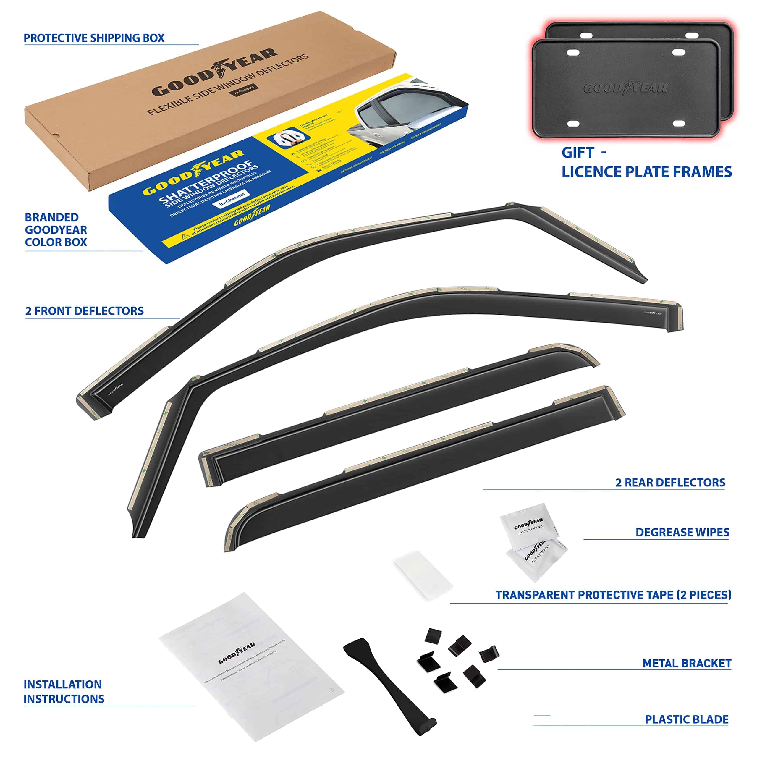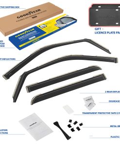 5. Obtenga un regalo perfecto ahora mismo: se incluyen 2 marcos de placa de licencia de Goodyear en el juego. No se necesitan herramientas, simplemente pele y pegue estos visores de ventana para lluvia. Incluimos toallitas desengrasantes para hacer el trabajo rápidamente. Este deflector de ventilación es un gran regalo de cumpleaños o regalo de vacaciones para cualquier persona que le guste conducir con la ventana abajo. Los deflectores de ventana lateral vienen en una caja de color Goodyear protegida por una caja de envío marrón.