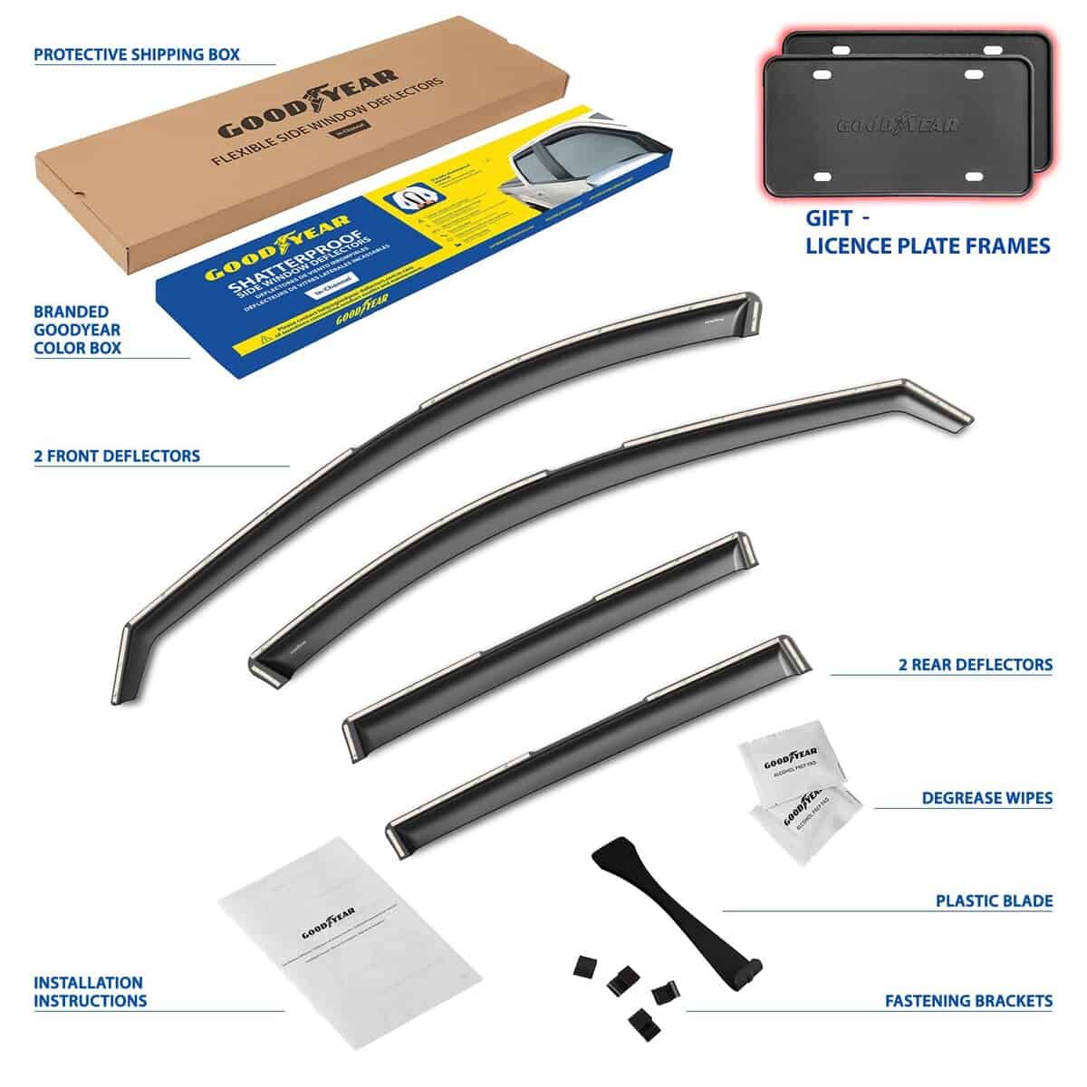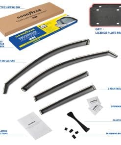 5. Obtén un regalo perfecto ahora: se incluyen 2 marcos de matrículas de Goodyear en el set. No se necesitan herramientas, simplemente despega y pega estos visores de ventana deflectores de lluvia. Incluimos toallitas desengrasantes para hacer el trabajo rápido. Esta visera de ventilación es un gran regalo de cumpleaños o presente para cualquier persona que le guste conducir con la ventana abajo. Los deflectores de ventana lateral vienen en una caja de color Goodyear protegida por una caja de envío marrón.