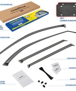 5. ¡Consigue un regalo perfecto ahora mismo – Se incluyen 2 marcos de matrícula de Goodyear en el juego. No se necesitan herramientas, simplemente despegue y pegue estos visores de ventana de deflector de lluvia. Incluimos toallitas desengrasantes para que el trabajo sea rápido. Este deflector de ventilación es un excelente regalo de cumpleaños o regalo de vacaciones para cualquier persona que le guste conducir con la ventana abajo. Los deflectores de ventana lateral vienen en una caja de color Goodyear protegida por una caja de envío marrón.