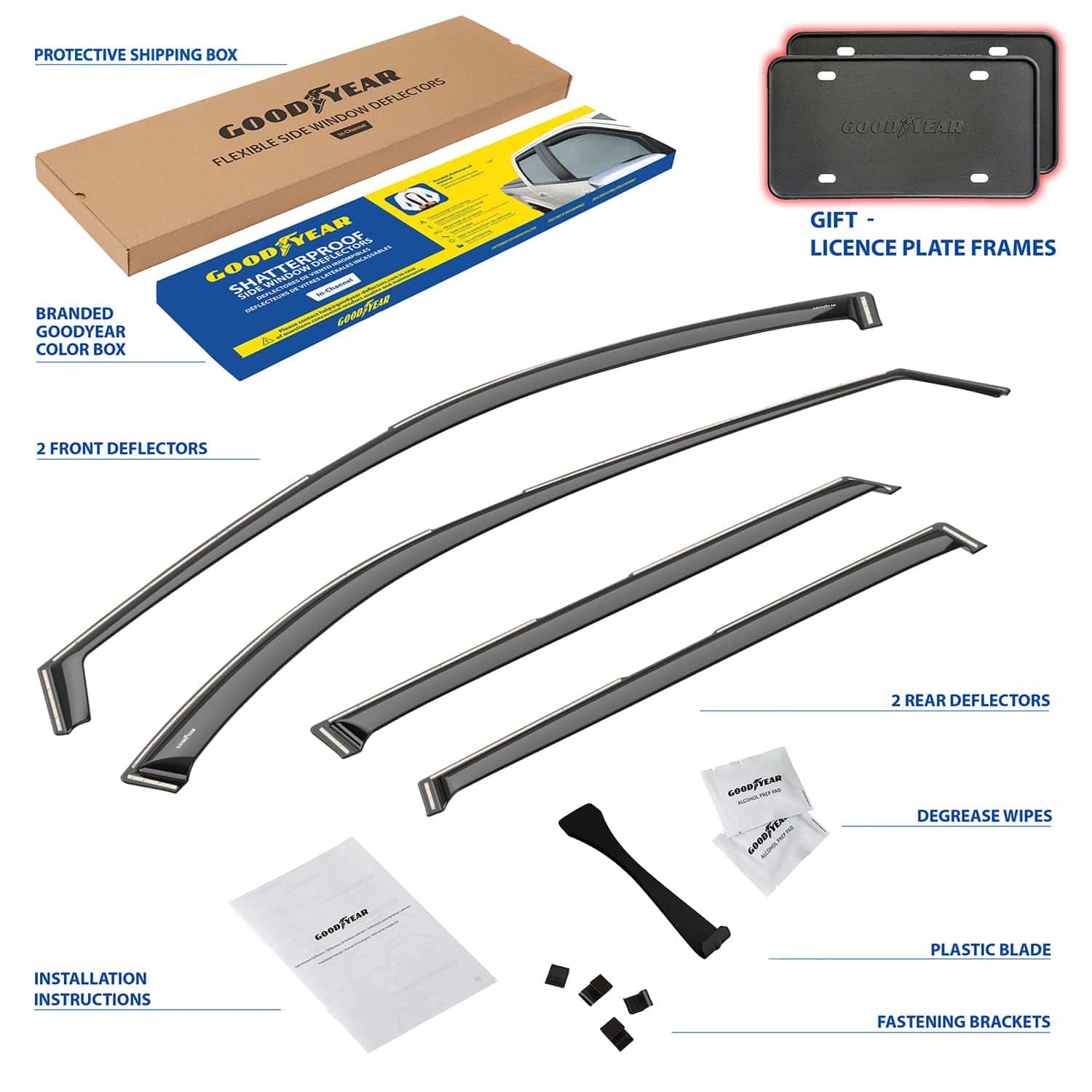 2. Los deflectores de ventana laterales premium de Goodyear le permiten bajar la ventana en la lluvia, vientos fuertes, nieve y hielo. Estos visores de ventana de deflector de lluvia para automóviles evitan que te mojes mientras disfrutas de aire fresco. Hechos de material irrompible duradero de alta calidad. El deflector de lluvia no se agrietará, romperá ni astillará.