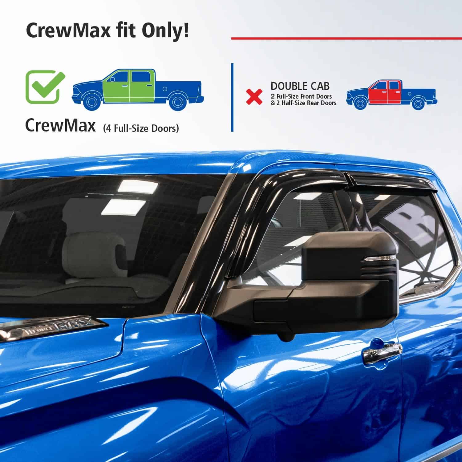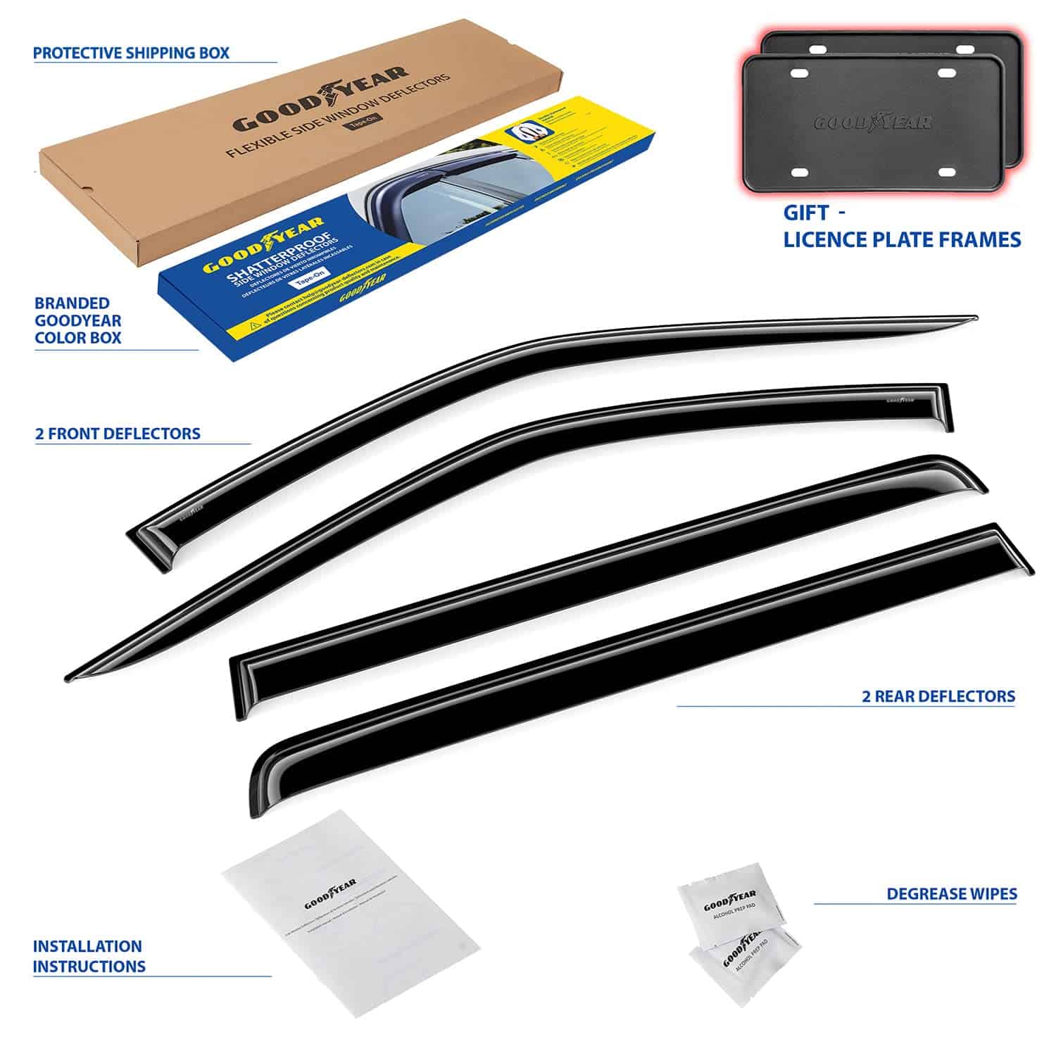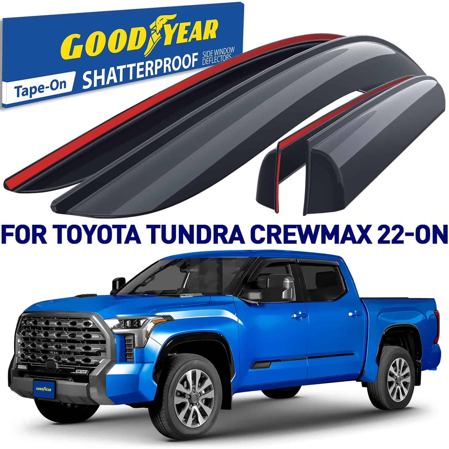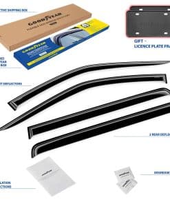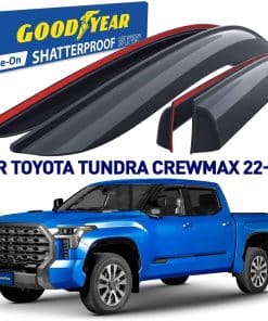 1. ¡Atención! El deflector de ventilación solo es compatible con Toyota Tundra 2022-2025 CrewMax. 2. Los deflectores de ventana laterales Goodyear premium le permiten bajar la ventana en lluvia, vientos fuertes, nieve y hielo. Estos accesorios para automóviles evitan que se moje mientras disfruta de aire fresco. Hechos de material irrompible de alta calidad y duradero. El visor de ventana no se agrieta, rompe ni astilla. 3. El ensamblaje fácil con cinta le permite colocar estos visores de ventana para autos en solo minutos sin necesidad de herramientas o instrucciones complicadas. La cinta 3m vhb súper resistente proporciona una sujeción segura que no se suelta. El montaje exterior es resistente al agua y duradero en todas las condiciones climáticas. 4. Se eligió un gran color diseñado especialmente para protección solar. Combina bien con todos los estilos y colores de vehículos. Este color de deflector de viento se mantiene rico año tras año. Este es un accesorio premium para automóviles que mejorará el valor de su camioneta, así como su disfrute y comodidad diarios. 5. Obtenga un regalo perfecto en este momento: se incluyen 2 Marcos de Placas de Licencia Goodyear en el juego. No se necesitan herramientas, simplemente pele y pegue estos visores de ventana para lluvia. Incluimos toallitas desengrasantes para facilitar el trabajo. Este deflector de ventilación es un gran regalo de cumpleaños o presentación navideña para cualquier persona a la que le guste conducir con la ventana abierta. Los deflectores de ventanilla lateral vienen en una caja de color Goodyear protegida por una caja de envío marrón.