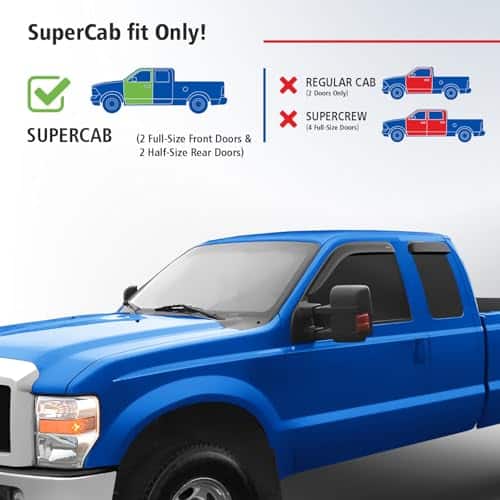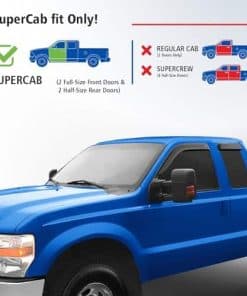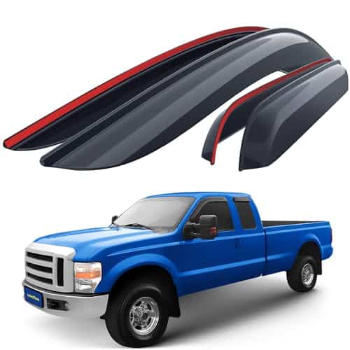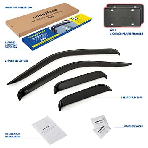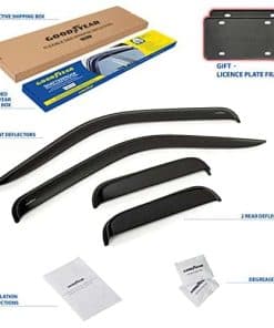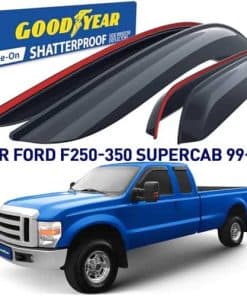1. ¡Atención! El deflector de ventilación solo es compatible con Ford F-250 1999-2016 Super Duty SuperCab, Ford F-350 1999-2016 Super Duty SuperCab. 2. Los deflectores de ventana premium de Goodyear te permiten bajar la ventana en lluvia, vientos fuertes, nieve y hielo. Estos accesorios para camiones te mantienen seco mientras disfrutas del aire fresco. Fabricados con material duradero irrompible de alta calidad. La visera de la ventana no se agrieta, rompe ni astilla. 3. El montaje simple con cinta adhesiva te permite colocar estos visores de ventana para autos en minutos sin herramientas ni instrucciones complicadas. La cinta 3M VHB súper resistente proporciona un agarre seguro que no cederá. El montaje exterior es resistente al agua y duradero en todas las condiciones climáticas. 4. El color creativo elegido es el mejor para la protección solar. Combina bien con todos los estilos y colores de vehículos. Este color de deflector de viento mantiene su riqueza año tras año. Se trata de un accesorio premium para automóviles que mejorará el valor de tu camión, así como tu disfrute y comodidad diarios. 5. Obtén un regalo perfecto ahora, se incluyen 2 marcos de matrícula de Goodyear en el juego. No se necesitan herramientas, simplemente despega y pega estos deflectores de ventana de ventilación para la lluvia. Incluimos toallitas desengrasantes para que el trabajo sea rápido. Esta visera de ventilación es un gran regalo de cumpleaños o presente navideño para cualquier persona a la que le gusta conducir con la ventana abajo. Los deflectores de ventana lateral vienen en una caja de color Goodyear protegida por una caja de envío marrón.