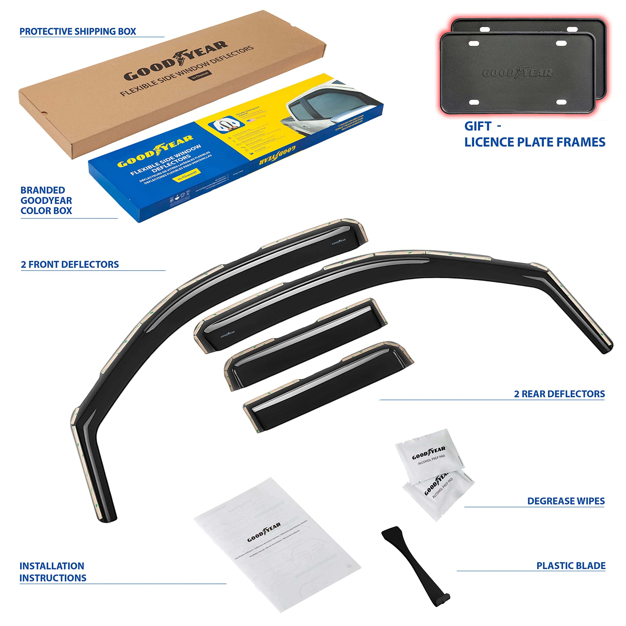 2. Los deflectores de ventanas laterales Premium de Goodyear le permiten bajar la ventana en la lluvia, vientos fuertes, nieve e hielo. Estos deflectores de ventanas para autos mantienen a raya la humedad mientras disfruta de aire fresco. Hechos de material irrompible de alta calidad y duradero. El deflector de lluvia no se agrietará, romperá ni astillará.