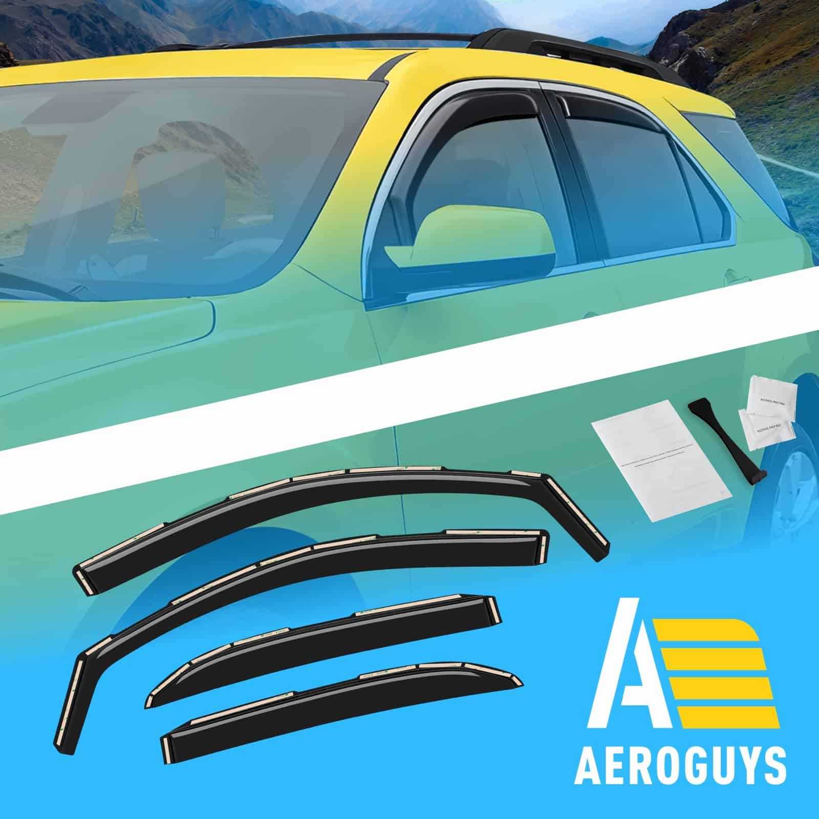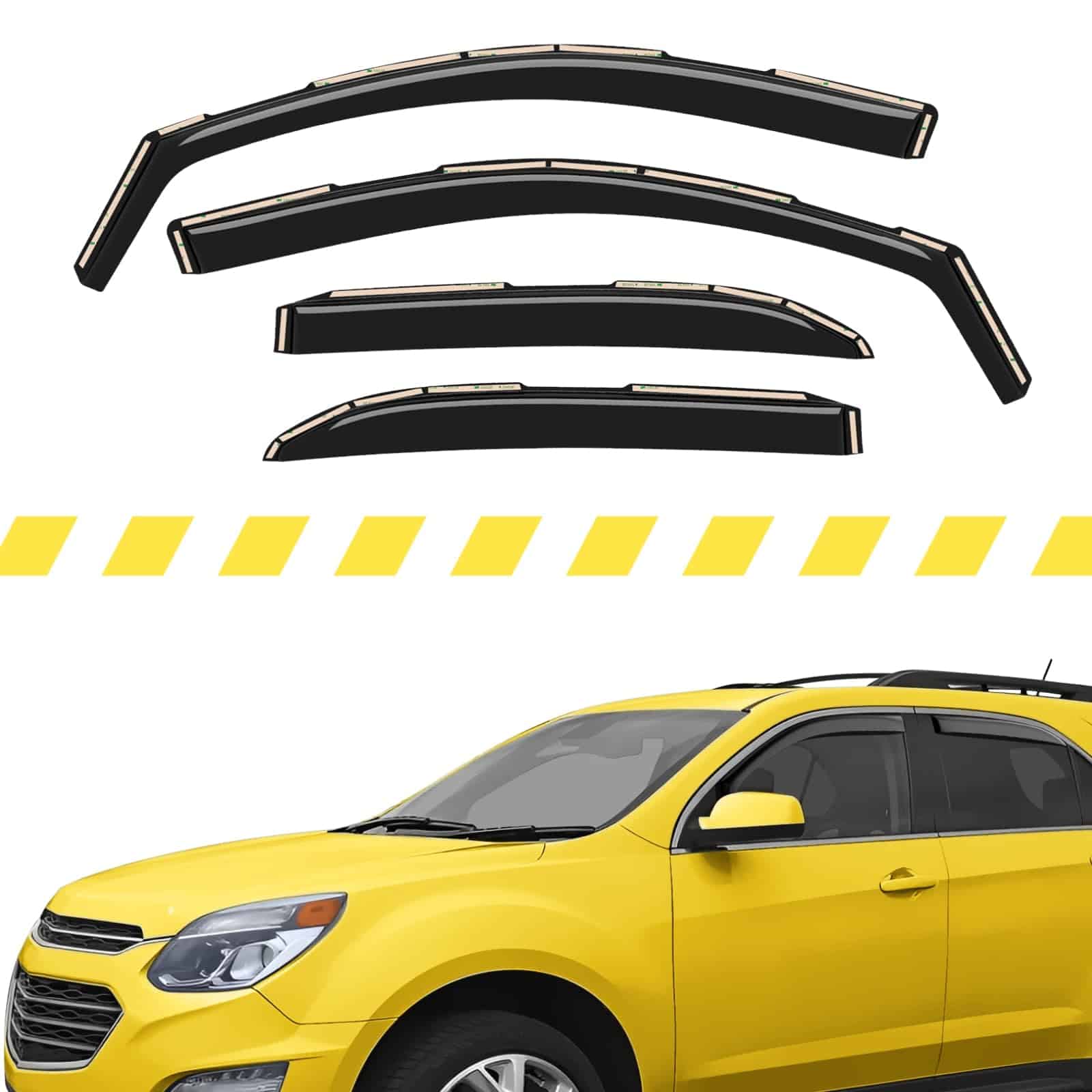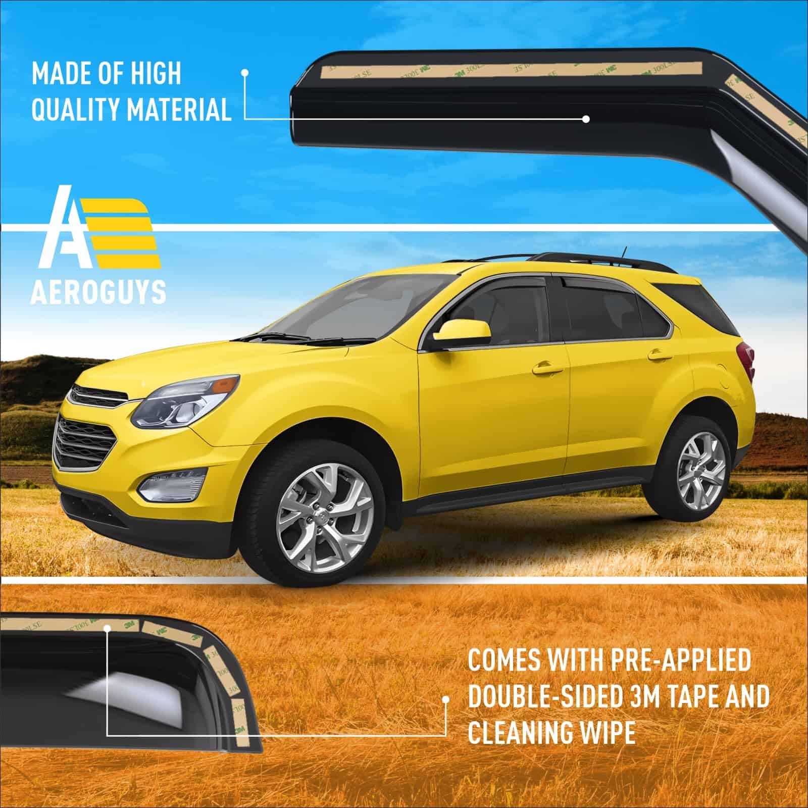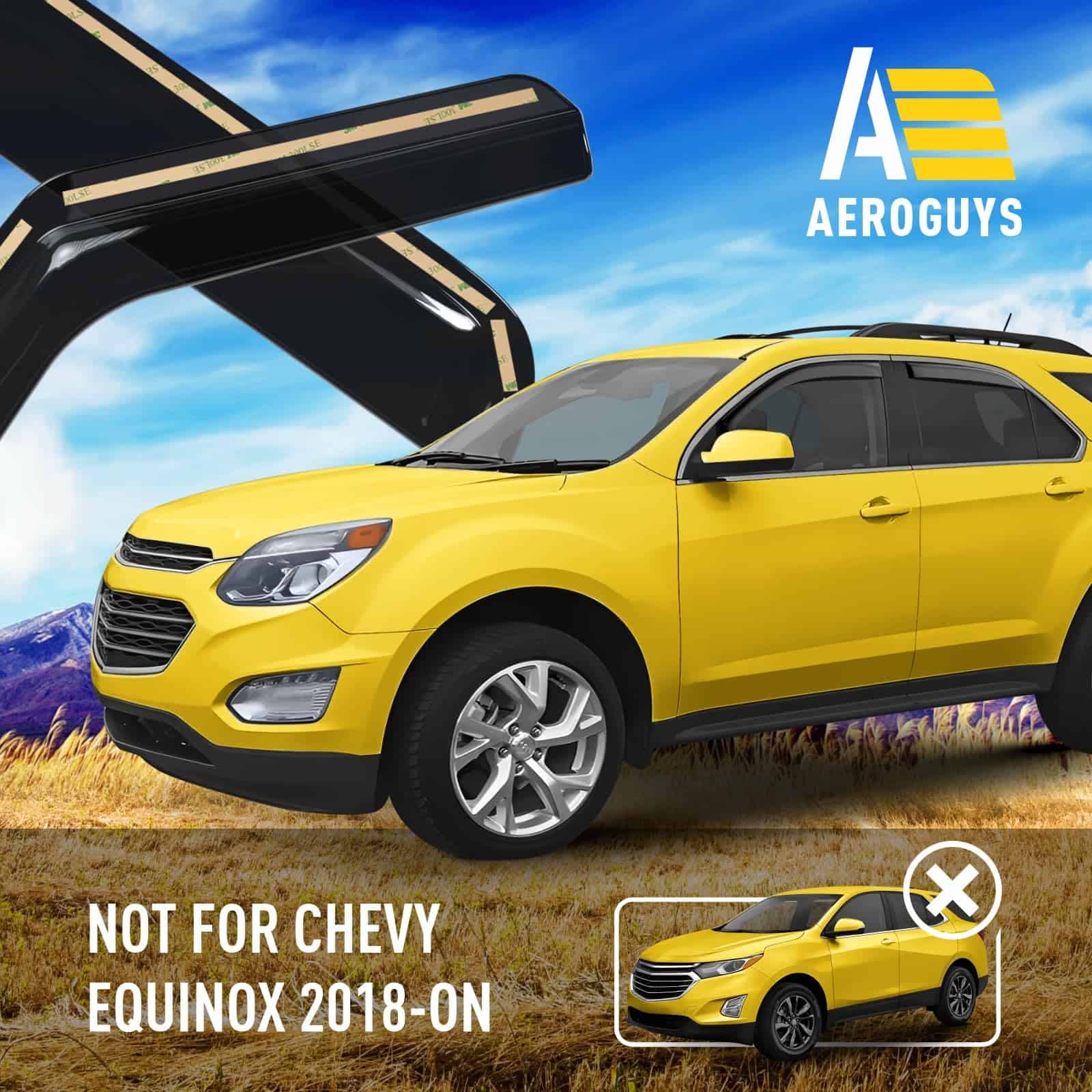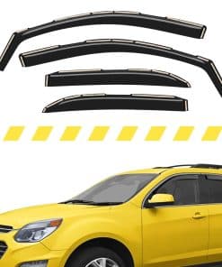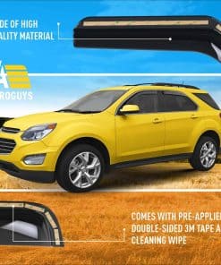Nuestros visores de ventanas AEROGUYS no solo añaden apariencia a su vehículo, sino que también tienen un propósito mucho más práctico. Son uno de los accesorios para vehículos más subestimados, pero una vez que los haya usado, sabrá la gran diferencia que hacen en su viaje. Nuestros visores de ventanas están fabricados con policarbonato flexible y duradero. Los visores de ventanas AEROGUYS están especialmente diseñados utilizando tecnología de vanguardia para desviar la lluvia, el viento, el sol, la nieve y mantener su auto fresco. El juego de 4 piezas viene con cinta 3M fácil de instalar y manual de instalación. CARACTERÍSTICAS DEL PRODUCTO: – Condición: 100% Nuevo; – Ajuste a medida: Chevrolet Chevy Equinox 2010-2017; – Paquete incluye: 4 piezas de deflectores de visera para ventana (2 delanteros/2 traseros), almohadilla de preparación, manual de instalación; – Color: Tinte negro ahumado; – Material: Policarbonato duradero de alta calidad. Características: – Aire fresco incluso cuando llueve; – Reduce el deslumbramiento del sol; – Le da a su vehículo un aspecto actualizado y fresco; – Apto para lavado de autos; – Instalación fácil en el canal; No requiere perforación; – Las viseras se aseguran con cinta 3M. Disponemos de viseras para la mayoría de los modelos de autos. Elija la marca y modelo de su auto y el tipo de visera que desea. ¡Ofrecemos una garantía de satisfacción del 100%! ¡Ordene ahora y obtenga nuestros deflectores de lluvia para ventanas de inmediato!