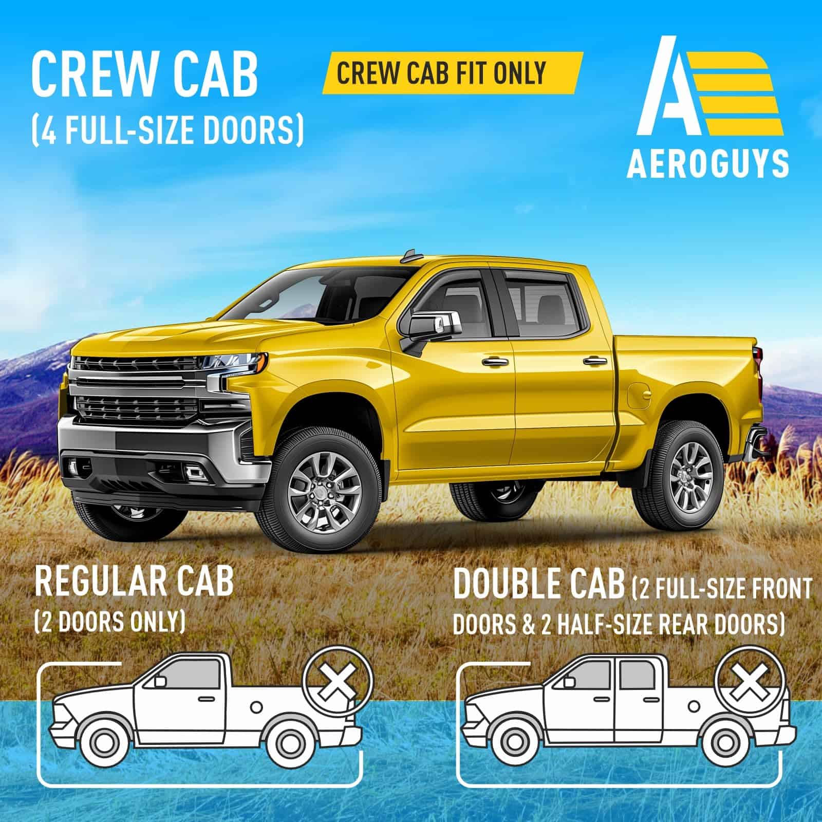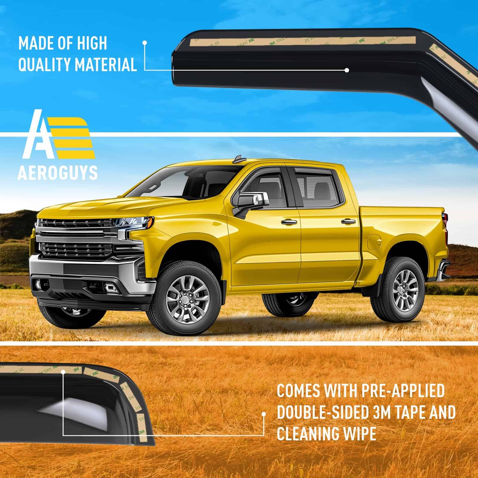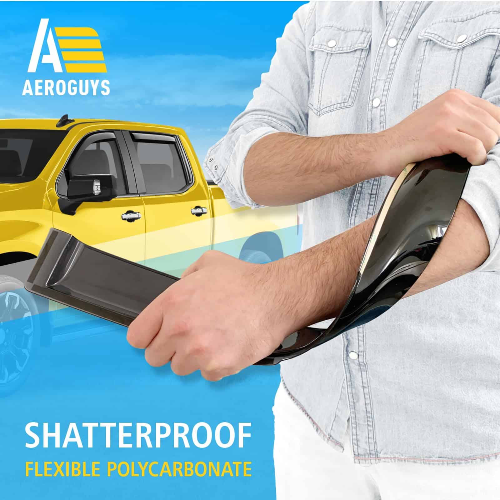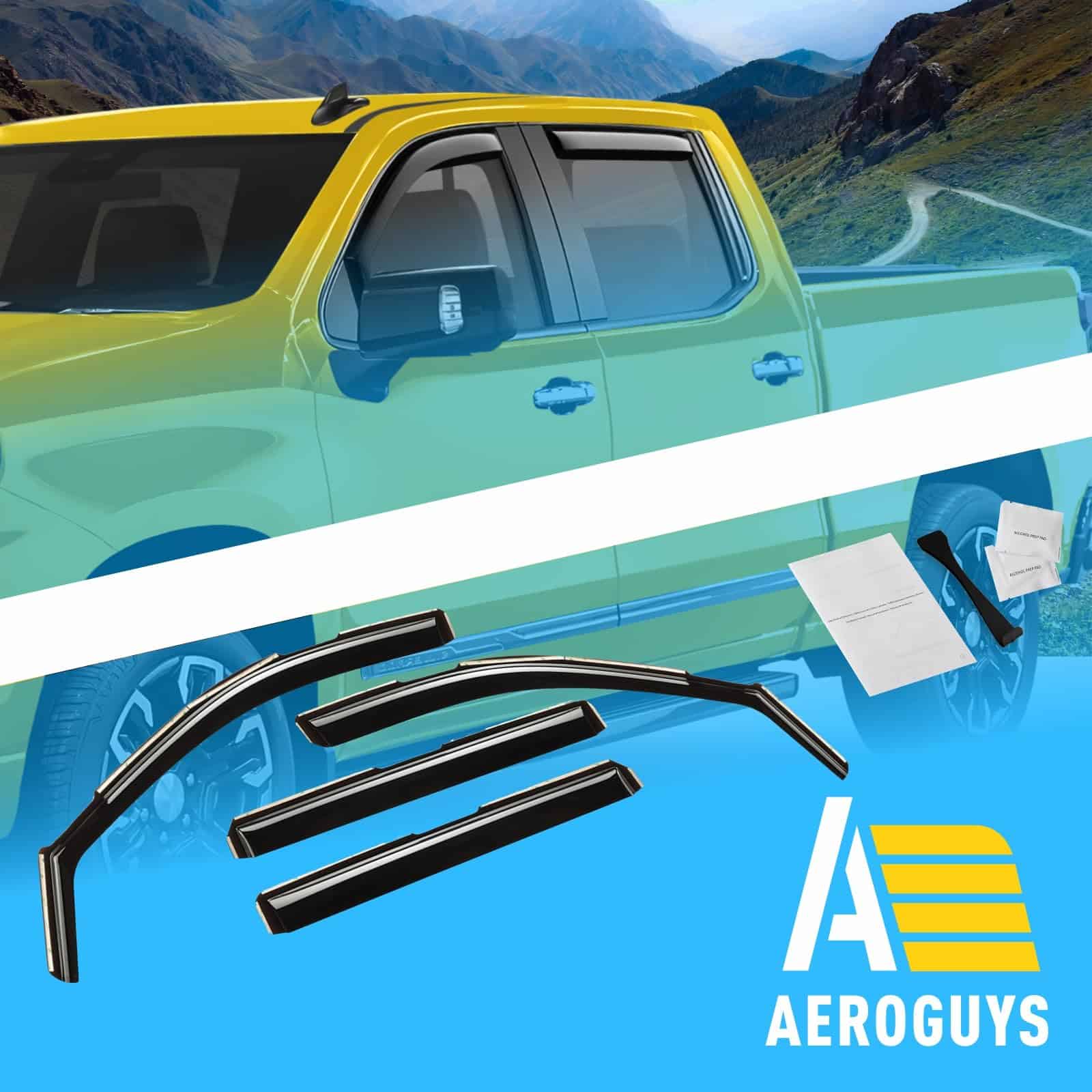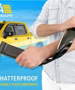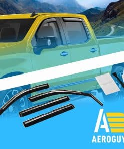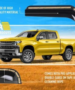 Nuestros visores de ventanas AEROGUYS no solo agregan a la apariencia de su vehículo, sino que tienen un propósito mucho más práctico. Son uno de los accesorios de automóviles más subestimados, pero una vez que los haya utilizado, sabrá cuál diferencia hacen en su viaje. Nuestros visores de ventanas están fabricados con policarbonato flexible y duradero. Los visores de ventanas AEROGUYS son especialmente diseñados utilizando tecnología de vanguardia para desviar la lluvia, el viento, la luz del sol, la nieve y mantener su automóvil enfriado. El juego de 4 piezas viene con cinta adhesiva 3M fácil de instalar y manual de instalación. CARACTERÍSTICAS DEL PRODUCTO: – Condición: 100% nuevo; – Ajuste personalizado: para Chevrolet (Chevy) Silverado 1500 2019-2025 Cabina de Tripulación, GMC Sierra 1500 2019-2025 Cabina de Tripulación; – Paquete incluye: 4 pcs deflectores de visor de ventana (2 delanteros / 2 traseros), almohadilla de preparación, manual de instalación; – Color: Tinte negro ahumado; – Material: Policarbonato duradero de alta calidad. Características: – Aire fresco incluso mientras llueve; – Reduce el deslumbramiento del sol; – Le da a su vehículo un aspecto actualizado y fresco; – Amigable con el lavado de autos; – Fácil instalación en canal; No se requiere perforación; – Los visores están asegurados con cinta 3M. Tenemos visores para la mayoría de modelos de autos. Elija la marca y modelo de su automóvil y el tipo de visor que desea. ¡Ofrecemos una garantía de satisfacción del 100%! ¡Ordene ahora y obtenga nuestros deflectores de lluvia para ventanas de inmediato!