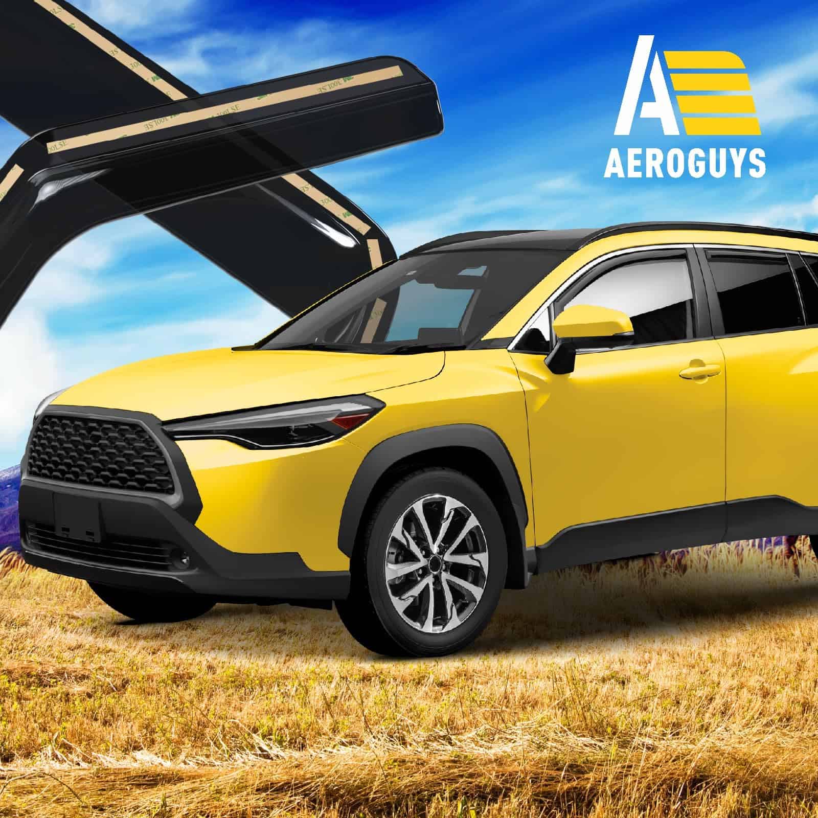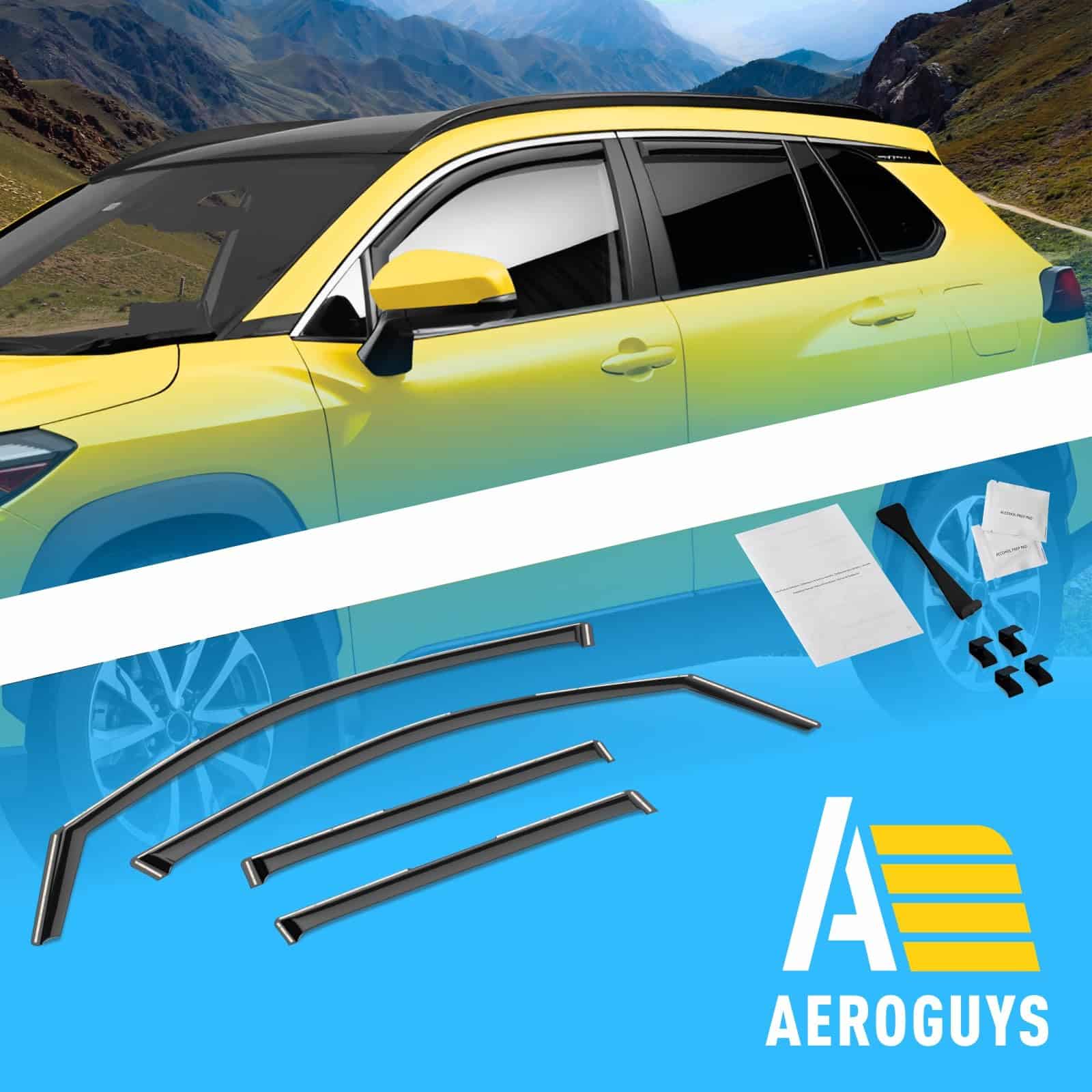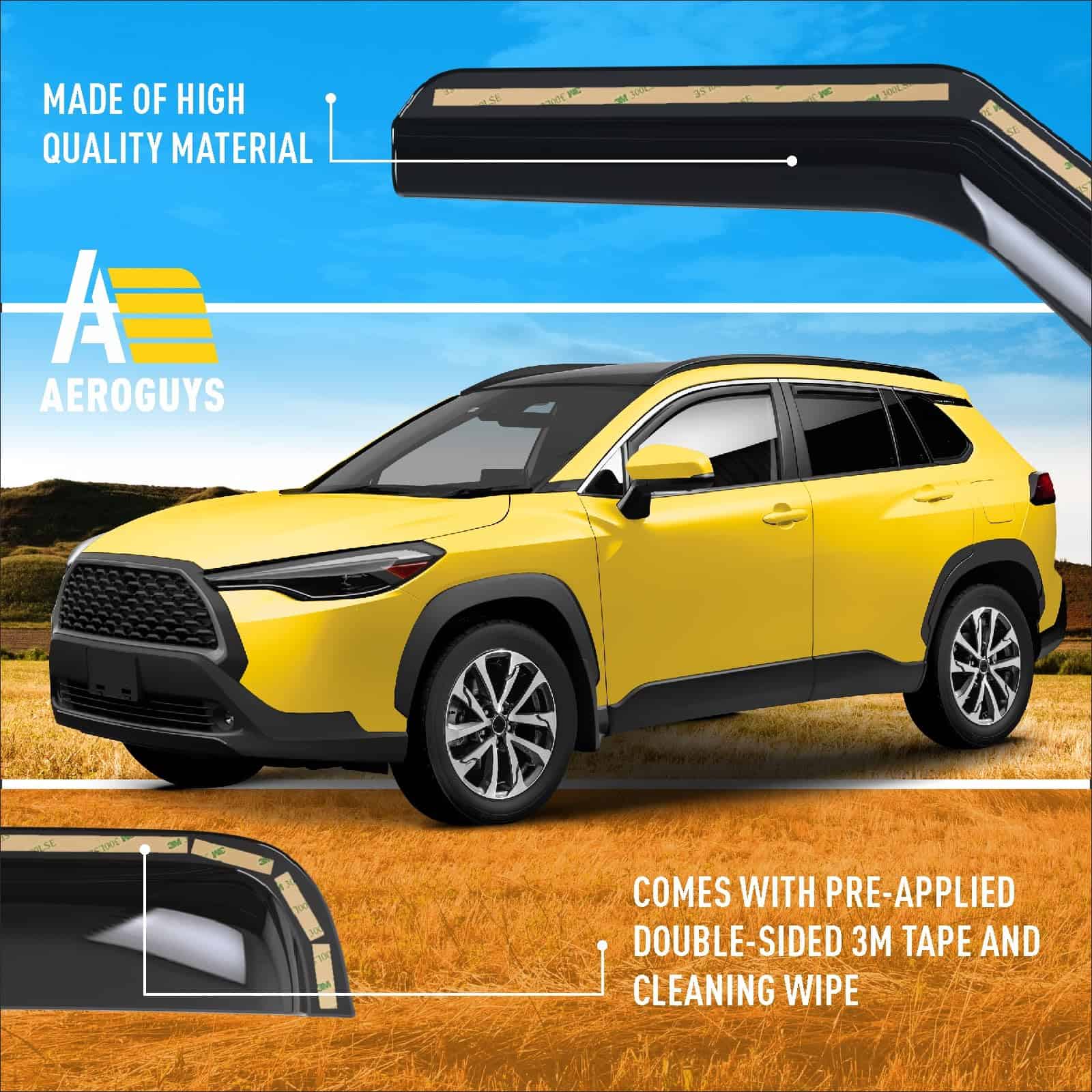 Nuestros visores de ventanas AEROGUYS no solo añaden a la apariencia de su vehículo, sino que tienen un propósito mucho más práctico. Son uno de los accesorios para automóviles más subestimados, pero una vez que los ha usado, sabe la diferencia que hacen en su viaje. Nuestros visores de ventanas están fabricados con policarbonato flexible y duradero. Los visores de ventanas AEROGUYS están especialmente diseñados utilizando tecnología de vanguardia para desviar la lluvia, el viento, el sol, la nieve y mantener su automóvil fresco. El juego de 4 piezas viene con cinta 3M fácil de instalar y manual de instalación. CARACTERÍSTICAS DEL PRODUCTO: – Condición: 100% nuevo; – Ajuste personalizado: para Corolla Cross 2022-2025; – Paquete incluye: 4 piezas de deflectores de visor de ventana (2 delanteros / 2 traseros), almohadilla de preparación, manual de instalación; – Color: Tinte ahumado negro; – Material: Policarbonato de alta calidad y duradero. Características: – Aire fresco incluso cuando llueve; – Reduce el deslumbramiento del sol; – Le da a su vehículo un aspecto moderno y mejorado; – Amigo del lavado de autos; – Fácil instalación en canal; No se requiere perforación; – Los visores están asegurados con cinta 3M. Tenemos visores para la mayoría de los modelos de automóviles. Elija la marca y modelo de su automóvil y el tipo de visor que desee. ¡Ofrecemos una garantía de satisfacción del 100%! ¡Ordene ahora y obtenga nuestros deflectores de lluvia para ventanas de inmediato!