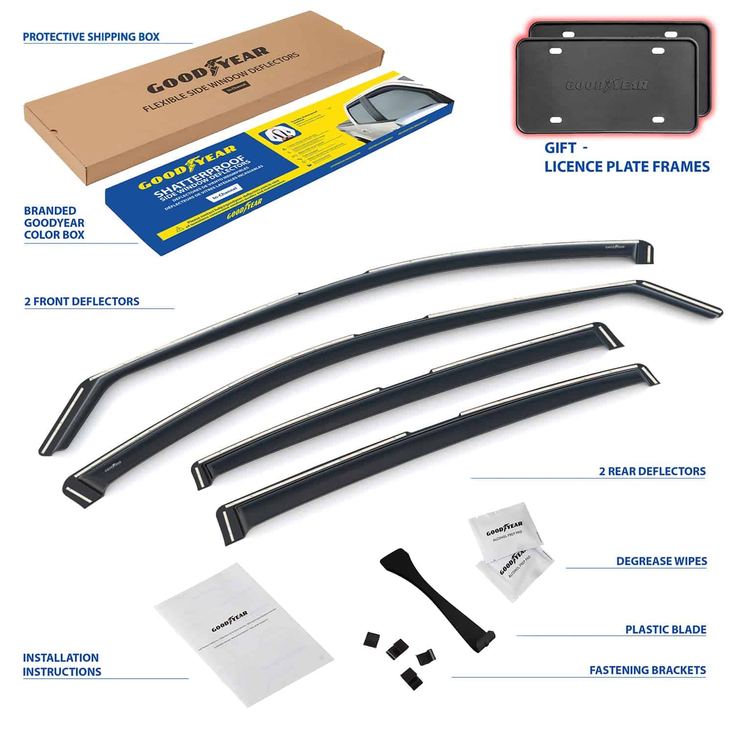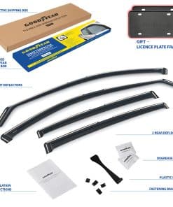 5. Obtenga un regalo perfecto ahora mismo: se incluyen 2 marcos de matrícula Goodyear en el juego. No se necesitan herramientas, simplemente pele y pegue estos visores de ventanas de lluvia. Incluimos toallitas desengrasantes para que el trabajo sea rápido. Esta sombra de ventilación es un gran regalo de cumpleaños o regalo navideño para cualquier persona a la que le guste conducir con la ventana abierta. Los deflectores de ventanas laterales vienen en una caja de color Goodyear protegida por una caja de envío marrón.