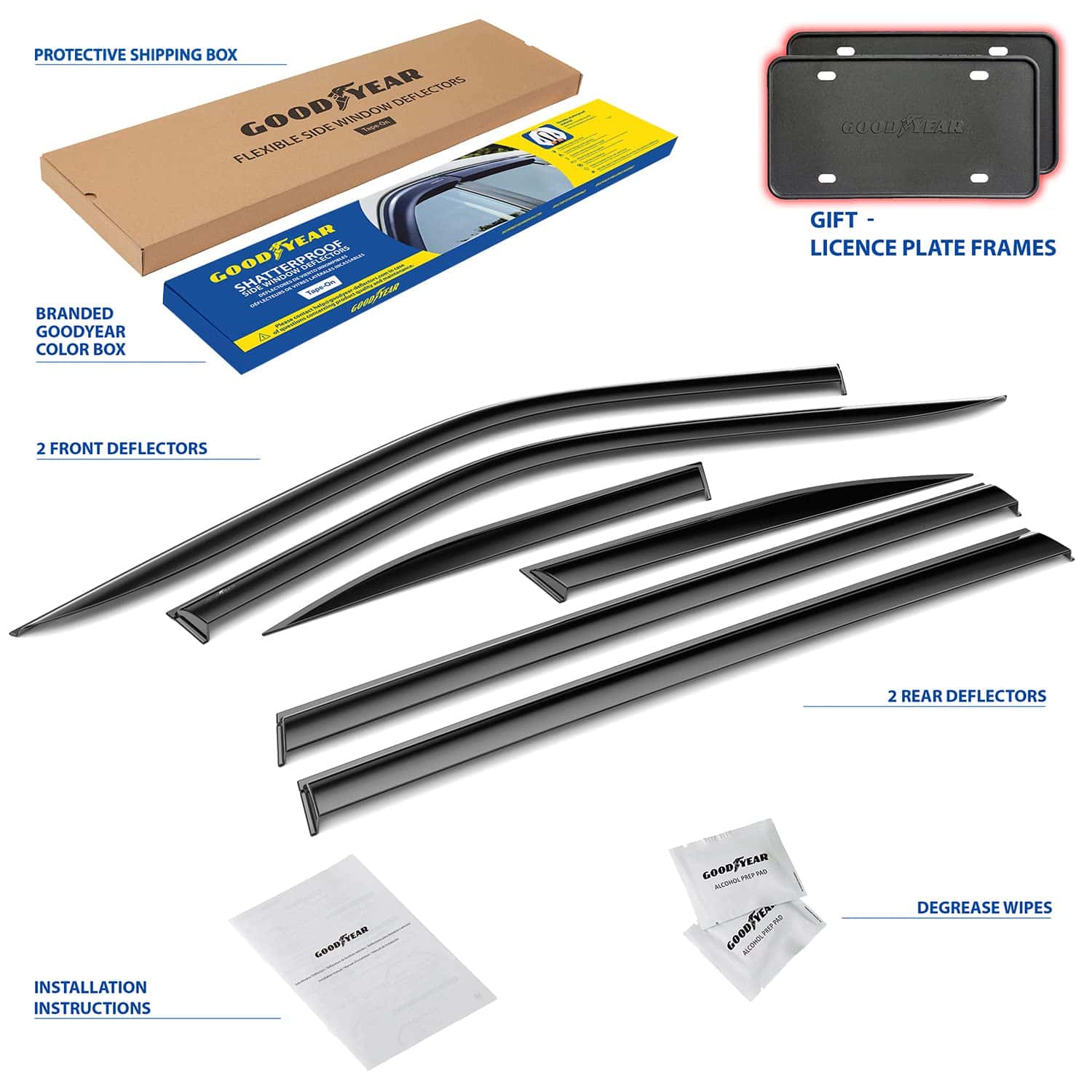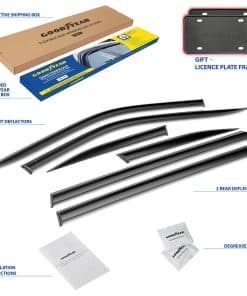 5. Obtén un regalo perfecto ahora mismo – 2 marcos de matrícula de Goodyear están incluidos en el set. No se necesitan herramientas, simplemente pega estos visores de ventanas rain guards. Incluimos toallitas desengrasantes para hacer el trabajo rápidamente. Este deflector de ventanilla es un excelente regalo de cumpleaños o de vacaciones para cualquier persona a la que le guste conducir con la ventana abajo. Los deflectores de ventanilla vienen en una caja de color Goodyear protegida por una caja de envío marrón.