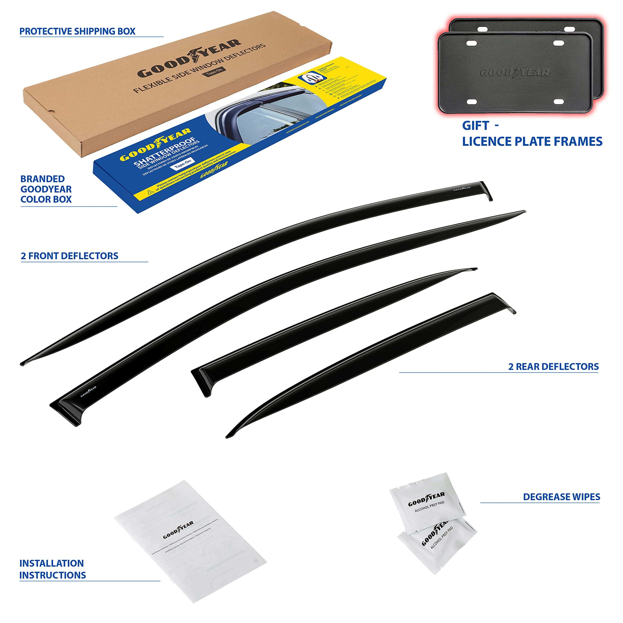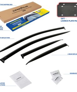5. Obtenga un regalo perfecto ahora mismo: se incluyen 2 marcos de matrícula Goodyear en el juego. No se necesitan herramientas, simplemente pele y pegue estos visores de ventanas de ventilación para la lluvia. Incluimos toallitas desengrasantes para hacer el trabajo rápidamente. Este deflector de ventanas es un gran regalo de cumpleaños o regalo navideño para cualquier persona a la que le guste conducir con la ventana abajo. Los deflectores de ventanas laterales vienen en una caja de color Goodyear protegida por una caja de envío marrón.