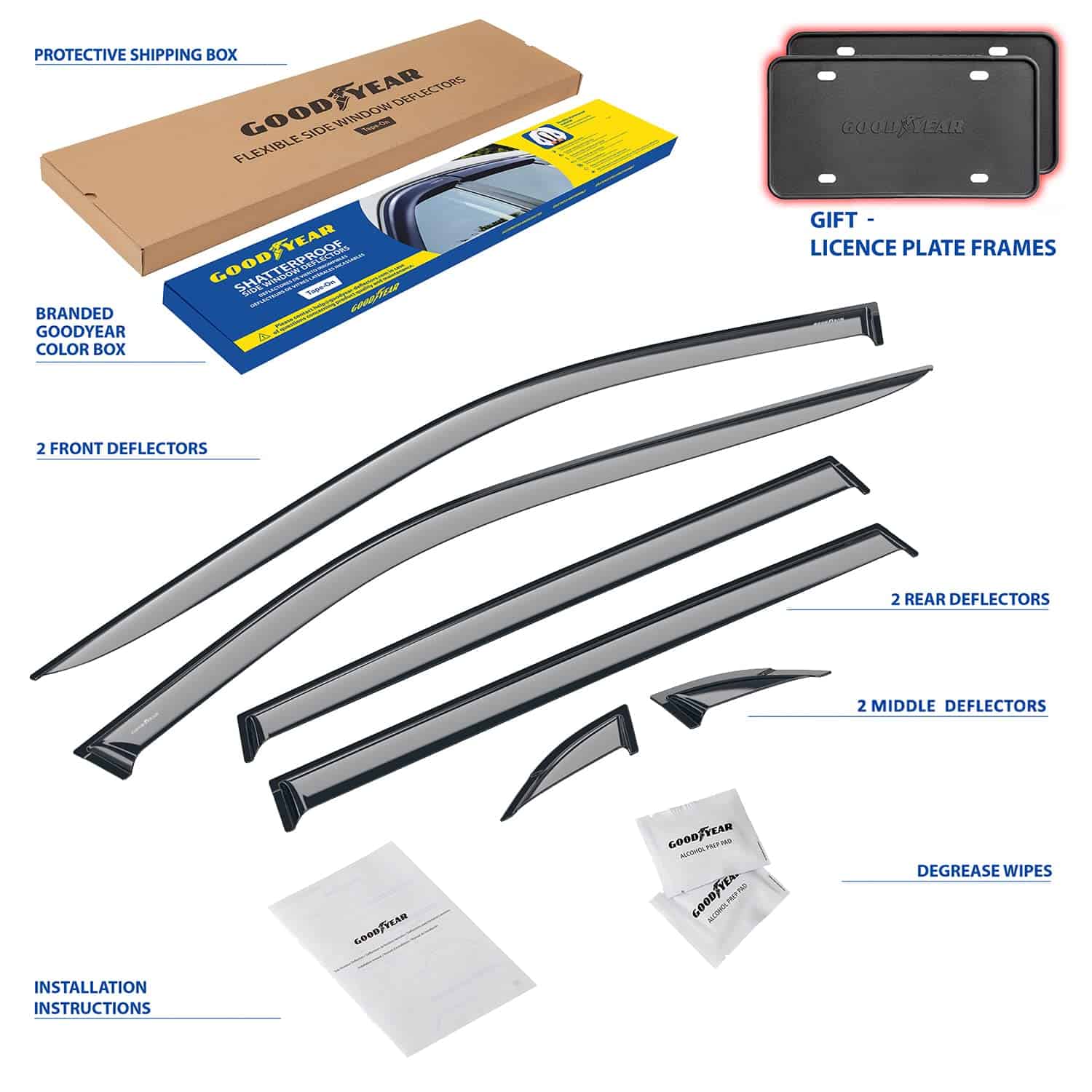 5. ¡Obtenga un regalo perfecto ahora mismo – se incluyen 2 Marcos de matrícula Goodyear en el conjunto. No se requieren herramientas, simplemente despegue y pegue estos deflectores de ventanas de ventilación de ventana. Incluimos toallitas desengrasantes para hacer el trabajo rápido. Este sombreador de ventilación es un gran regalo de cumpleaños o regalo navideño para cualquier persona a quien le guste conducir con la ventana bajada. Los deflectores de ventana lateral vienen en una caja de color Goodyear protegida por una caja de envío marrón.
