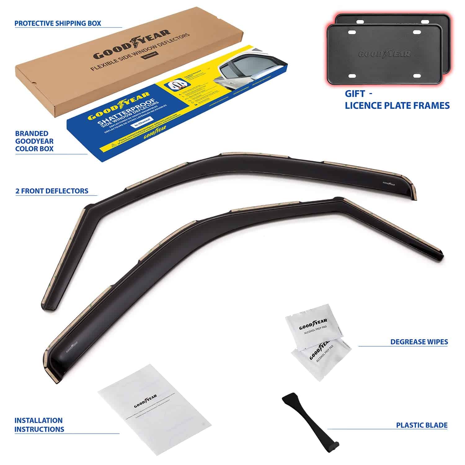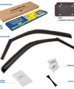 5. Obtén un regalo perfecto ahora mismo: se incluyen 2 marcos de placa de matrícula Goodyear en el set. Todas las herramientas incluidas, no requiere taladrar. Utiliza el kit de montaje completo y sigue las instrucciones para una instalación sin errores de los deflectores de viento. Ten en cuenta que después de instalarlo, la ventana debe mantenerse cerrada durante 72 horas. La visera de ventanas viene en una caja de color Goodyear protegida por una caja de envío marrón.