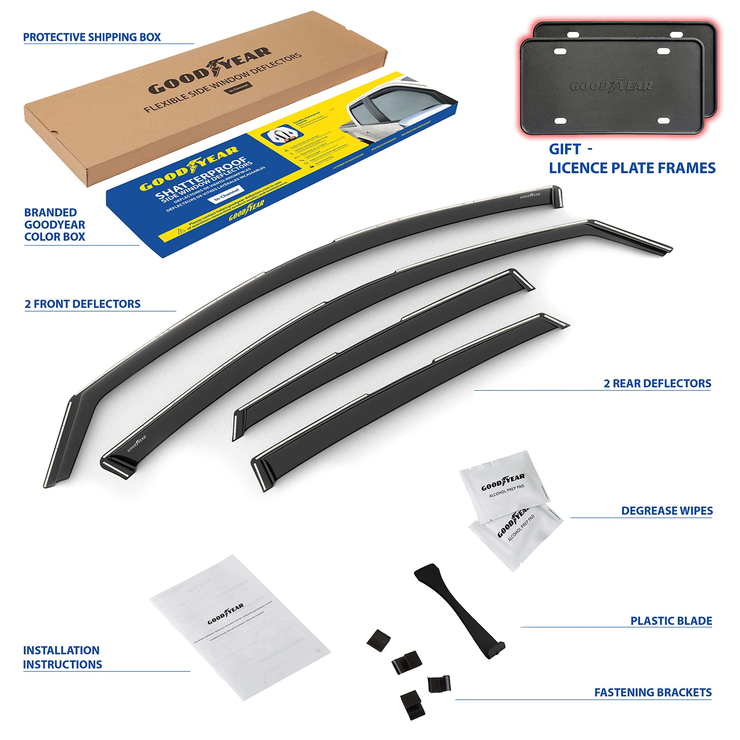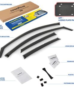 5. Obtenga un regalo perfecto ahora mismo – se incluyen 2 marcos de matrícula de Goodyear en el set. No se necesitan herramientas, simplemente pele y pegue estos visores de ventanas de automóviles. Incluimos toallitas desengrasantes para hacer el trabajo rápido. Este parasol es un excelente regalo de cumpleaños o regalo navideño para cualquier persona a la que le guste conducir con la ventana abierta. Los deflectores de ventanas laterales vienen en una caja de color Goodyear protegida por una caja de envío marrón.