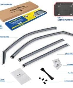 5. ¡Obtén un regalo perfecto ahora mismo! Se incluyen 2 marcos de matrícula de Goodyear en el set. Todas las herramientas incluidas. Sin necesidad de perforar. Utiliza el kit de montaje completo y sigue las instrucciones para una instalación sin errores del deflector de viento. Ten en cuenta que después de instalar, la ventana debe permanecer cerrada durante 72 horas. El visor de ventanas viene en una caja de color Goodyear protegida por una caja de envío marrón.