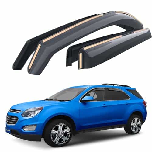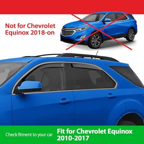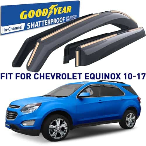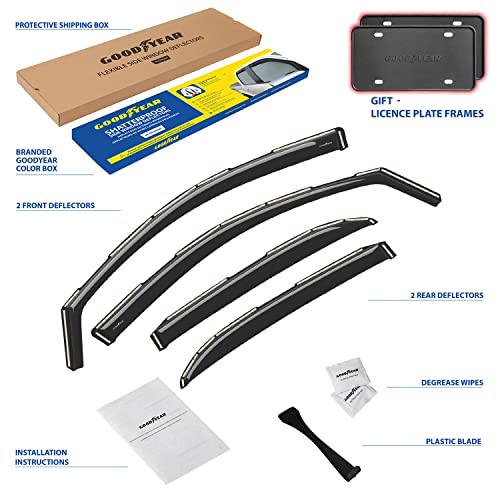 1. ¡Atención! El deflector de ventilación solo es compatible con Chevrolet (Chevy) Equinox 2010-2017. DEJE LA VENTANA CERRADA DURANTE 72 HORAS DESPUÉS DE LA INSTALACIÓN. 2. Los deflectores laterales premium de Goodyear le permiten bajar la ventana en lluvia, vientos fuertes, nieve y hielo. Estos visores de ventanas para la lluvia en automóviles lo mantienen seco mientras disfruta de aire fresco. Hechos de material irrompible de alta calidad y duradero. El protector contra la lluvia no se agrietará, romperá ni astillará. 3. La instalación en el canal brinda un ajuste perfecto y un aspecto elegante a su SUV. Asegúrese de que los deflectores de canal de Goodyear sean resistentes al agua y duraderos en todas las condiciones climáticas. Y ciertamente no se caerán en la carretera. 4. Se ha elegido un gran color perfecto para la protección solar. Se combina bien con todos los estilos y colores de vehículos. El color de esta sombrilla para ventana permanece rico año tras año. Estos son accesorios premium para automóviles que mejorarán el valor de su SUV, así como su disfrute y comodidad diarios. 5. Obtenga un regalo perfecto ahora mismo: se incluyen 2 marcos para matrículas de Goodyear en el juego. Todas las herramientas incluidas, no necesita taladrar. Utilice el kit completo de montaje y siga las instrucciones para una instalación sin errores del deflector de viento. Tenga en cuenta que después de instalar, la ventana debe mantenerse cerrada durante 72 horas. La visera para ventana viene en una caja de color Goodyear protegida por una caja de envío marrón.