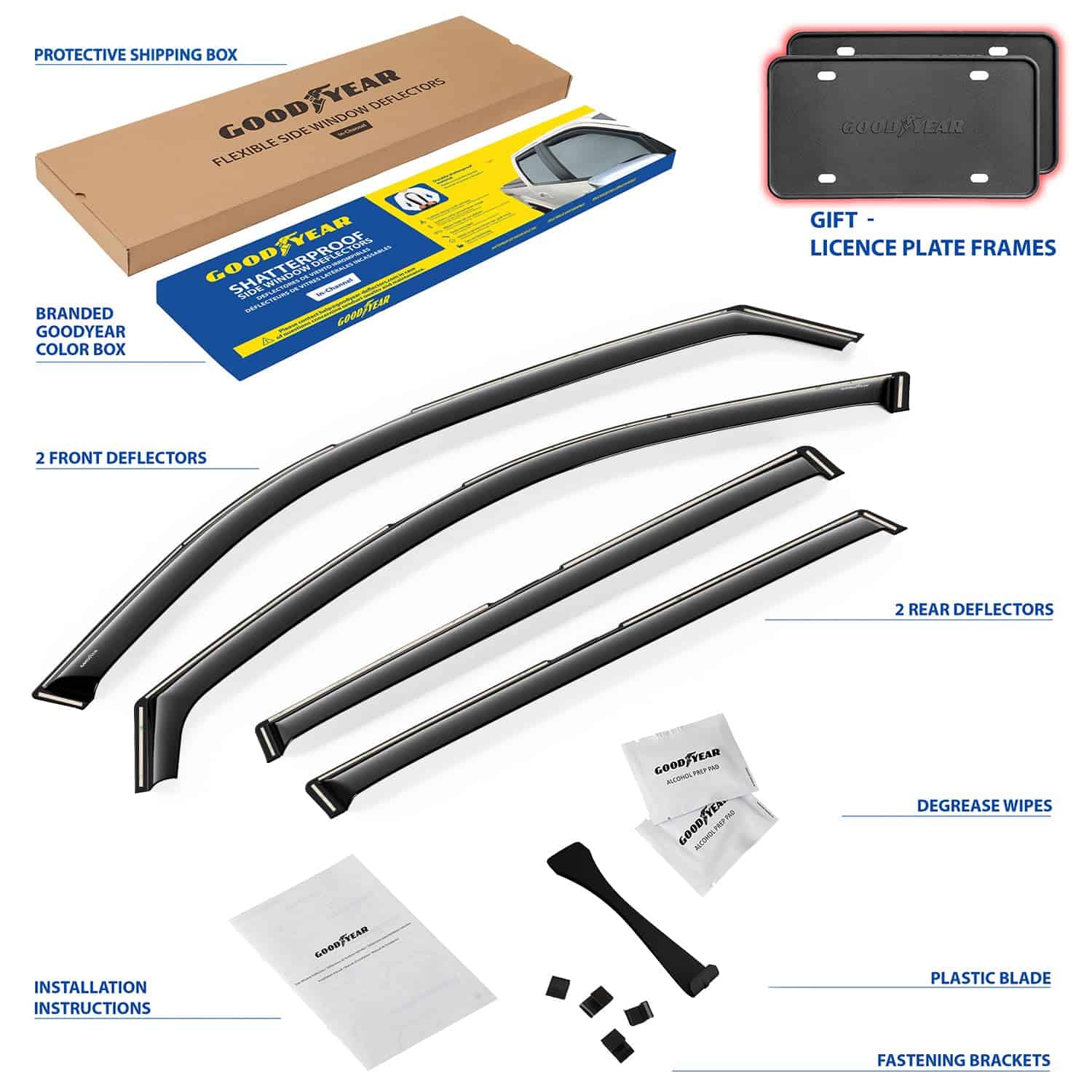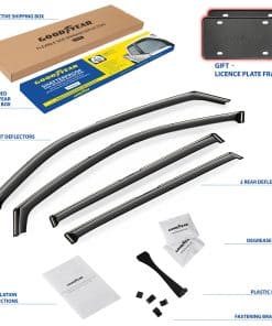 5. Obtén un regalo perfecto ahora mismo – Se incluyen 2 marcos de matrícula Goodyear en el juego. No se necesita herramientas, simplemente pega estos visores de ventana de ventilación de forma rápida. Incluimos toallitas desengrasantes para hacer el trabajo de forma rápida. Este guardabarros de ventilación es un gran regalo de cumpleaños o regalo navideño para cualquier persona a la que le gusta conducir con la ventana abierta. Los deflectores de ventanas laterales vienen en una caja de color Goodyear protegida por una caja de envío marrón.