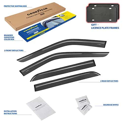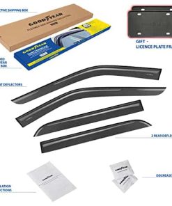 Los excelentes deflectores de ventanilla del coche de Goodyear permiten bajar la ventana en la lluvia, en vientos fuertes, en la nieve y en el hielo, manteniéndolo seco mientras disfruta del aire fresco. Estos accesorios para coches de alta calidad están hechos de material irrompible y duradero que no se agrietará, romperá ni astillará. El montaje con cinta fácil le permite colocar rápidamente estos visores de ventanilla sin necesidad de herramientas complicadas. La cinta VHB 3M ofrece un agarre seguro que durará en todas las condiciones climáticas. El color premium elegido es ideal para la protección solar y combina con todos los estilos y colores de vehículos, manteniendo su riqueza año tras año. Además, este conjunto incluye 2 marcos de matrícula de Goodyear como regalo especial. Las toallitas desengrasantes incluidas facilitan la instalación rápida. ¡Un gran regalo de cumpleaños o festivo para cualquier persona a la que le guste conducir con la ventana abajo! Los deflectores laterales vienen en una caja de color Goodyear protegida por una caja de envío marrón.