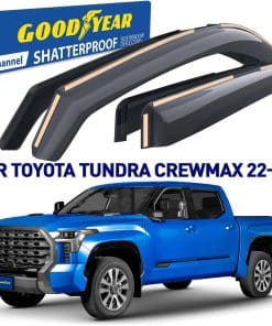 Los deflectores de ventanilla irrompibles de Goodyear están diseñados específicamente para adaptarse perfectamente a su Toyota Tundra 2022-2025 CrewMax. Estos deflectores de ventanilla laterales premium le permiten bajar la ventana en condiciones climáticas adversas como lluvia, vientos fuertes, nieve y hielo, manteniéndolo seco mientras disfruta de aire fresco en su vehículo. Hechos de material irrompible de alta calidad, estos guardabarros contra la lluvia no se agrietarán, romperán ni astillarán con el tiempo. La instalación en el canal proporciona un ajuste perfecto y un aspecto elegante para su camión. Los deflectores en el canal de Goodyear son resistentes al agua y duraderos en todas las condiciones meteorológicas, lo que garantiza que no se caigan incluso en carreteras accidentadas. El gran color elegido para estos deflectores ofrece una excelente protección solar, además de combinar a la perfección con cualquier estilo y color de vehículo. El color de esta sombra de ventilación se mantiene rico y vibrante a lo largo de los años, lo que garantiza que su camión se vea elegante y sofisticado. Además de la funcionalidad y el estilo, estos deflectores de ventanilla Goodyear también incluyen 2 marcos de matrícula Goodyear como regalo adicional. El kit de montaje completo facilita la instalación sin necesidad de taladrar, y se incluyen todas las herramientas necesarias para un proceso sin errores. Después de instalar los deflectores, se recomienda mantener las ventanas cerradas durante 72 horas para permitir que el sellado se cure por completo. Con una caja de color Goodyear protegida por una caja de envío marrón, estos deflectores de ventanilla son el complemento perfecto para su Toyota Tundra, mejorando tanto el valor de su vehículo como su comodidad diaria y disfrute.