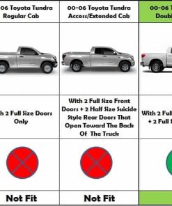 1. AJUSTE: Deflectores de viento para ventanas diseñados para Toyota Tundra Double/Crew Cab 2004-2006 con 4 puertas de tamaño completo únicamente (No apto para Regular Cab o Access Cab). 2. INCLUYE: Juego de 4 visores de ventanas (Incluye instrucciones de instalación). 3. DURADERO Y ELEGANTE: Nuestro deflector de ventilación está hecho con acrílico reforzado de alta calidad resistente e irrompible, no se doblará, romperá ni agrietará. El diseño flexible y aerodinámico de color humo oscuro se elige como el mejor para la protección solar, mejorando además la apariencia de su vehículo. 4. HAGA QUE LOS VIAJES SEAN AGRADABLES Y SEGURAS: Con nuestros guardabarros, podrá conducir con comodidad sin preocuparse por el ruido del viento, la nieve helada, las molestas salpicaduras de lluvia o el sol abrasador. Ayudan a mejorar la ventilación, reducen el empañamiento de las ventanas y mantienen la visibilidad clara para hacer los viajes seguros. 5. FÁCIL INSTALACIÓN: Diseño directo de adhesión, fácil instalación de Peel-N-Stick y sin molestias al subir y bajar las ventanas. Fáciles de quitar, no afectarán la apariencia de su vehículo (Sin cortes ni perforaciones).