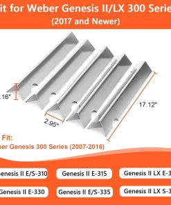 DELSbbq 66032 67095 66795 Barras Flavorizantes para Weber Genesis II 300 Series es una pieza de repuesto diseñada para parrillas de gas Weber Genesis II/LX 300 Series, específicamente para modelos de los años 2017 en adelante. Esta pieza es compatible con Genesis II E-310 E-315 E-330 E-335 S-310 S-335 Genesis II LX S/E-340 Genesis parrillas de gas. Hecho de acero inoxidable, cada juego incluye 5 Barras Flavorizantes con dimensiones de 17.12 » L x 2.95 » W x 2.16 » H cada una, con un espesor de 18 Ga. La función principal de la barra Flavorizante es prevenir que la grasa gotee en el tubo del quemador, protegiendo las llamas en la parrilla y distribuyendo mejor el calor del tubo del quemador por toda la caja de fuego. La instalación de este producto es sencilla, simplemente coloca la barra directamente sobre el tubo de combustión. Antes de ordenar, es recomendable verificar la longitud de tus barras existentes para garantizar un ajuste adecuado.