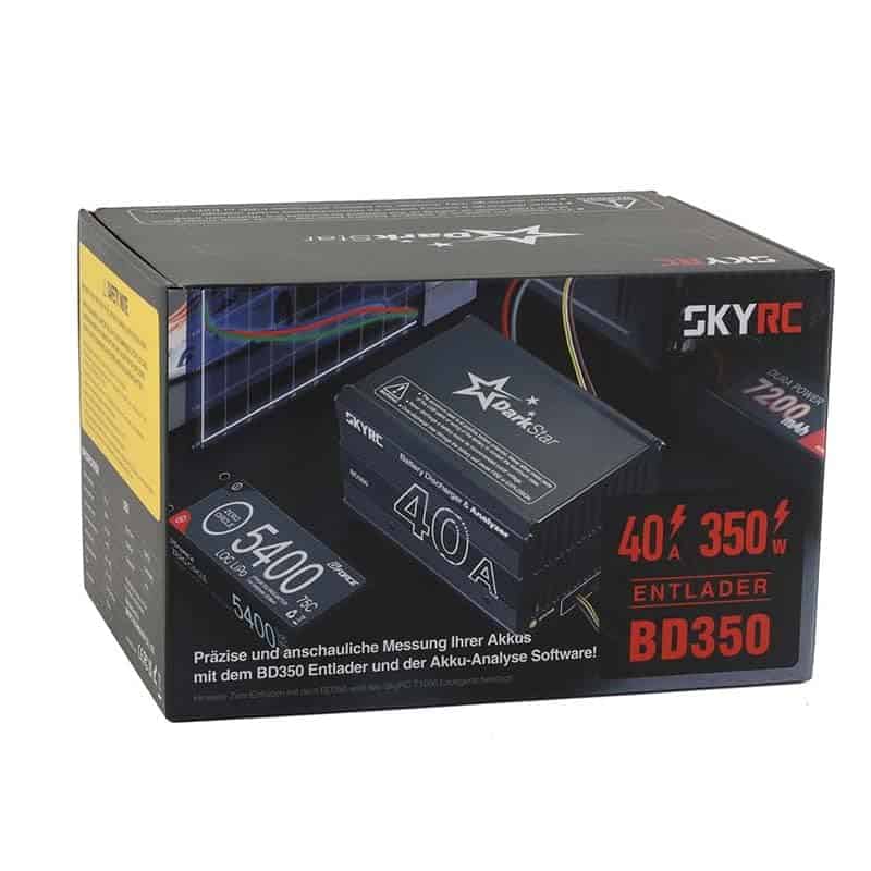 Este es el descargador y analizador de batería SKYRC BD350 (40A/350W). BD350 es más que un simple descargador de batería. Es un potente instrumento de prueba que mide, grafica y compara los parámetros de varias baterías. Permite la medición precisa de la capacidad y rendimiento de la batería. No más suposiciones al elegir la mejor batería para carreras de RC. Además, el descargador BD350 es compatible con la mayoría de las baterías de RC y funciona con los cargadores SkyRC T1000 y D200 NEO para proporcionar una corriente de descarga y potencia de hasta 40A y 350W. Cuando se combina con el cargador SKY RC T1000, se puede utilizar el SkyRC Charger Master3 personalizado para ver o exportar la curva de descarga de la batería en tiempo real con varias curvas de descarga de baterías que se pueden trazar para una comparación y análisis precisos, ¡así que las baterías defectuosas pueden ser detectadas de inmediato!