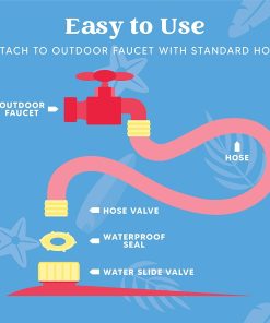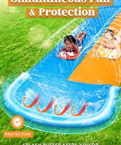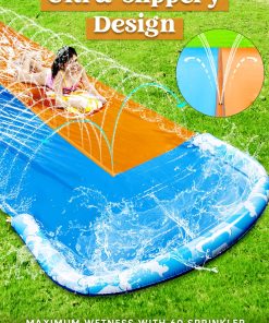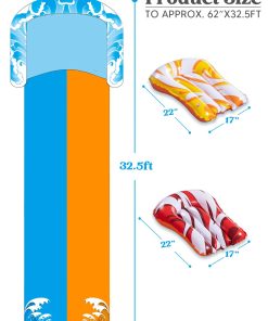 Título: Deslizadero de agua extra largo de 32.5 pies, Resbaladilla de agua de césped resistente con rociador y 2 tablas inflables para actividades de juego de agua al aire libre en el patio durante el verano. Incluye nuestro deslizadero de agua inflable Waves Double de 32.5 pies x 62 pulgadas con 2 tablas inflables, una rociador incorporado en uno de los lados, 6 estacas para el suelo. ¡Diviértete con este deslizadero de agua extra largo!
