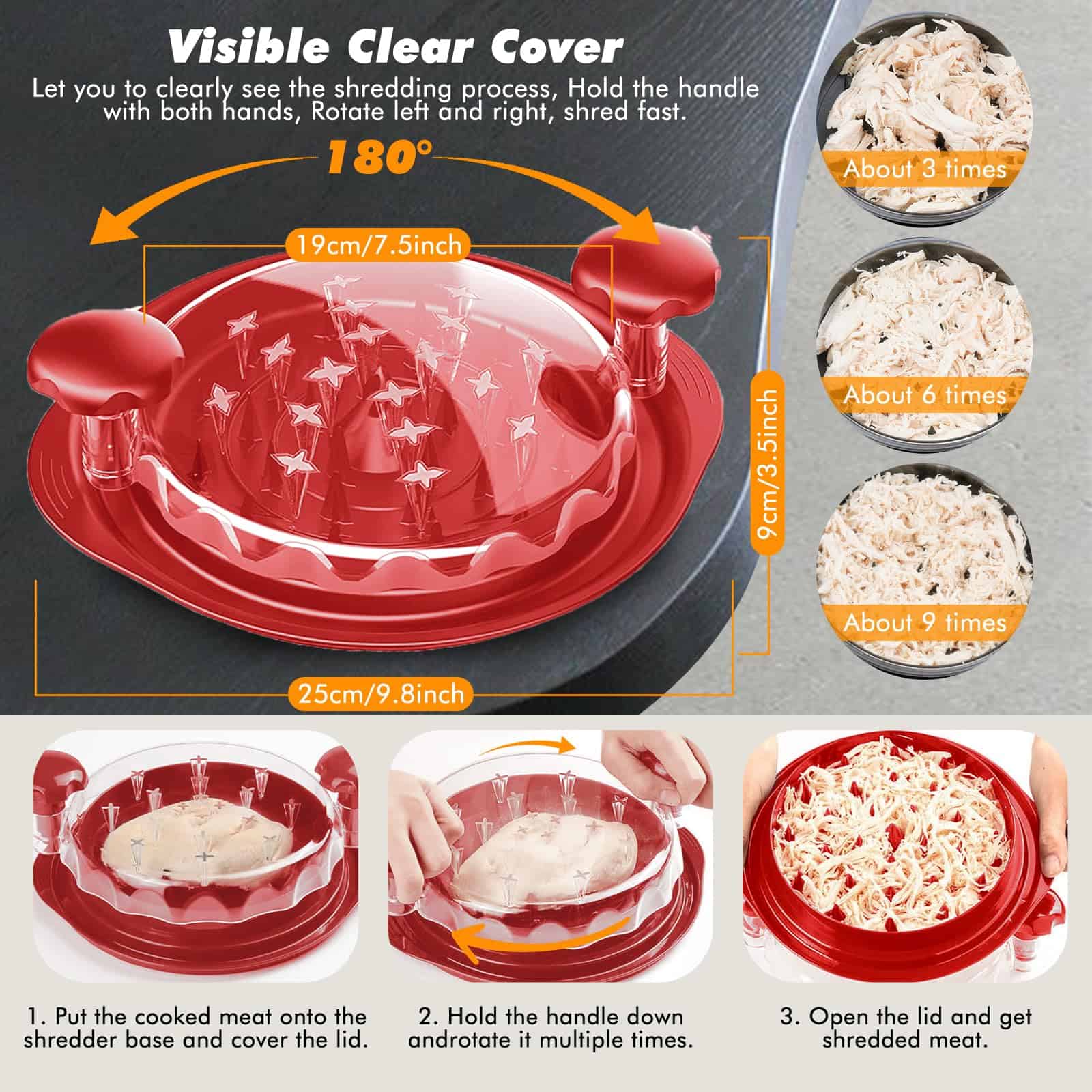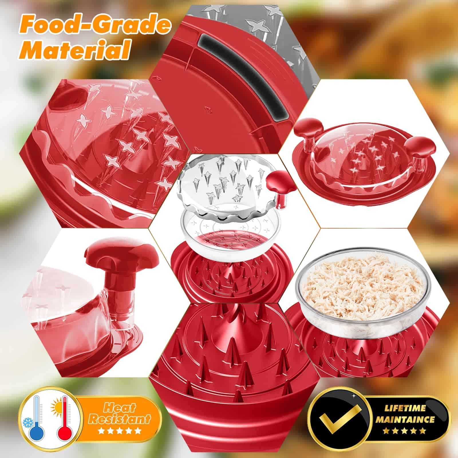 4. MATERIAL DE GRADO ALIMENTICIO Y APTO PARA LAVAVAJILLAS – El desmenuzador de carne rotativo está compuesto por plástico premium de grado alimenticio que es libre de BPA y resistente al calor hasta 356°F. Esta herramienta desmenuzadora de pollo de plástico nunca se derretirá en el lavavajillas o junto a la parrilla. Por favor, lea cuidadosamente las instrucciones, ya que pueden proporcionar orientación sobre cómo utilizar el desmenuzador de carne de pollo.