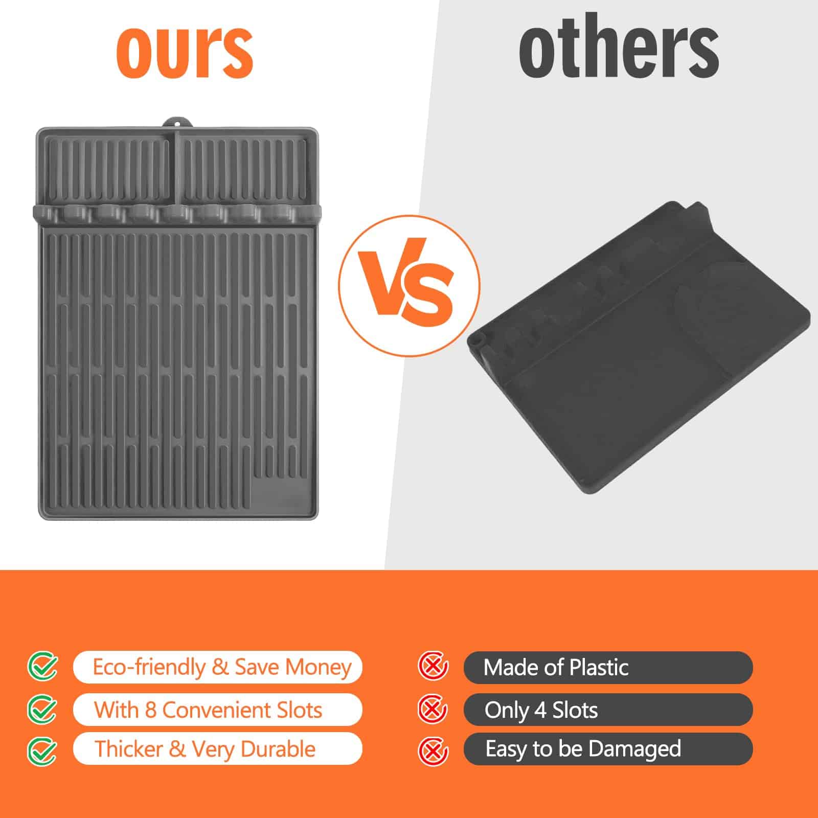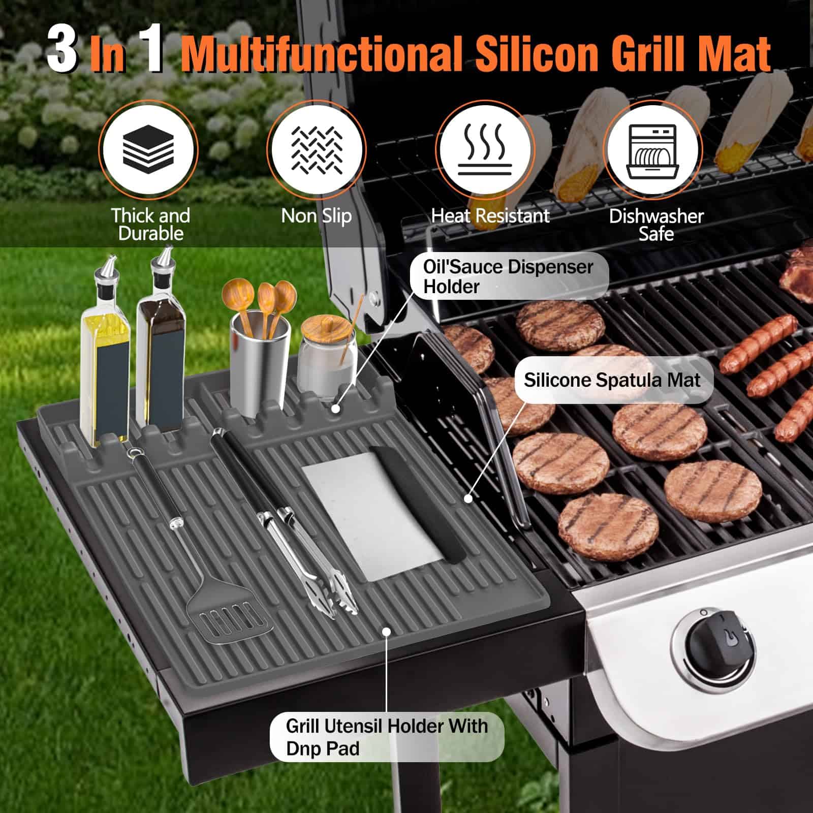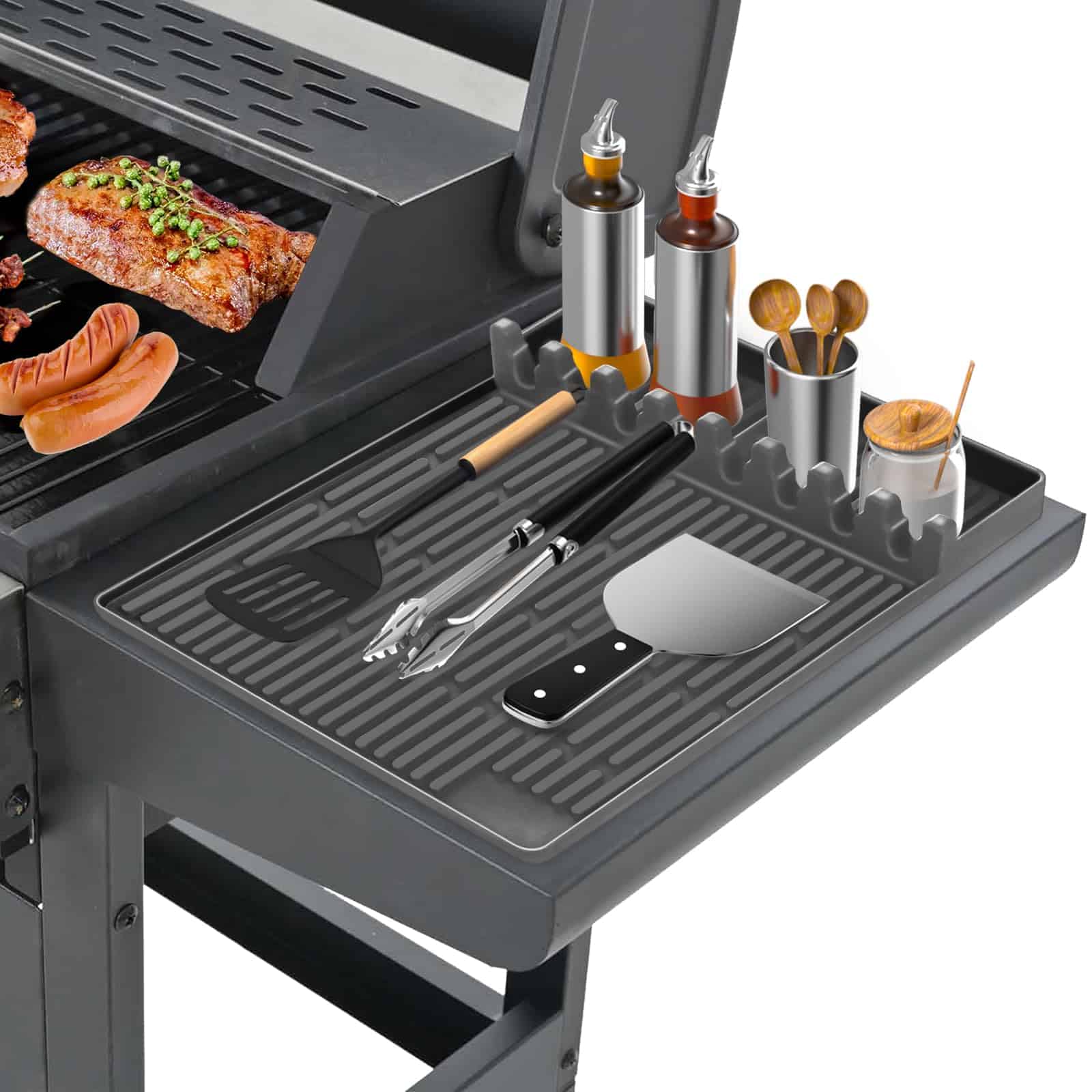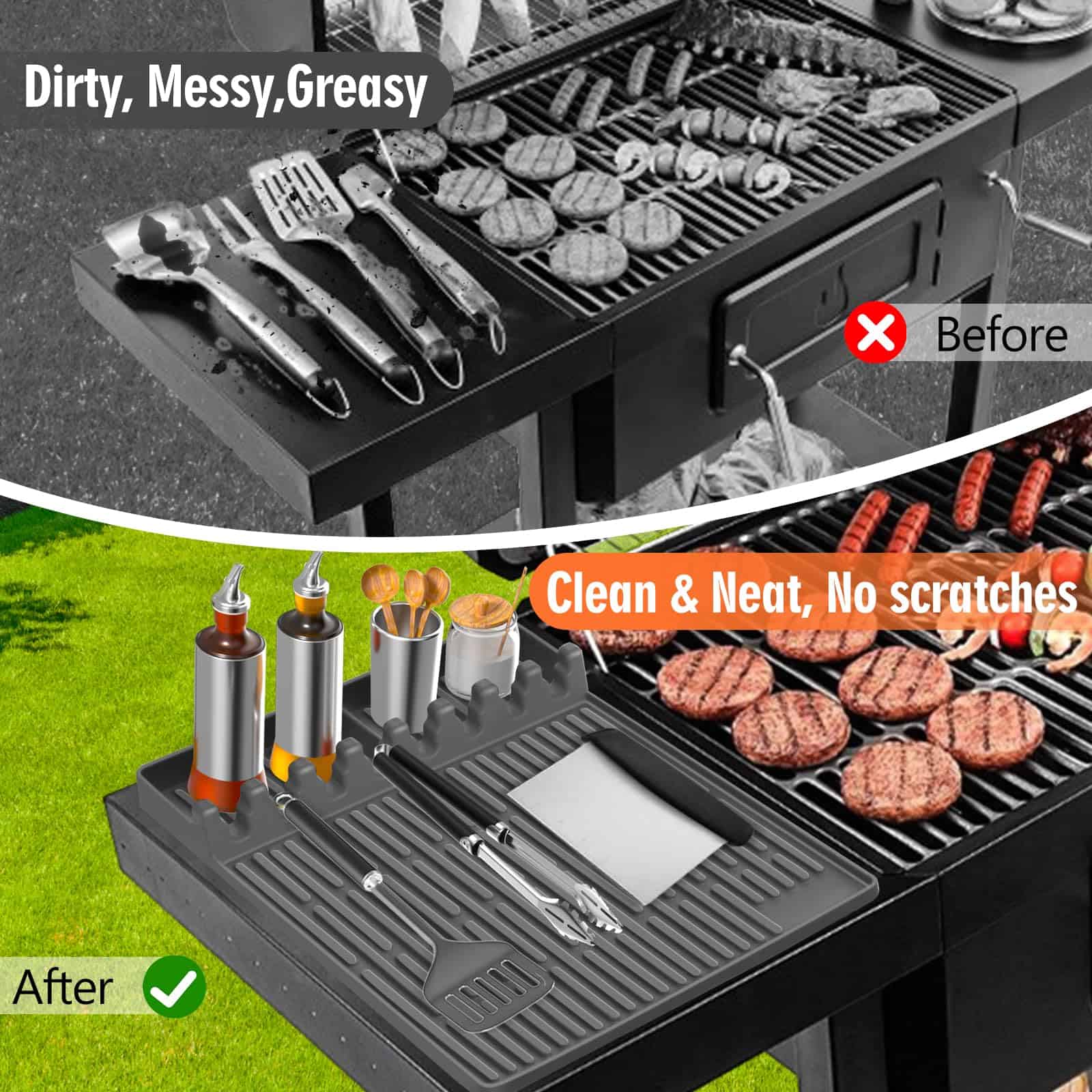 Experimenta un nuevo nivel de comodidad para parrillas con nuestro mat de parrilla de silicona. Este mat práctico y versátil es la adición perfecta a la configuración de la parrilla Blackstone de cualquier entusiasta de la parrilla. No solo actúa como un soporte para utensilios y frascos de condimentos, también protege las superficies, facilitando la limpieza después de tu BBQ. Con su diseño resistente al calor y fácil de limpiar, nunca ha sido tan sencillo hacer parrillas. ¡Un accesorio Blackstone imprescindible!