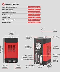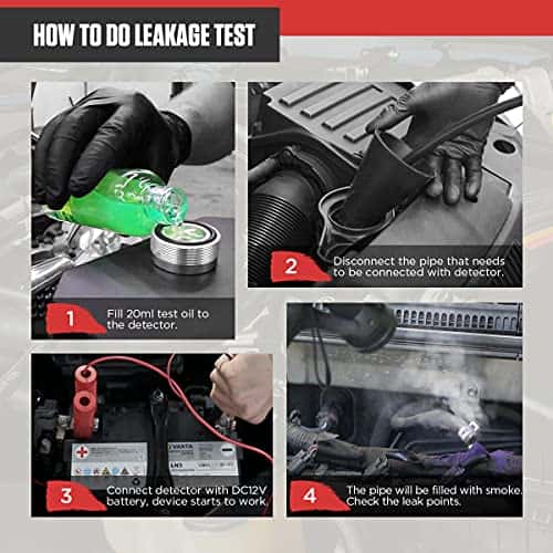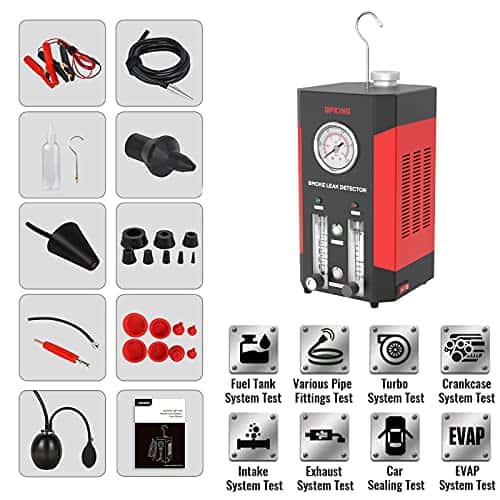 Cómo realizar la prueba de fugas: Llene 10 ml de aceite para bebé en el detector por primera vez. Abra la tapa del motor y cuelgue el detector en la tapa. Desconecte la tubería que necesita conectarse con el detector. Conecte el detector a la batería DC12V, encienda el interruptor de encendido y el detector comenzará a funcionar. En unos 30 segundos, la tubería estará llena de humo. Revise los puntos de fuga. Por favor, use lámpara de cabeza si es necesario. Advertencia: Cuando use este detector de fugas de humo para coches por primera vez, llénelo con 10 ml de aceite. Tenga cuidado de NO exceder este rango. El líquido de prueba: tanto la parafina líquida como el aceite para bebés están bien. El aceite fresco solo se puede llenar cuando el humo se vuelve delgado y no se puede llenar más de 20 ml cada vez. Antes de llenar aceite fresco, por favor, vierta el aceite restante en el detector y reemplace el aceite del detector regularmente. Durante el proceso de detección de fugas, manténgase alejado de las partes sensibles al humo. NO deje funcionar el detector durante más de 8 minutos continuamente. Necesita descanso por intervalos. El detector tiene un protector inteligente, si excede el límite de trabajo, como más de 75 , se apagará automáticamente la energía. En este caso, por favor, opérelo más tarde. La parte redonda de este detector tiene temperatura, tenga cuidado de evitar quemaduras. Si la tubería de prueba necesita desconectarse en el medio, asegure el otro lado con un tapón de goma. Lista de empaque: 1pc QPKING Detector de Fugas de Humo para Coche Unidad Principal 1pc Gancho (con tuercas de mano apretadas) 1 set Tapón de manguera de goma (con especificación en serie) 1pc Adaptador de cono estándar 1pc Abrazadera para cable de alimentación 1pc botella de aceite (aceite no incluido) 1pc Conector especial EVAP 1pc manguera de humo 1pc Adaptador de airbag universal 1pc Manual de usuario