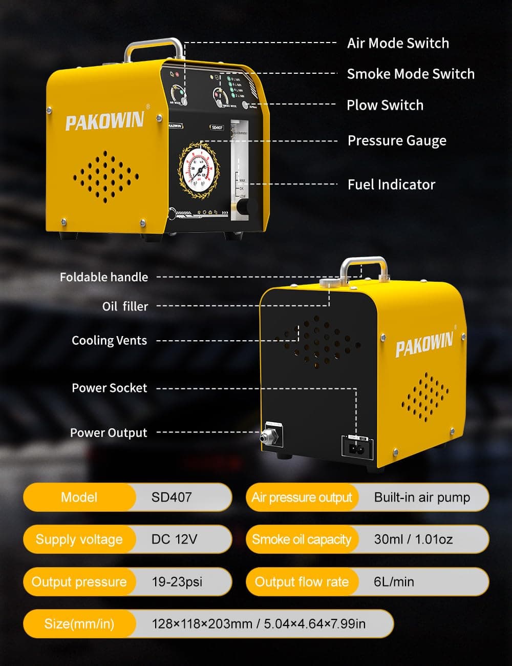 Equipado con una potente bomba de aire incorporada, este probador de humo para autos elimina la necesidad de una fuente de aire externa, haciendo que la operación sea más conveniente y eficiente. La bomba de aire integrada mejora la precisión de detección al garantizar un flujo de humo constante y continuo, mejorando la eficiencia general.