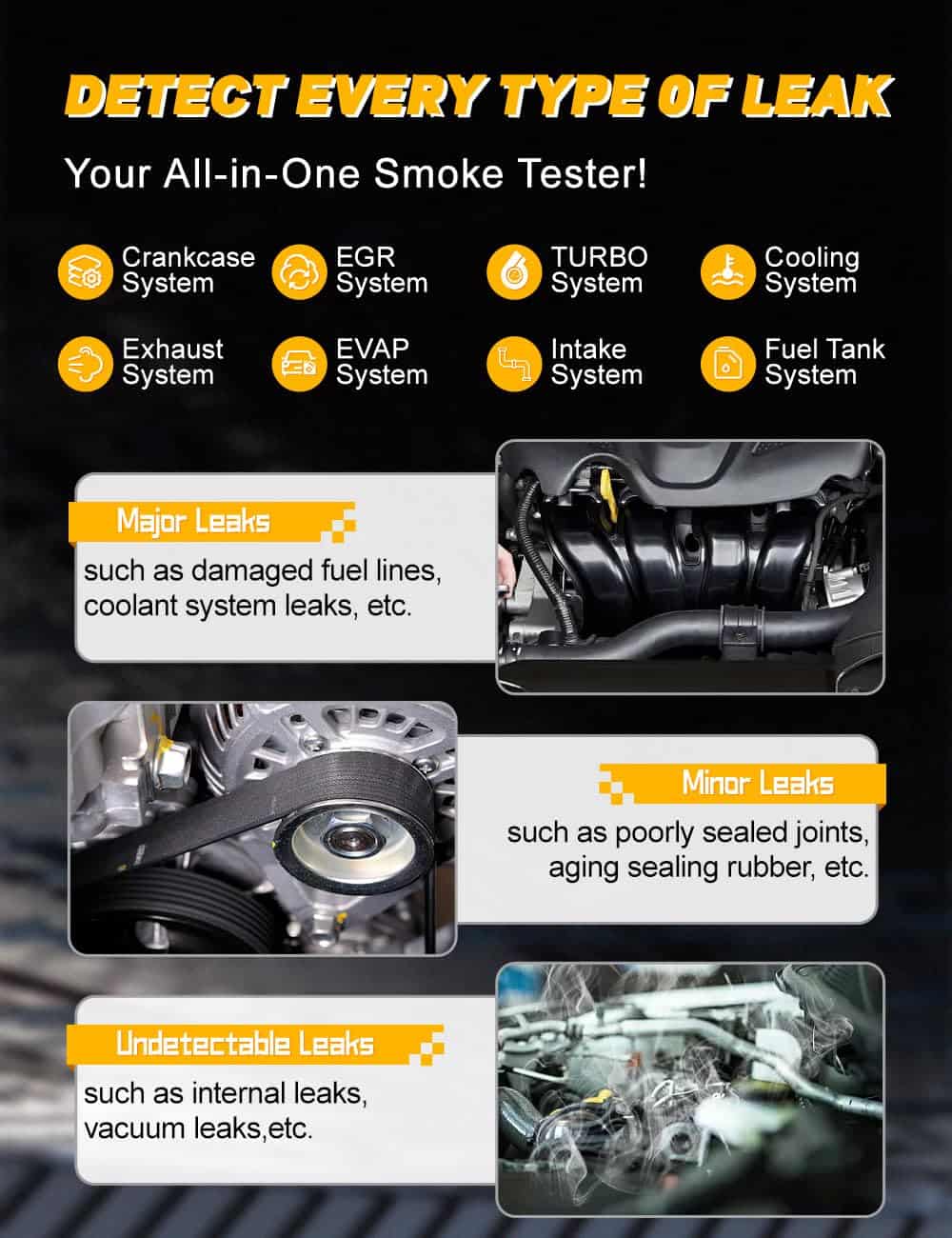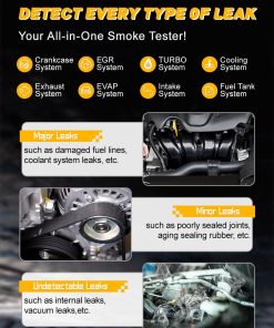 Además de los sistemas de escape automotrices, este detector de fugas de humo evap también es adecuado para su uso con sistemas de combustible, sistemas de enfriamiento y otros sistemas de tuberías que requieren detección de fugas. Su amplia aplicabilidad y alta fiabilidad lo convierten en una herramienta esencial para reparaciones automotrices, inspecciones de motores y mantenimiento de rutina.