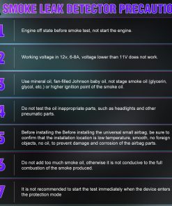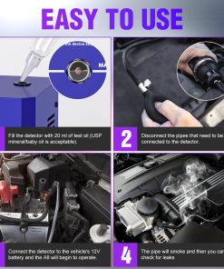 1. ¿Por qué lo necesitas Por ejemplo, una manguera de vacío rota resultará en una mezcla demasiado rica, aumento de la velocidad en ralentí, mal arranque en caliente, brincos del motor al acelerar, un aumento significativo en el consumo de combustible y humo negro por el tubo de escape. El bloqueo llevará a la deriva en ralentí, ralentí fácil de apagarse. Una fuga en la tubería de vacío conducirá a un funcionamiento débil del motor.n2. Compatibilidad El detector de fugas de humo automotriz VXSCAN A8 puede realizar diversas pruebas como: prueba del sistema EVAP, prueba de sellado del automóvil, prueba del sistema de tanque de combustible, prueba del sistema de escape, prueba del sistema de admisión y diversas pruebas de accesorios de tubos, etc. Se puede utilizar en todos los autos, motocicletas, motonieves, cuatrimotos, camionetas ligeras, botes, etc.n3. Bomba de aire incorporada y modos duales para aire y humo El detector de fugas de humo EVAP VXSCAN A8 no solo tiene una bomba de aire incorporada, sino que también tiene un manómetro y un medidor de flujo ajustable. El compresor genera una presión de aire de 1.03Bar/15Psi, lo que permite introducir fácilmente humo en el sistema de sellado probado, acelerando el proceso de detección de fugas. Dos formas de resolver rápidamente las fugas: el modo de aire te ayuda a determinar si hay una fuga; y el modo de humo te ayuda a localizar las fugas.n4. Fácil de usar 1. Llena 10 ml-20 ml de aceite de bebé Johnson etiqueta rosa (el aceite más adecuado) en el detector. 2. Desconecta la tubería de admisión del auto. Conecta la tubería de admisión del auto con el detector. 3. Conecta el detector con la batería de 12V DC y comienza a funcionar. 4. La tubería se llenará de humo. Revisa los puntos de fuga. Nota El empaque no contiene aceite pero sí una botella dosificadora de aceite.n5. MEDIDOR DE FLUJO DE AIRE AJUSTABLE Y MANÓMETRO Puedes controlar fácilmente la presión del aire, porque si la presión del aire es demasiado alta, la tubería se dañará, y si la presión del aire es demasiado baja, la fuga no se detectará; Puedes observar el barómetro para determinar si la tubería del auto está perdiendo. Si el índice del barómetro sigue aumentando, no hay problema con la tubería de tu auto. Por el contrario, las fugas en la tubería de tu auto necesitan ser reparadas.n6. ADVERTENCIA El detector de fugas de humo EVAP no puede conectarse a la fuente de alimentación de 12V en la oficina, o no puede emitir humo. Solo es compatible con una batería de 12V con un rango de corriente de 8A-10A (las baterías de automóviles normales son elegibles). Si tienes alguna pregunta, puedes contactarnos primero, estamos aquí todo el tiempo.