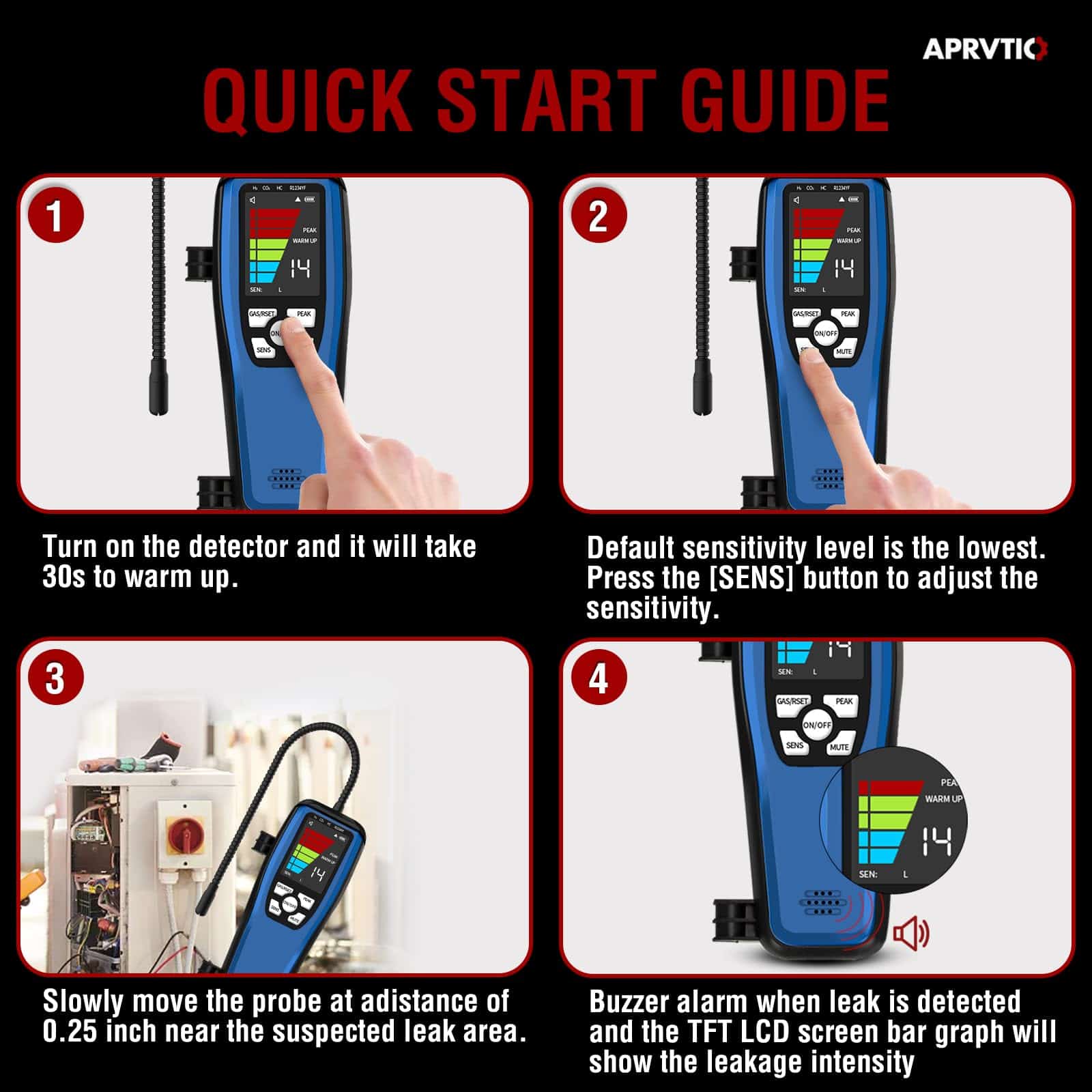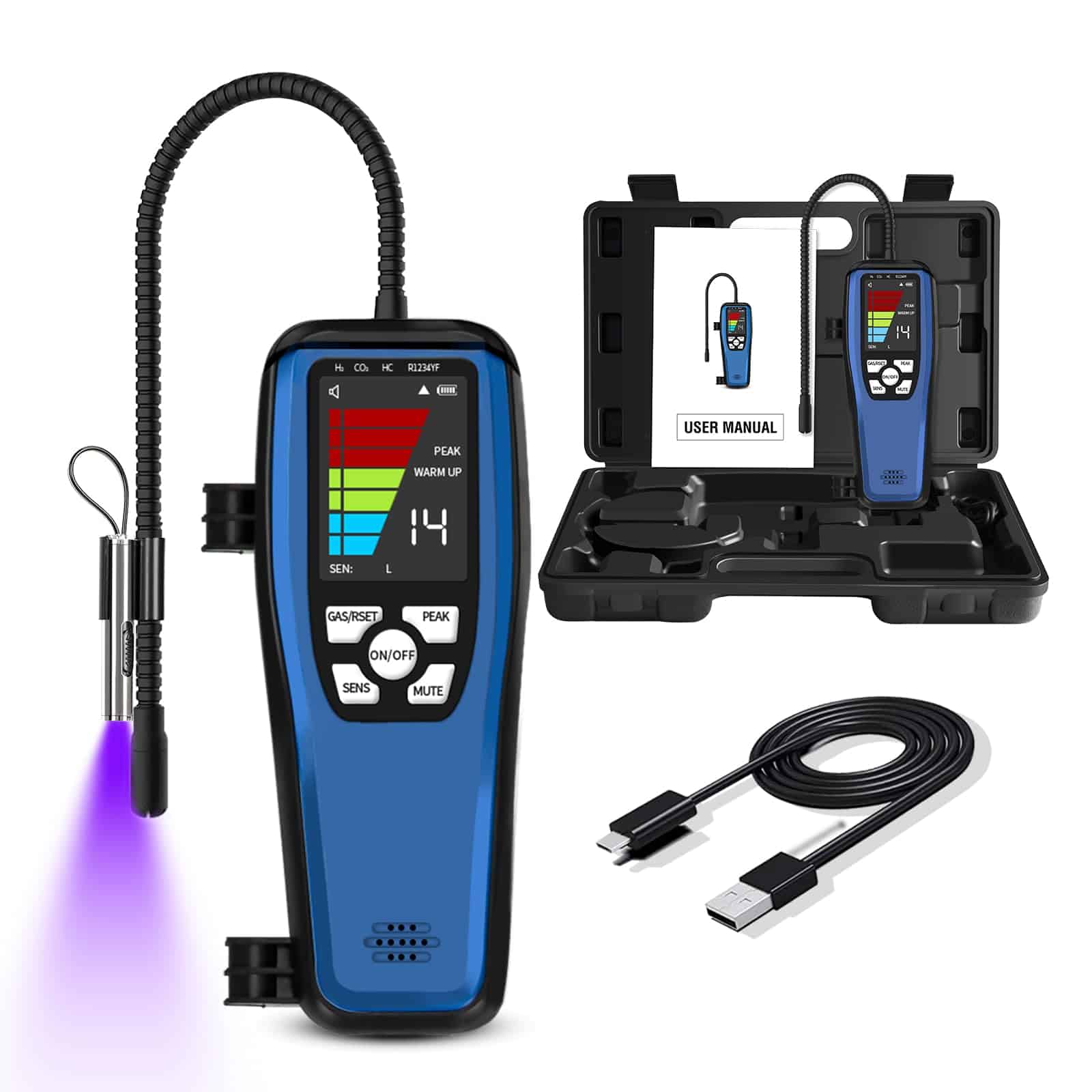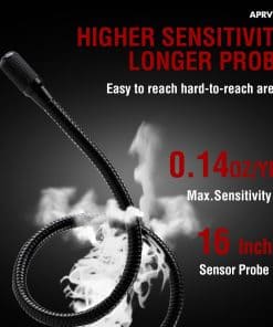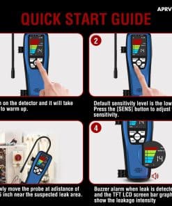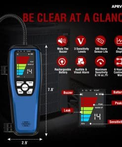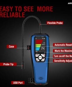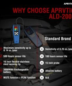 1. Alta Sensibilidad y Ajustable en comparación con los detectores de fugas de freón tradicionales, el detector de fugas ac ALD-200 es más preciso y menos susceptible a interferencias de otros gases. 3 modos de sensibilidad con una sensibilidad máxima de hasta 0.14 oz./año. 16 sondas de sensor pulgadas del detector de fugas de hvac que le permite llegar a áreas de difícil acceso.