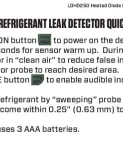 Detector de Fugas de Refrigerante de Diodo Calentado hilmor LDHD250 para HVAC y Refrigeración es altamente preciso, sensible y duradero, superando a todos sus competidores en confiabilidad. Con notificaciones auditivas y visuales para la detección de fugas, este detector es fácil de usar y cuenta con una pantalla LCD que facilita la lectura. Su versatilidad lo hace compatible con todos los refrigerantes halogenados, como R410 y R22. Además, su sonda flexible permite el acceso a áreas de difícil alcance, lo que lo hace la herramienta ideal para técnicos de HVAC.