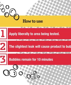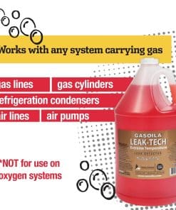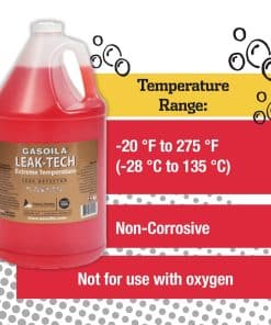 Gasoila leak-tech gold está diseñado específicamente para su uso en líneas de gas, cilindros de gas, condensadores de refrigeración, líneas de aire, bombas de aire o cualquier otro sistema que transporte gas. Se puede utilizar en todo tipo de tuberías. Fórmula no tóxica, no corrosiva. No apto para sistemas de oxígeno. Rango de temperatura: 28 a 180 grados F. Tamaño: botella de 1 galón.