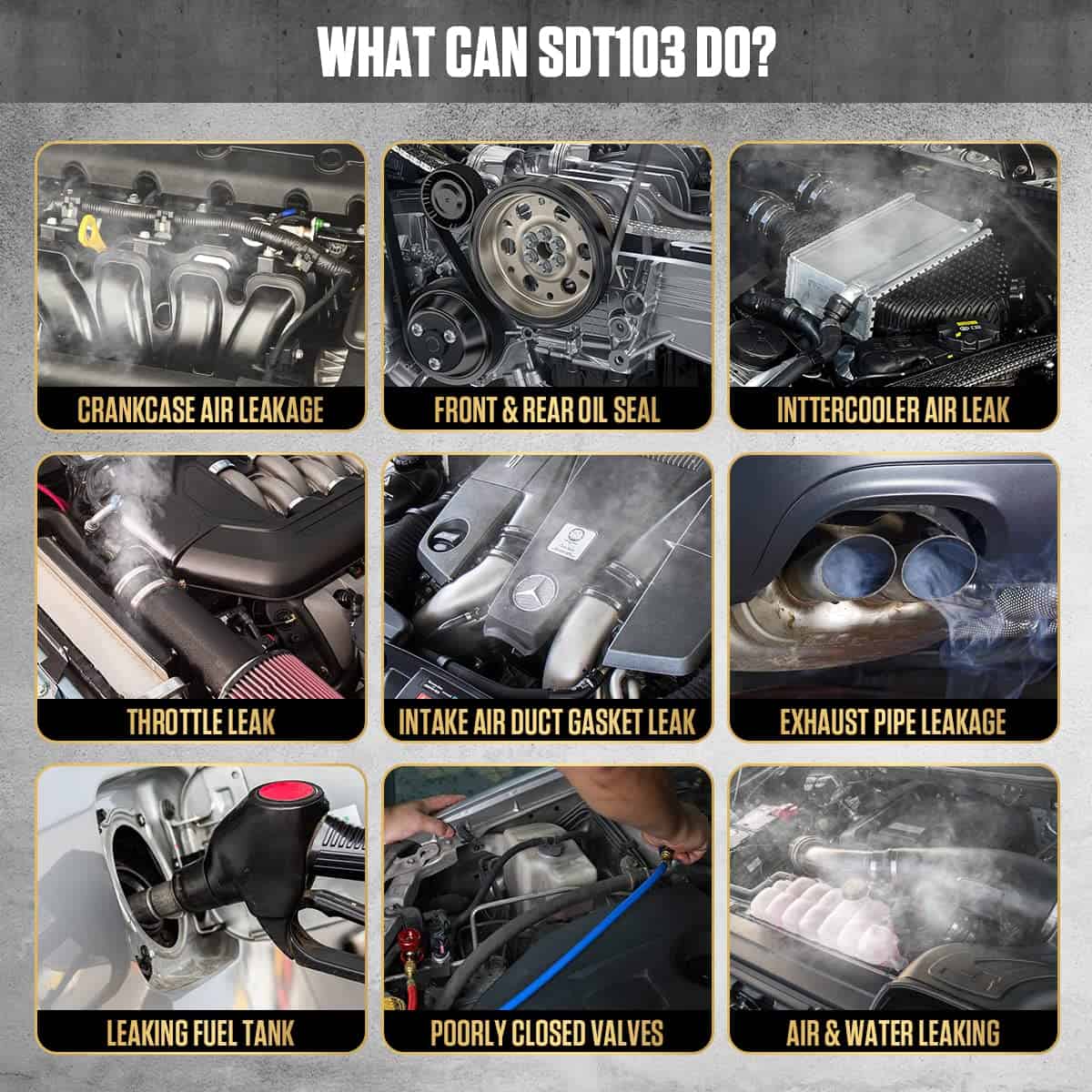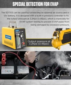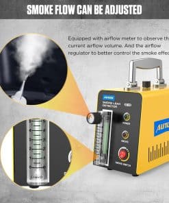 Detector de Humo Automotriz para Fugas, Probador de Diagnóstico de Humo de Vacío Evap, Detector de Fugas de Combustible Compatible con Vehículos de 12V. El Detector de Fugas de Humo SDT103 de AUTOOL no cuenta con una bomba de aire interna, por lo que necesitará conectarlo a una fuente de aire de taller externa y una fuente de alimentación de 12V del vehículo para introducir aire del taller. Gire el dial de control de flujo del detector en sentido antihorario para abrir el flujo de aire y luego encienda la alimentación en la parte trasera del dispositivo. Esto iniciará la máquina, generando humo. (Al agregar aceite de humo al detector, asegúrese de que no exceda los 20 ml y utilice aceite de bebé o aceite de parafina). Puede controlar fácilmente la presión del aire con el medidor de flujo externo, protegiendo su sistema de detección de manera más efectiva. Realice pruebas de humo en múltiples sistemas como sistemas EVAP, sistemas de admisión, sistemas de enfriamiento / EGR / escape, sistemas de cárter, hermeticidad del motor, fugas de vacío, fugas de turbo de baja presión. Apto para autos, motocicletas, vehículos todoterreno, ATVs, camionetas ligeras y botes de velocidad. Con 3 años de garantía y mantenimiento de por vida para daños causados por factores no humanos. Esperamos su demanda y le responderemos en 24 horas.