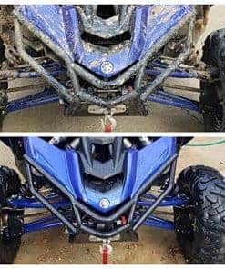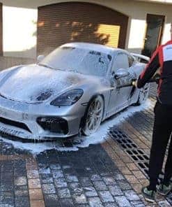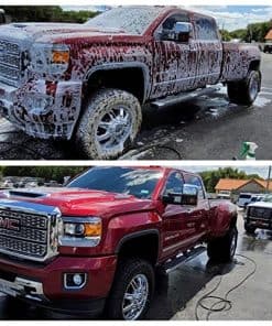 Detergente para lavado de autos sin contacto de alta resistencia que incluye lanza de espuma profesional. Detergente para lavado de autos de grado comercial con desengrasante de alta resistencia que contiene concentrado alcalino activo y TFR (Removedor de película de tráfico) incluyendo lanza de espuma. PRO-100 crea una espuma activa densa que fue diseñada específicamente para autos, camiones, motocicletas u cualquier equipo de gran tamaño. También se puede utilizar para lavar motores. ¡Lavado de autos sin cepillado ni contacto! Disuelve y emulsiona cualquier tipo de suciedad de origen orgánico o no orgánico. Hace que las superficies brillen y proporciona una película protectora en todas las superficies pintadas, metálicas, plásticas o de goma. Su fórmula única permite la eliminación total y rápida de la suciedad sin efectos secundarios en las piezas de tu vehículo. Cómo usar el jabón con lanza de espuma Wash Chems: Utilice la siguiente tasa de dilución de 1 a 3 hasta 1/5. Nuestra lanza de espuma funciona con lavadoras a presión eléctricas y de gas. Rocíe la espuma en cualquier superficie – espere 1-2 minutos y luego use la lavadora a presión para enjuagar y obtener una superficie limpia. ESPECIFICACIONES DE LA LANZA DE ESPUMA: – Contenedor HDPE de boca grande de 32 OZ – Rango de presión de funcionamiento de 800-3,500 PSI; compatibilidad de lavadoras a presión de 1.4-5.3 galones por minuto – Válvula de respiración de alto flujo mezcla la cantidad perfecta de aire con el agua a alta presión y jabón para lavado de autos para crear una espuma densa que se adhiere – Boquilla ajustable rocía espuma desde un chorro jabonoso de 0 grados hasta un amplio ventilador de 90 grados – Rocía espuma espesa de lavado de autos sobre cualquier vehículo, satura la suciedad y los desechos antes de reducir las posibilidades de arañazos. No se requiere cepillado cuando se usa con productos de espuma activa de Wash Chems. – Patrón de pulverización ajustable (horizontal o vertical) con un giro de muñeca. – Conector rápido de acero inoxidable – Orificio de 1.1mm (ayuda a aumentar la presión y obtener una espuma gruesa durante la salida) Lava autos de forma más eficiente, ¡solo un galón de Wash Chems es equivalente a usar diez galones de una marca competidora. Dependiendo de la proporción de dilución utilizada, un galón de Wash Chems PRO-50 puede lavar hasta 25 camiones!
