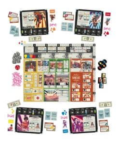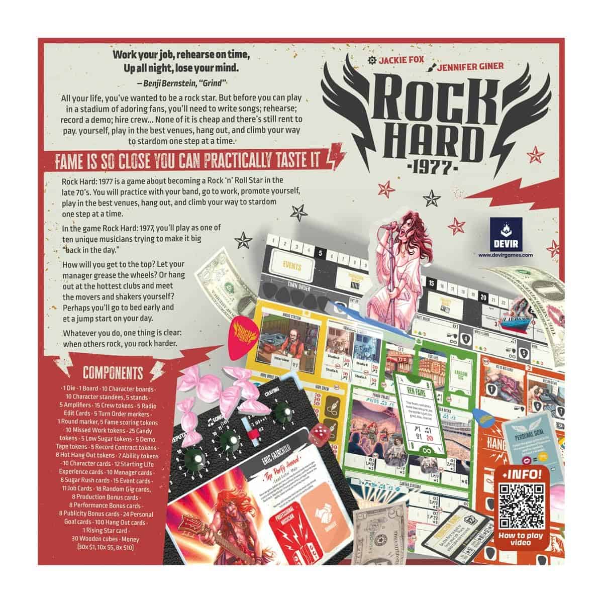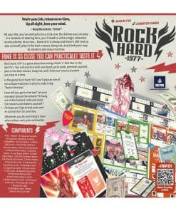 El año es 1977. Eres un músico prometedor y sueñas con el éxito junto a tu banda. Durante los próximos meses ensayarás, realizarás conciertos, escribirás canciones y promocionarás tu banda. Con una planificación cuidadosa y un poco de suerte, te convertirás en más famoso que todos los demás y te convertirás en el artista revelación del año. Diseñado por la legendaria estrella de rock y amante de los juegos de mesa Jackie Fox (que formó parte de la banda de rock de los 70 The Runaways) e ilustrado por Jennifer Giner, Rock Hard: 1977 permite juegos para grupos de entre 2 y 5 jugadores, a partir de 14 años, en sesiones de entre 45 y 90 minutos. A través de mecánicas de colocación de trabajadores, los jugadores asumirán el papel de una estrella de rock en ascenso y competirán para obtener la mayor cantidad de puntos de Fama a lo largo de varias rondas de juego. Rock Hard: 1977 se juega a lo largo de un máximo de nueve rondas, cada una representando un día típico de un mes en 1977, de abril a diciembre. Ganas el juego acumulando la mayor cantidad de Fama. ¿Y cómo se puntúa la Fama Aumentando tu reputación, habilidades y calidad de canciones, ganando bonificaciones de producción, actuación y publicidad, firmando contratos discográficos y regalías, realizando conciertos y pasando el rato en los lugares de moda más calientes. Cada jugador tendrá un manager único, que les ayudará a impulsar su carrera musical con una habilidad particular. Por supuesto, tendrás que pagar por su trabajo si no quieres perder puntos de Fama. Y a veces un roquero necesita un poco de ayuda para superar un día difícil… Es por eso que los jugadores también pueden consumir caramelos para tomar un turno extra y realizar más acciones… Pero abusar de los dulces puede provocar un subidón de azúcar. El juego tiene una producción excepcional. Solo para dar algunos ejemplos: el tablero personal de cada jugador está diseñado como un amplificador, con sus potenciómetros como marcadores que modificaremos a lo largo del juego. Los tokens de orden de turno son púas de guitarra y los billetes parecen dólares reales. Tras un tema muy original, Rock Hard: 1977 también brilla por su engranaje mecánico. Los jugadores tendrán una sensación de progresión constante, desde el principio del juego, donde deben combinar un trabajo que les alimente y los modestos inicios de la banda, hasta los grandes conciertos en los escenarios más legendarios. Todo esto con una gran variedad de cartas de eventos diferentes y habilidades únicas de roqueros y managers, que cambian con cada partida. ¿Estás listo para convertirte en una estrella de rock?