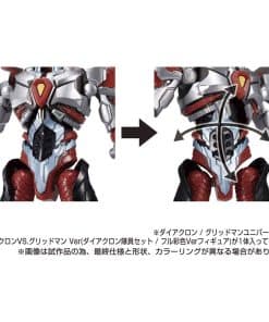 La colaboración entre Diaclone y Gridman Universe se ha logrado. Presentamos la segunda edición de la serie, Diacron Vs. Gridman Ver. (Conjunto de Equipo Diacron / Figura de Ver. de Pintura Completa). ¡Hyper Agent Gridman se ha realizado en el mundo Diacron! ¡Las cooperativas de súper etiquetas de una dimensión trascendente soñadora están liberadas para abrir el bloque! La historia original de «GRIDMAN UNIVERSE» «Diacron Vs. Gridman» ha sido lanzada comercialmente. Gridman: El recubrimiento plateado mejora la sensación de peso. Esta figura de acción tiene una altura total de aproximadamente 5.5 pulgadas (14 cm) con un mecanismo de movimiento de juntas incorporado que determina varias poses de acción. Se utiliza una construcción de refuerzo de resistencia de las articulaciones en la zona de la ingle donde se aplica la carga. Equipado con una característica famosa de sus artículos de diaclone, como el mecanismo de captación de luz que ilumina y alumbran los ojos, y el movimiento de los dedos. Incluye un gran arma de calibre de choque de truenos que separa el escudo y la espada como arma de mano. Fuerzas Diacron: El Equipo Diacron que apareció en la historia original de «GRIDMANUNIVERSE» «Diacron Vs. Gridman». El cuerpo con una altura total de aproximadamente 1.2 pulgadas (3 cm) está equipado con 10 juntas móviles para una variedad de poses de acción y se puede abordar a una máquina diacrónica ya lanzada. Los pequeños imanes incorporados en la parte inferior del pie le permiten estar de pie sobre una placa de acero u otros objetos. Contenido del set: unidad principal de Gridman (1), Espada de Trueno (1), Escudo de Trueno (1), Equipo Diaclone (1), Moto de Combate (1), Manual de Instrucciones (1), Folleto (1)